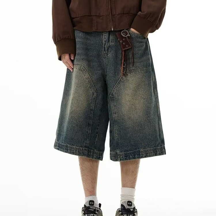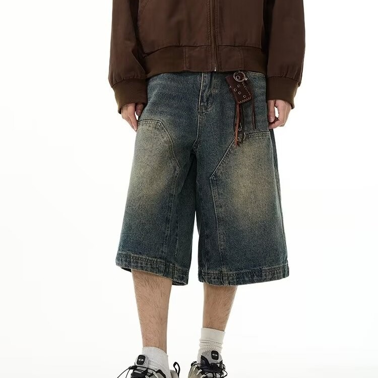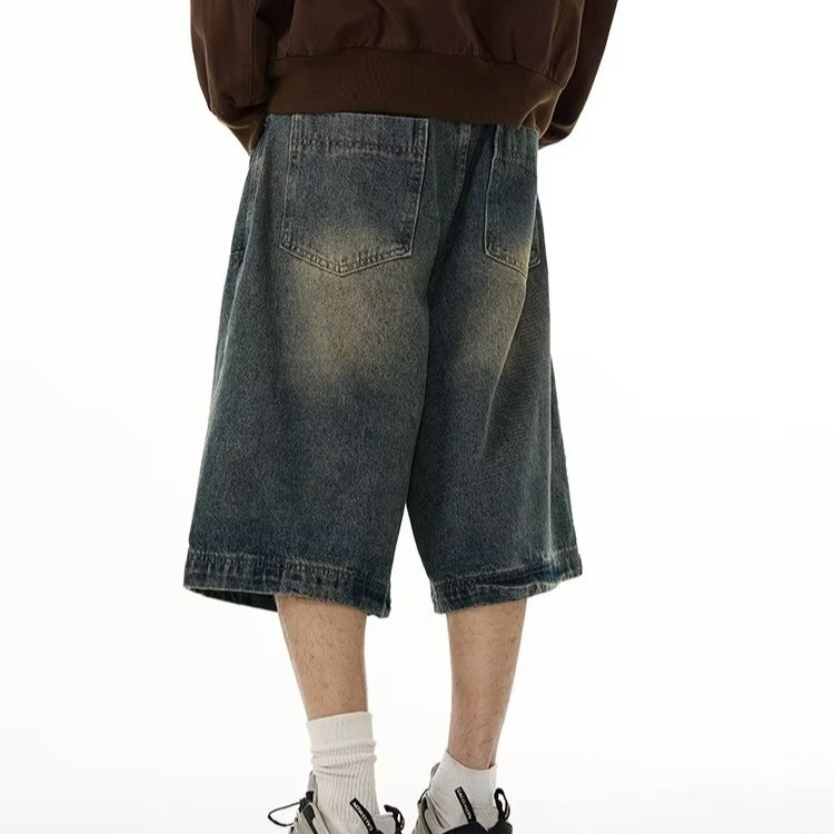 미국 스트리트 패션 브랜드 느슨한 오래된 세탁 데님 반바지 남성 중형 바지 남성용 간단한 기본 여름 5 점 바지스토어 가기