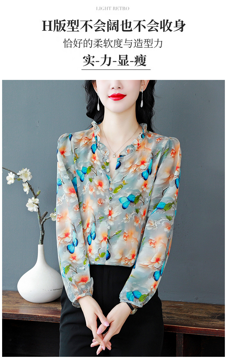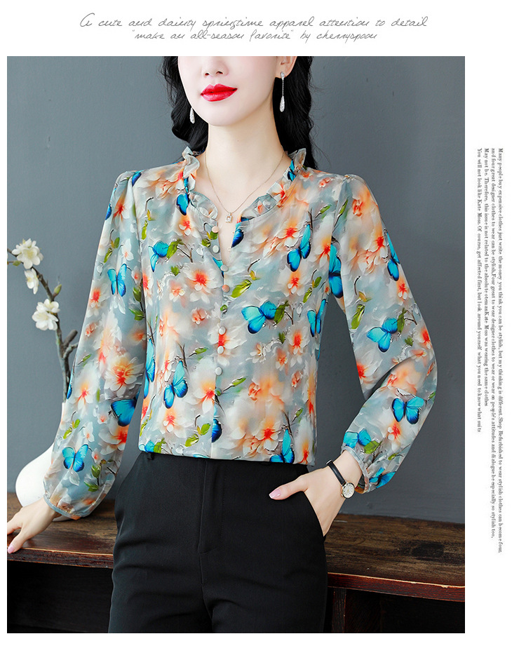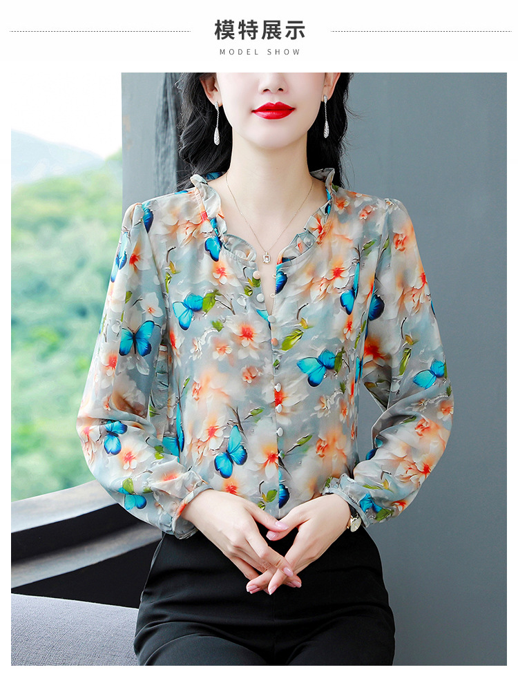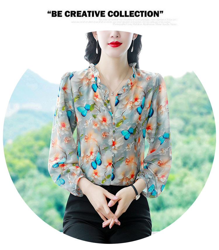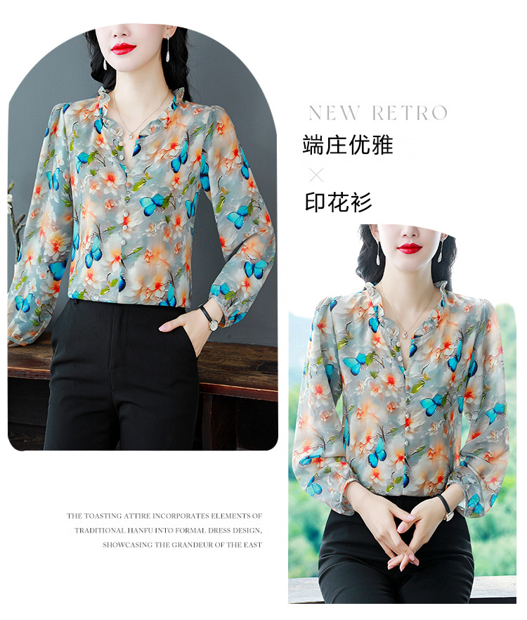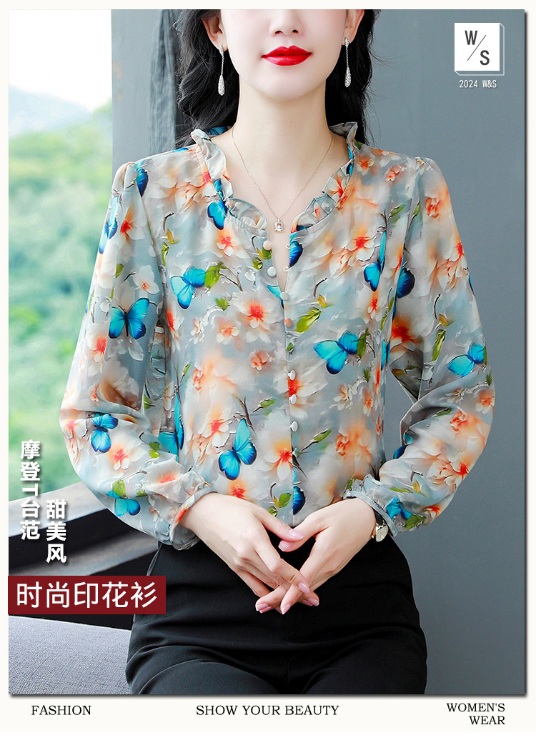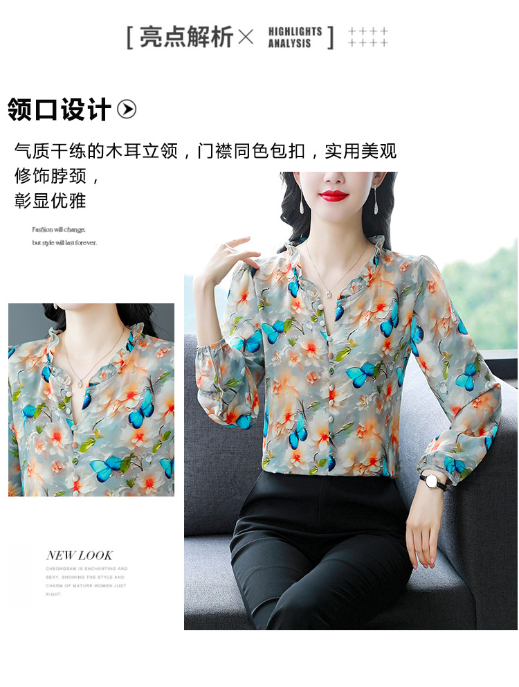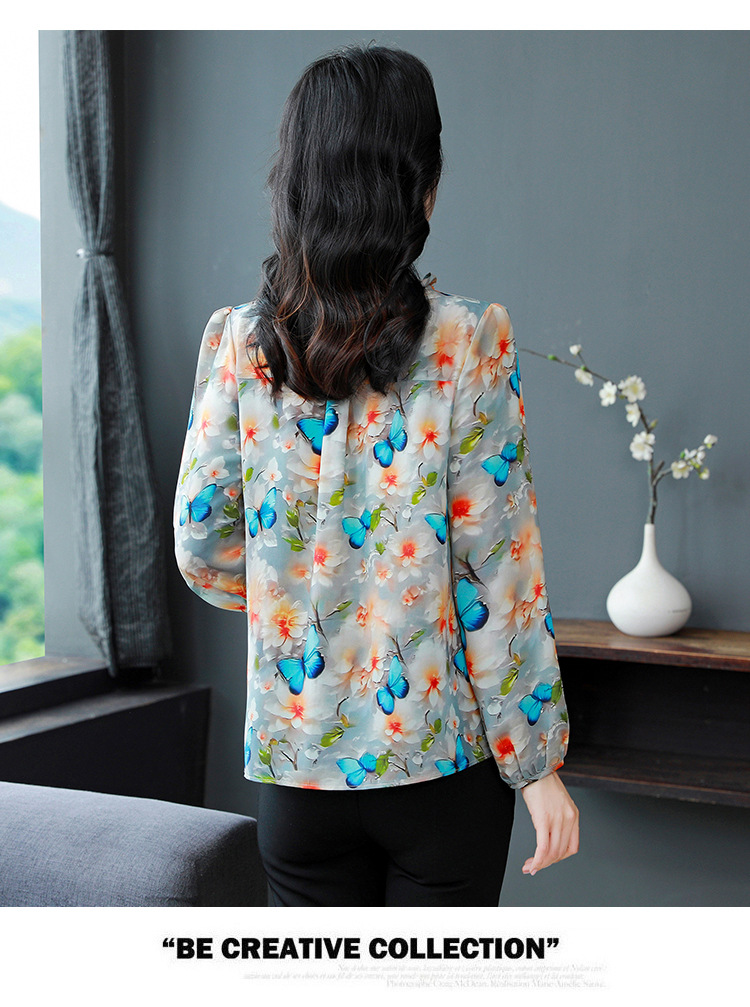 인쇄 된 누에 시폰 블라우스 여성의 톱 2024 여름 새로운 여성의 인쇄 된 우아한 슬리밍 셔츠 긴 소매 여성스토어 가기