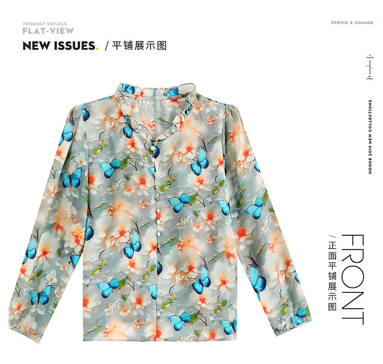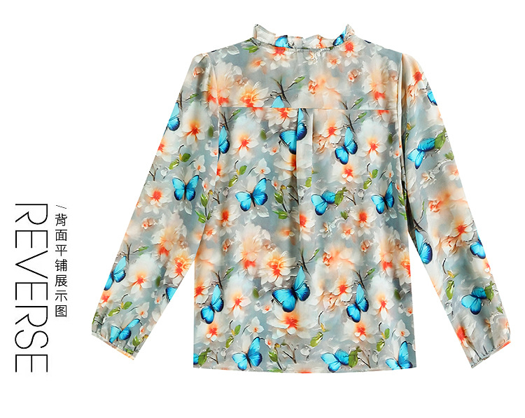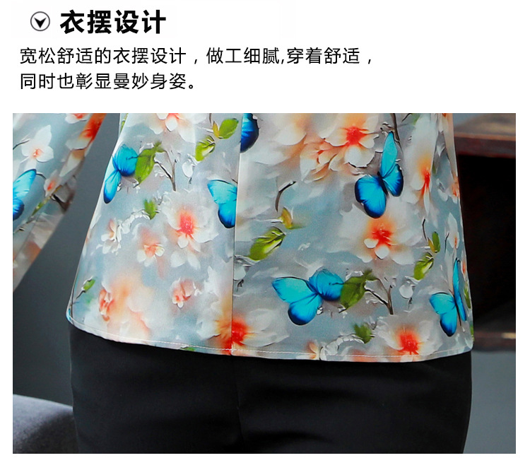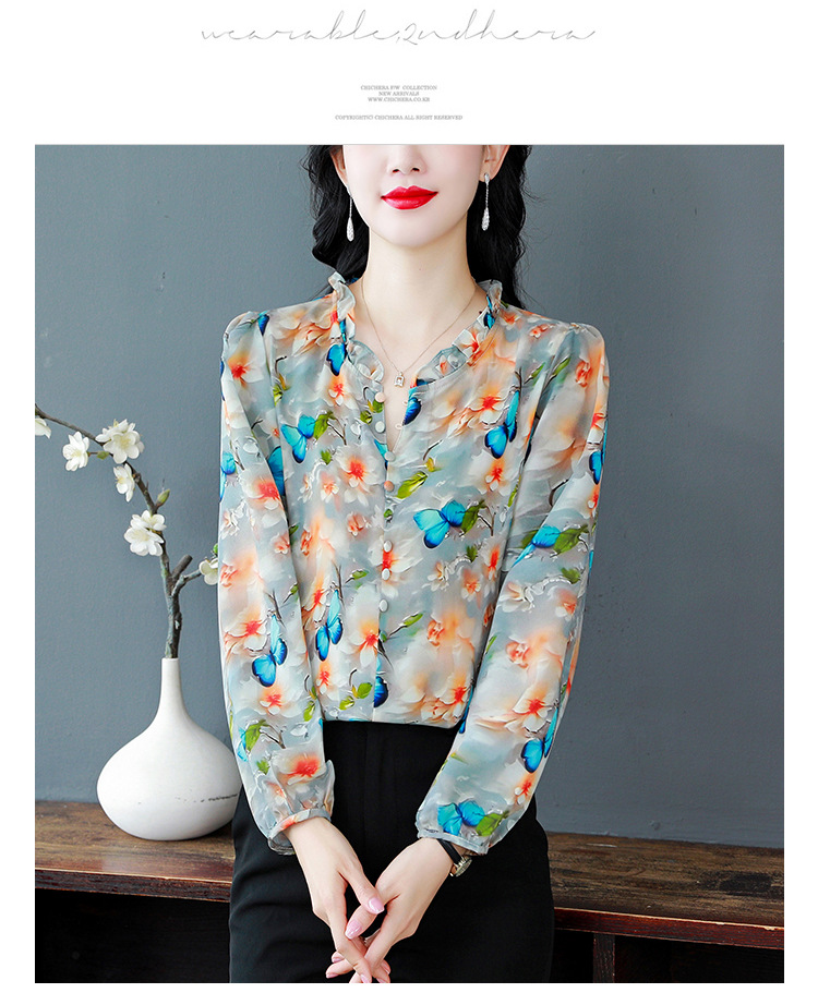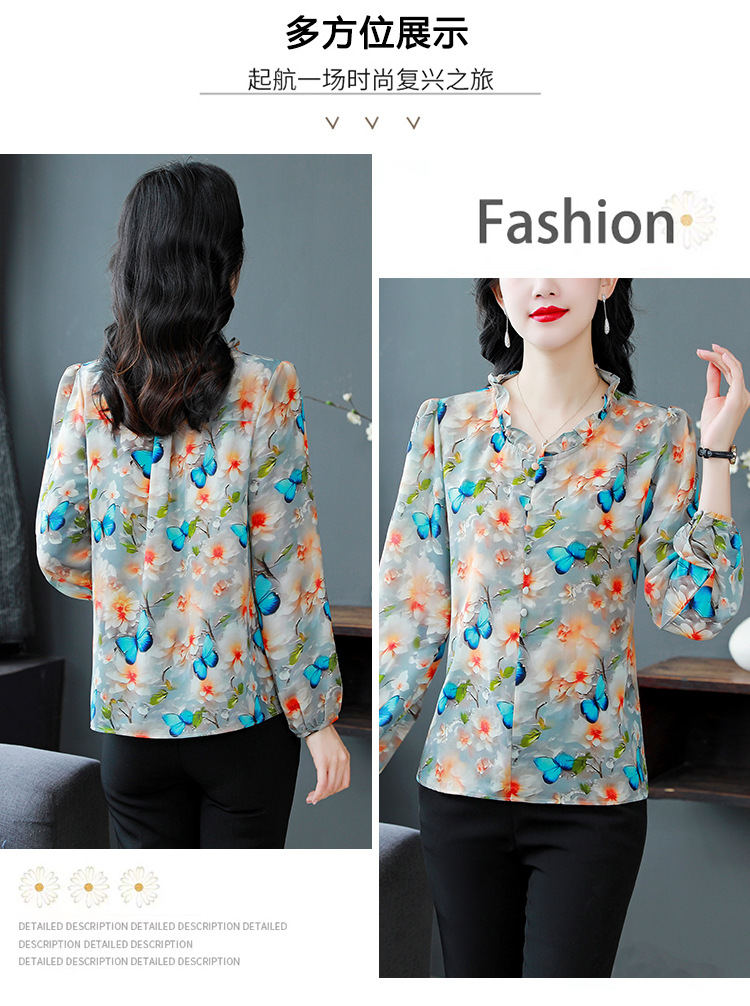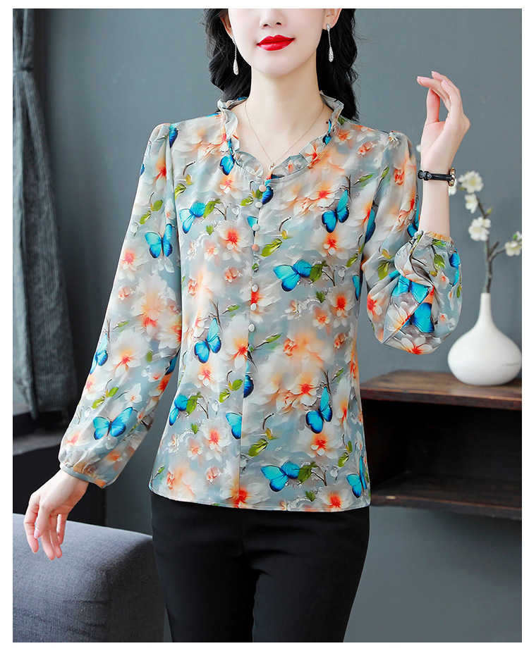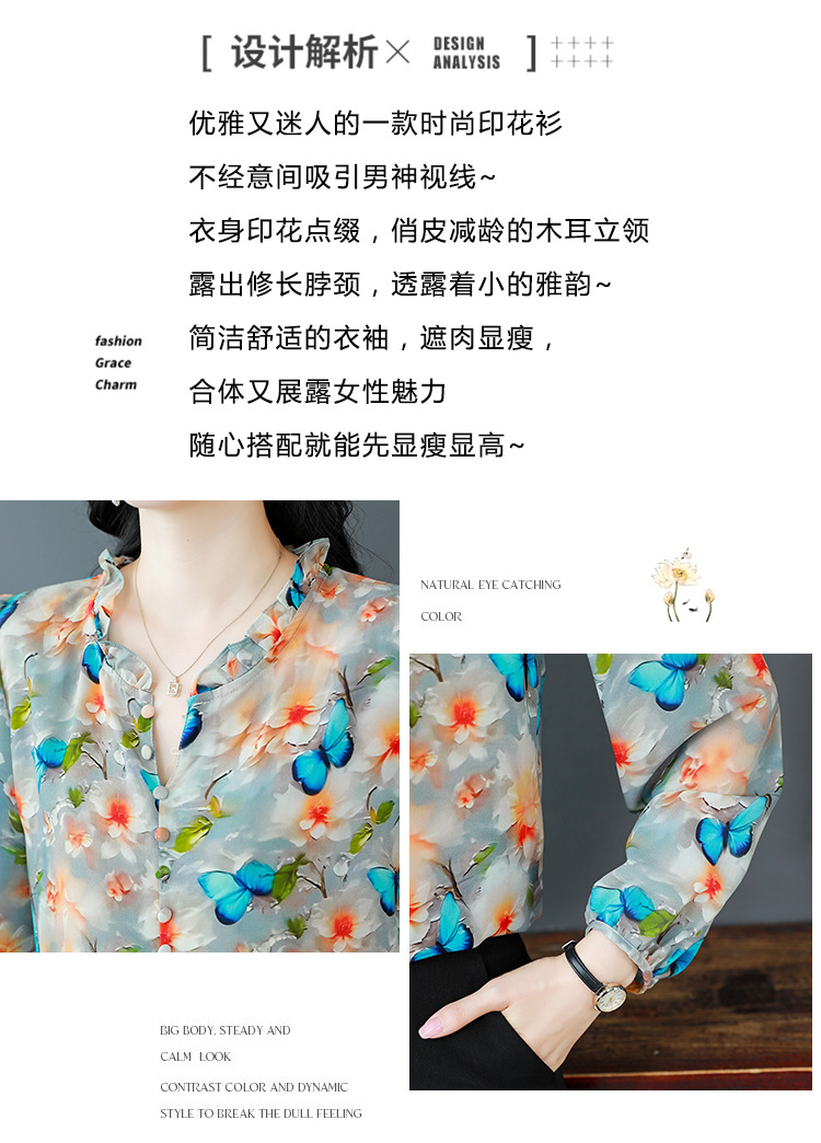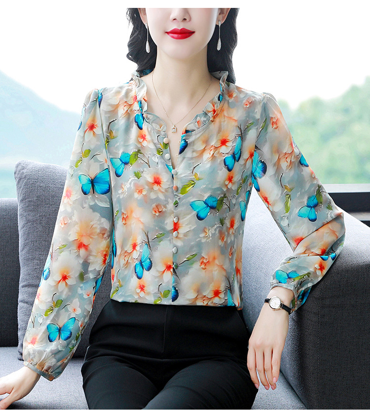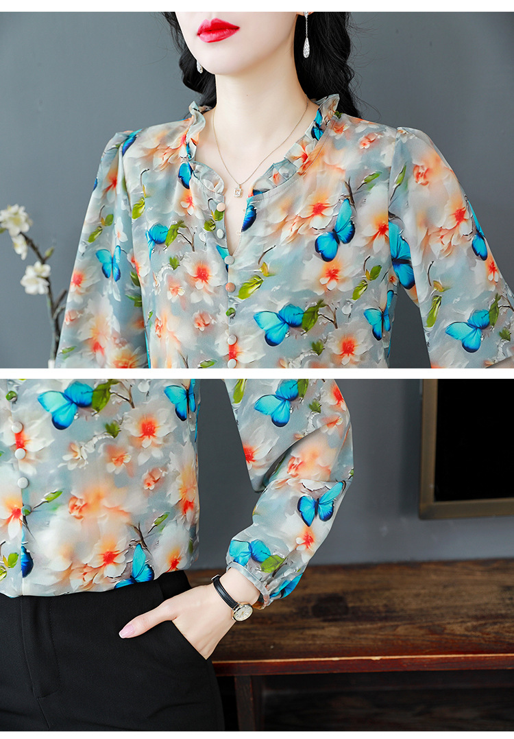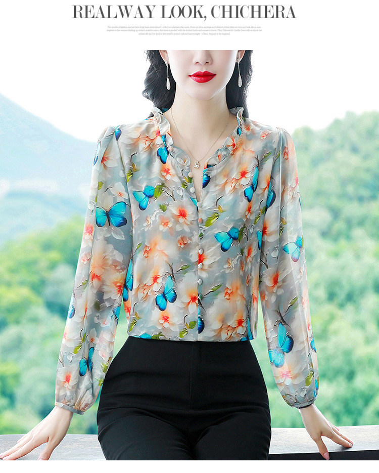 인쇄 된 누에 시폰 블라우스 여성의 톱 2024 여름 새로운 여성의 인쇄 된 우아한 슬리밍 셔츠 긴 소매 여성스토어 가기