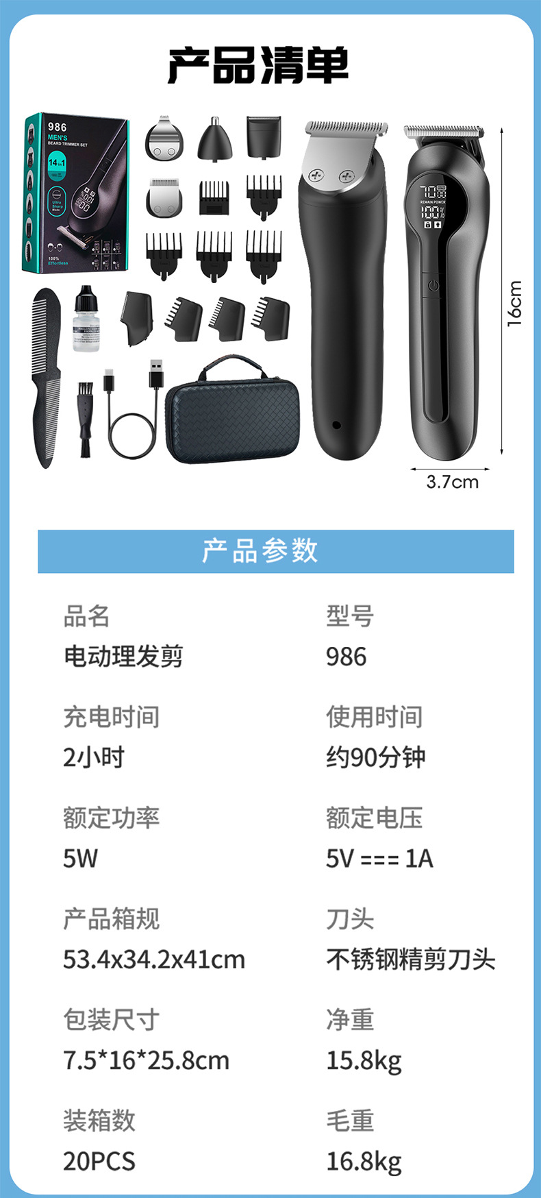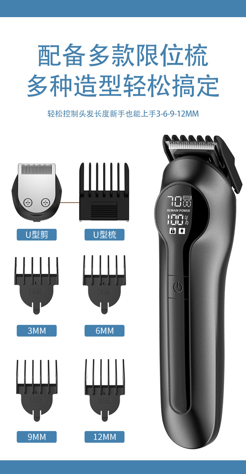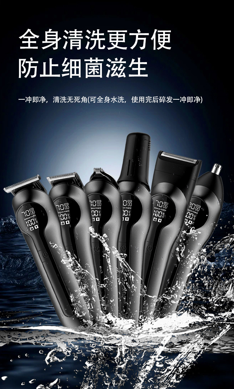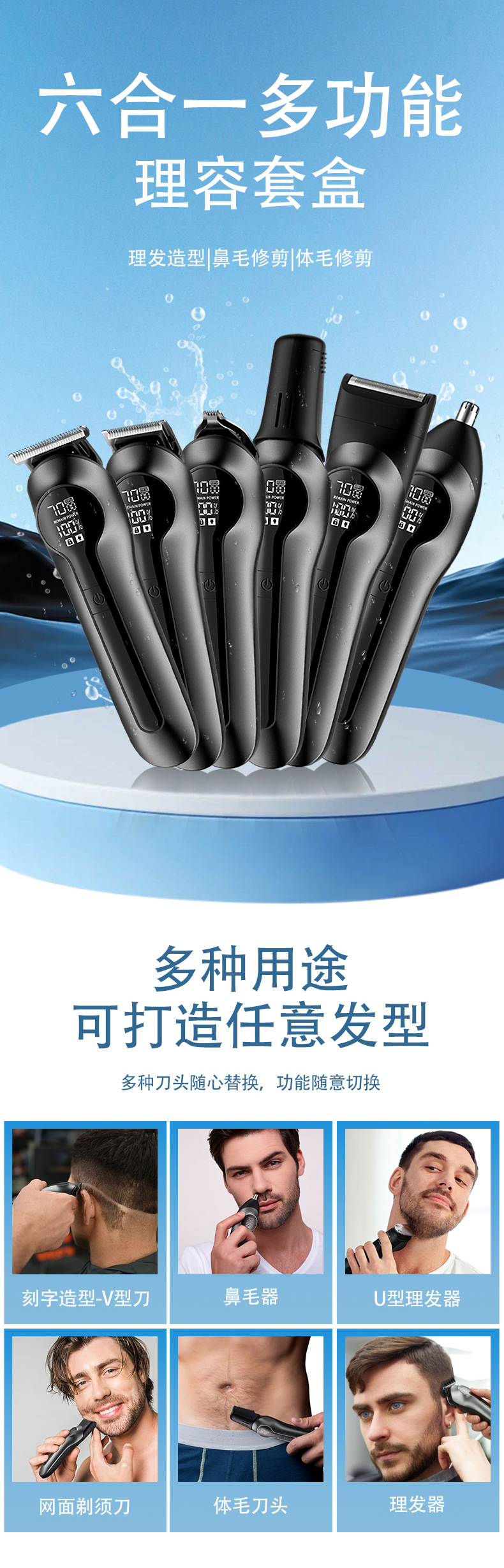 配件:机身+理发刀头+理发精修刀头+鬓角刀头+剃须刀头+鼻毛刀头+理发雕刻刀头+精修刀头限位梳*1+理发刀头限位梳*4(3.6.9.12mm)+鬓角限位梳*3+两头梳+USB充电线+清洁刷+3ml油瓶+收纳包