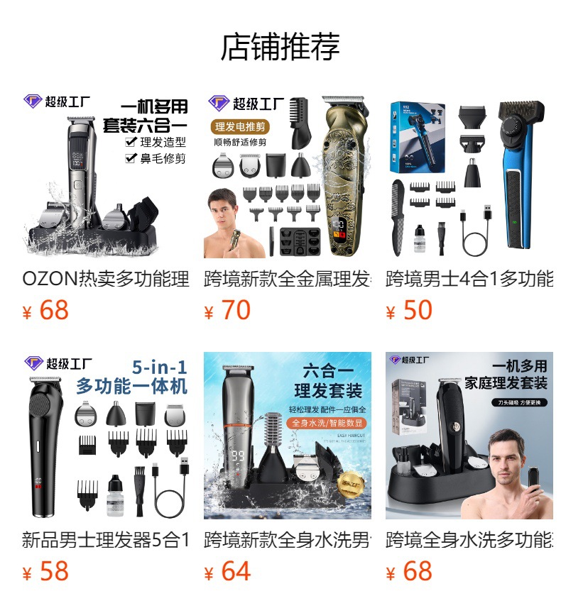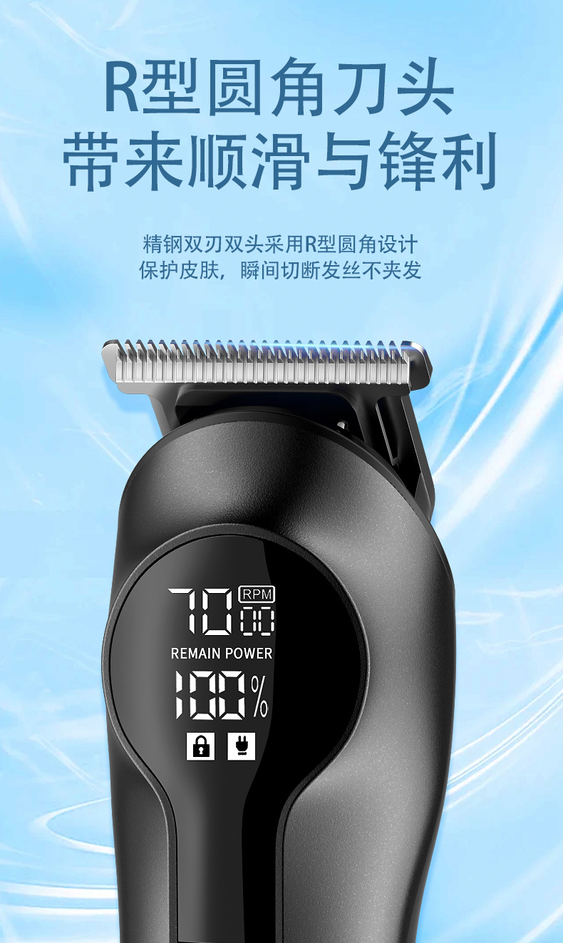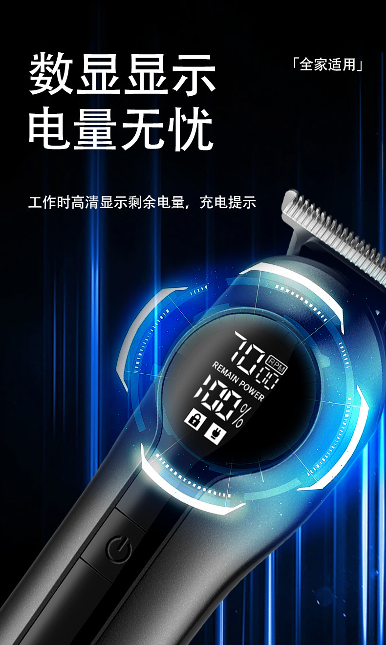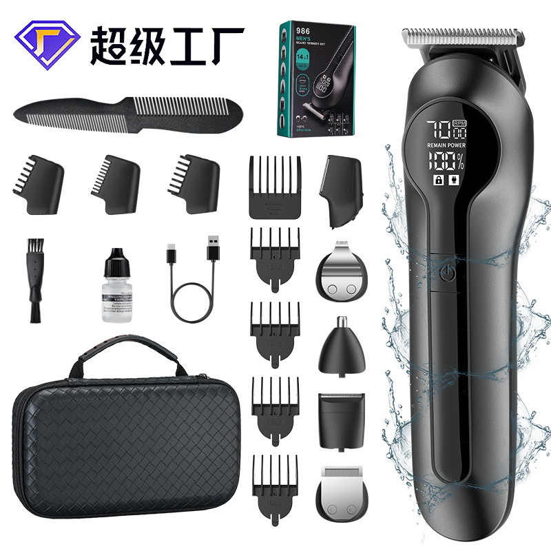 配件:机身+理发刀头+理发精修刀头+鬓角刀头+剃须刀头+鼻毛刀头+理发雕刻刀头+精修刀头限位梳*1+理发刀头限位梳*4(3.6.9.12mm)+鬓角限位梳*3+两头梳+USB充电线+清洁刷+3ml油瓶+收纳包