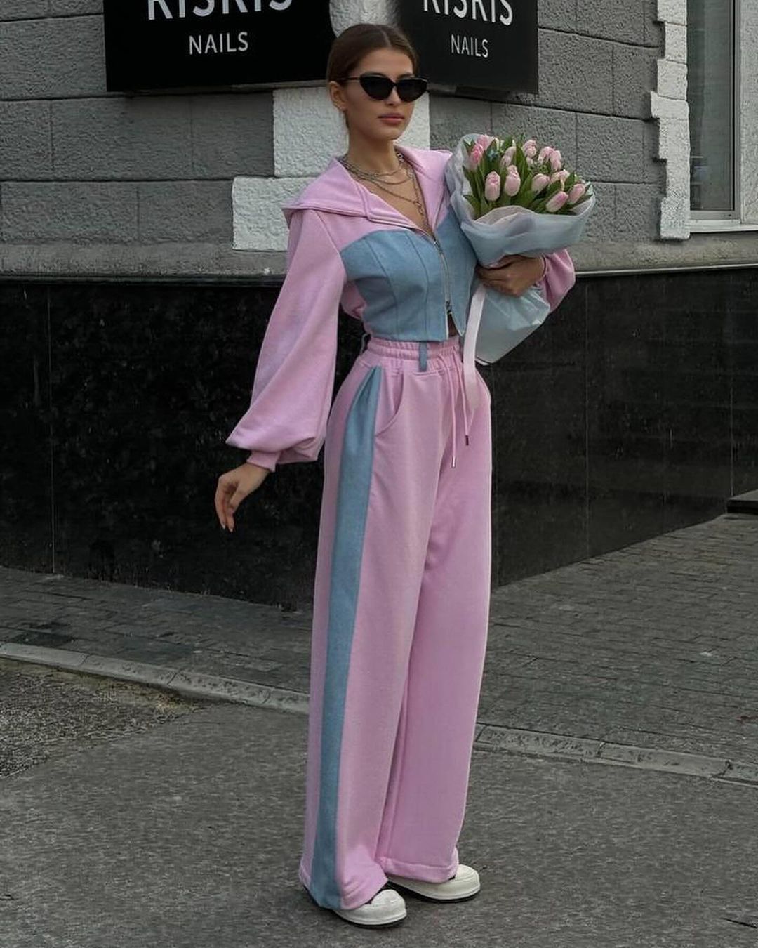 2025 크로스보더 유럽과 미국 스타일의 패션 캐주얼 스웨트 셔츠 정장 데님 스플 라이스 후드 탑과 바지 여성용 투피스 세트스토어 가기