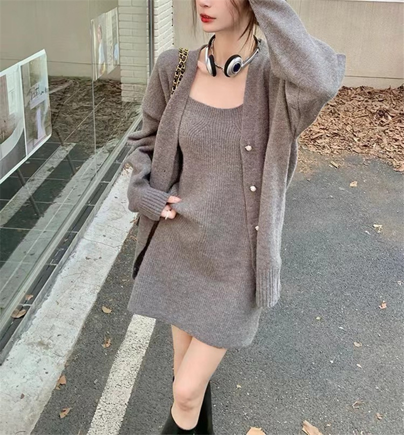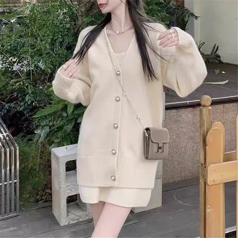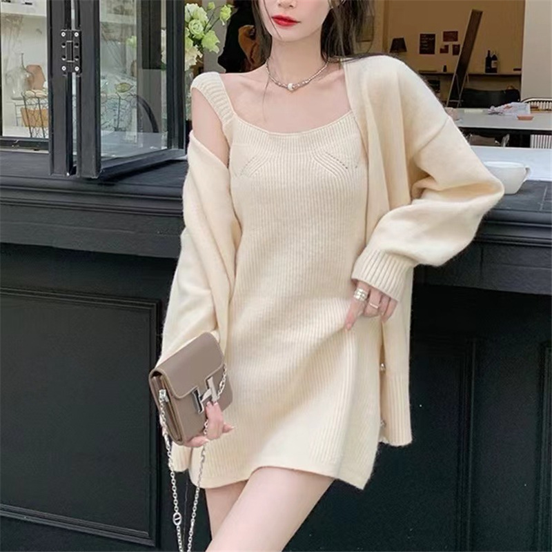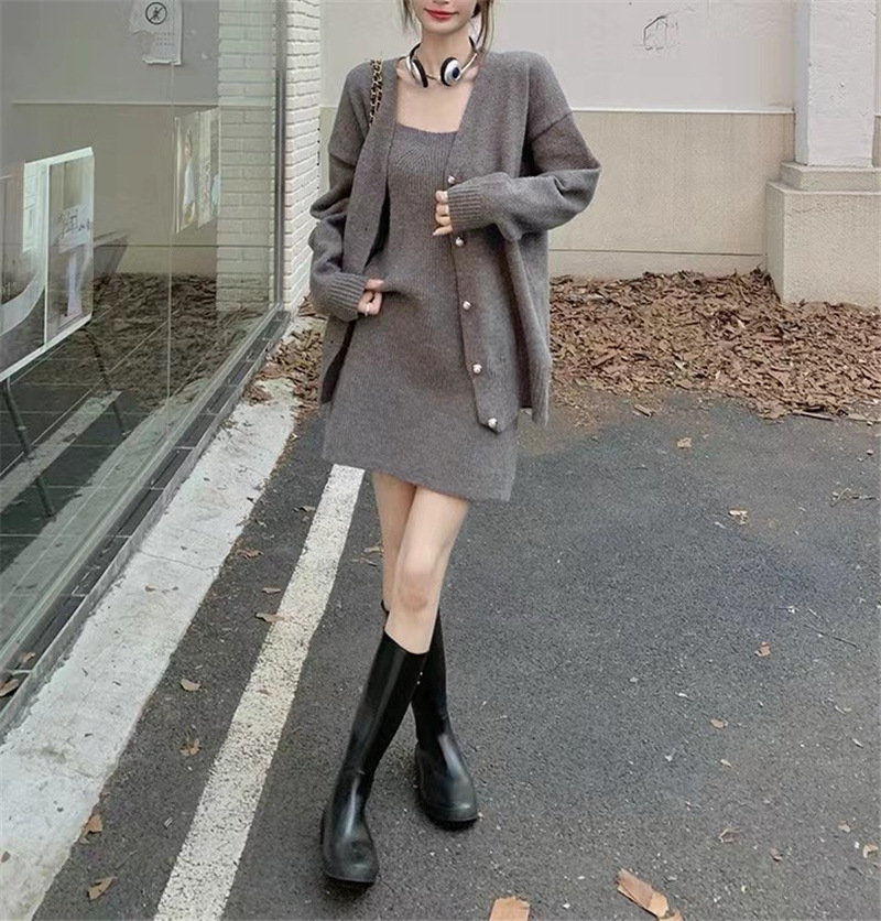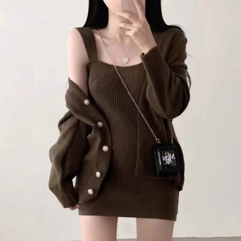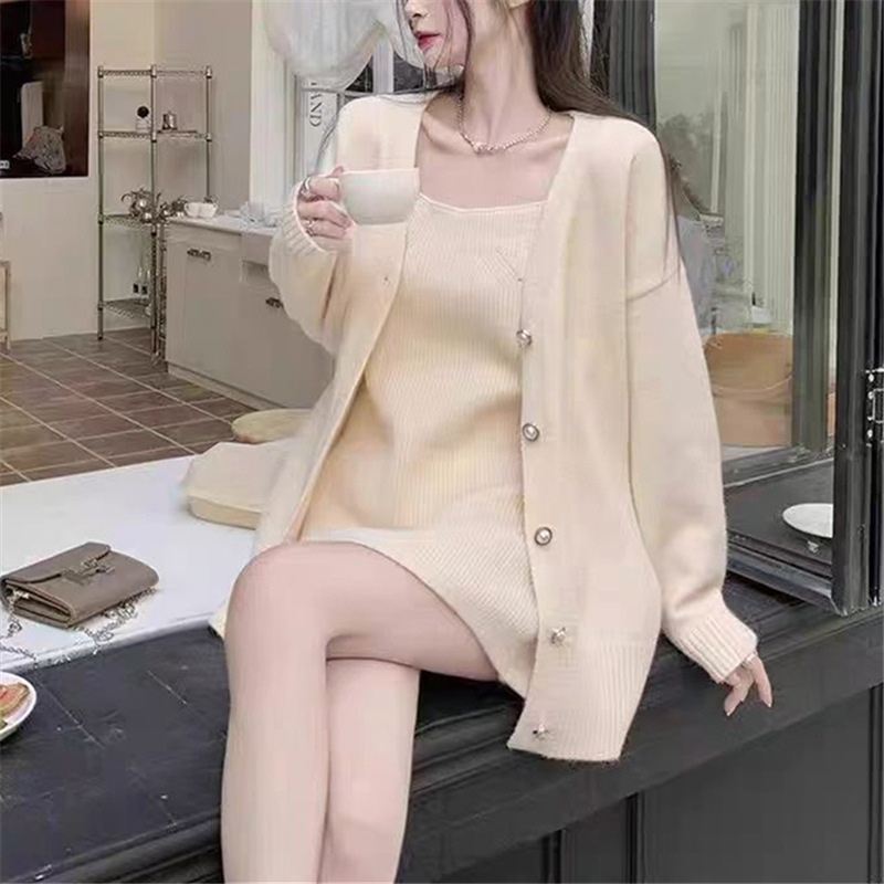 가을과 겨울 새로운 여성의 유능한 기질 작은 향기로운 스타일 하이 엔드 니트 카디건 서스펜더 원피스 투피스 세트