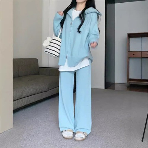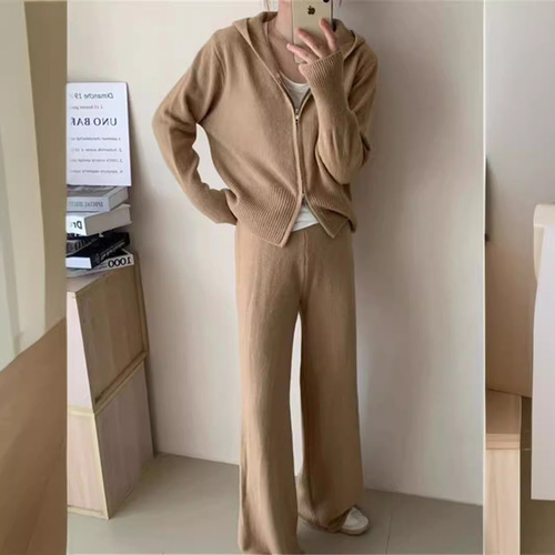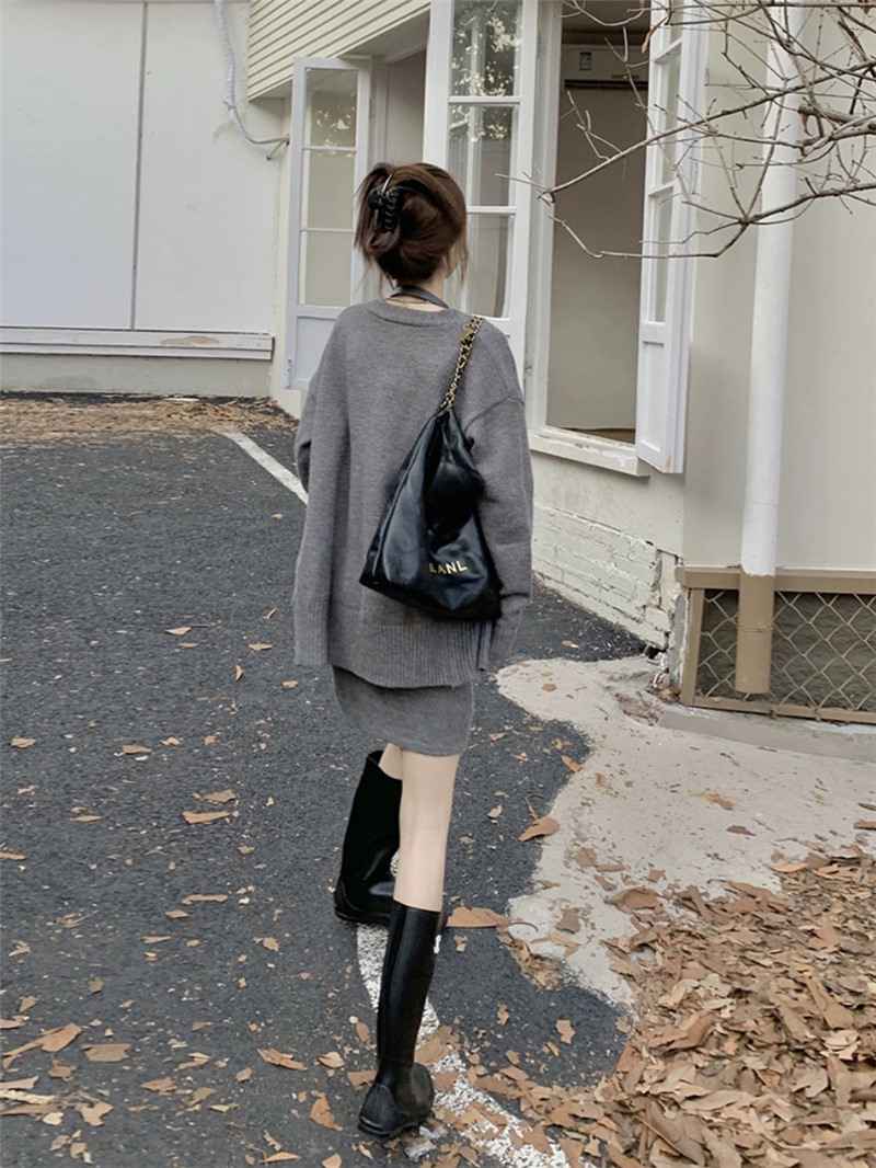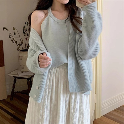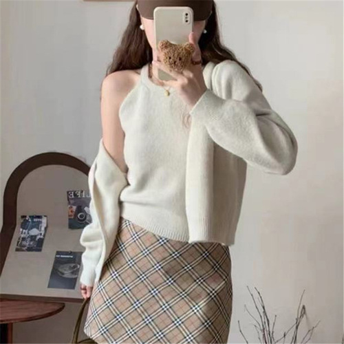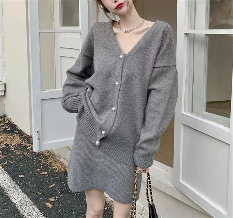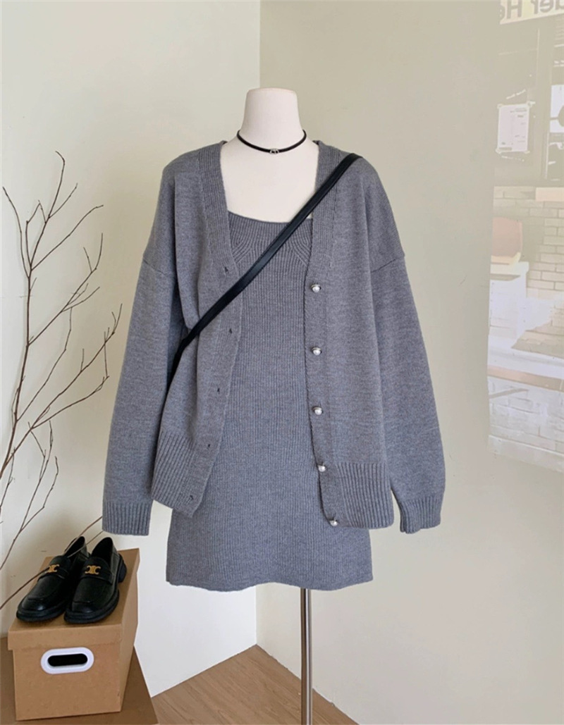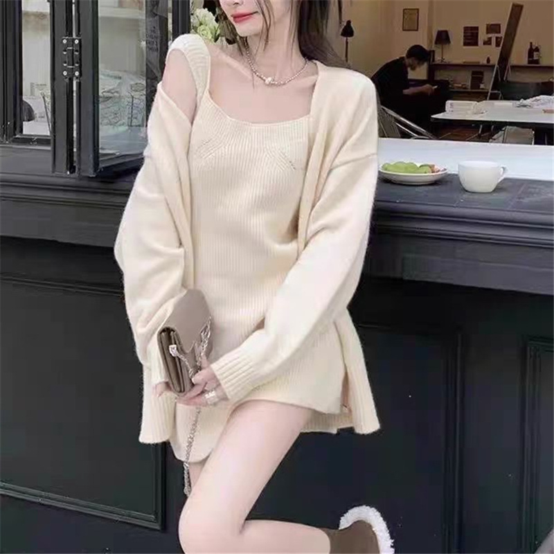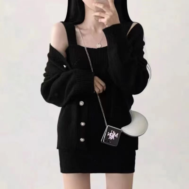 가을과 겨울 새로운 여성의 유능한 기질 작은 향기로운 스타일 하이 엔드 니트 카디건 서스펜더 원피스 투피스 세트