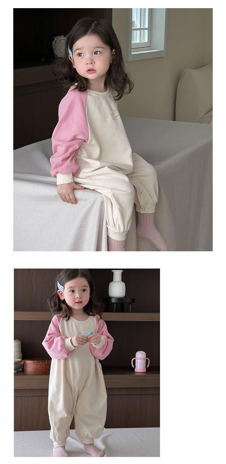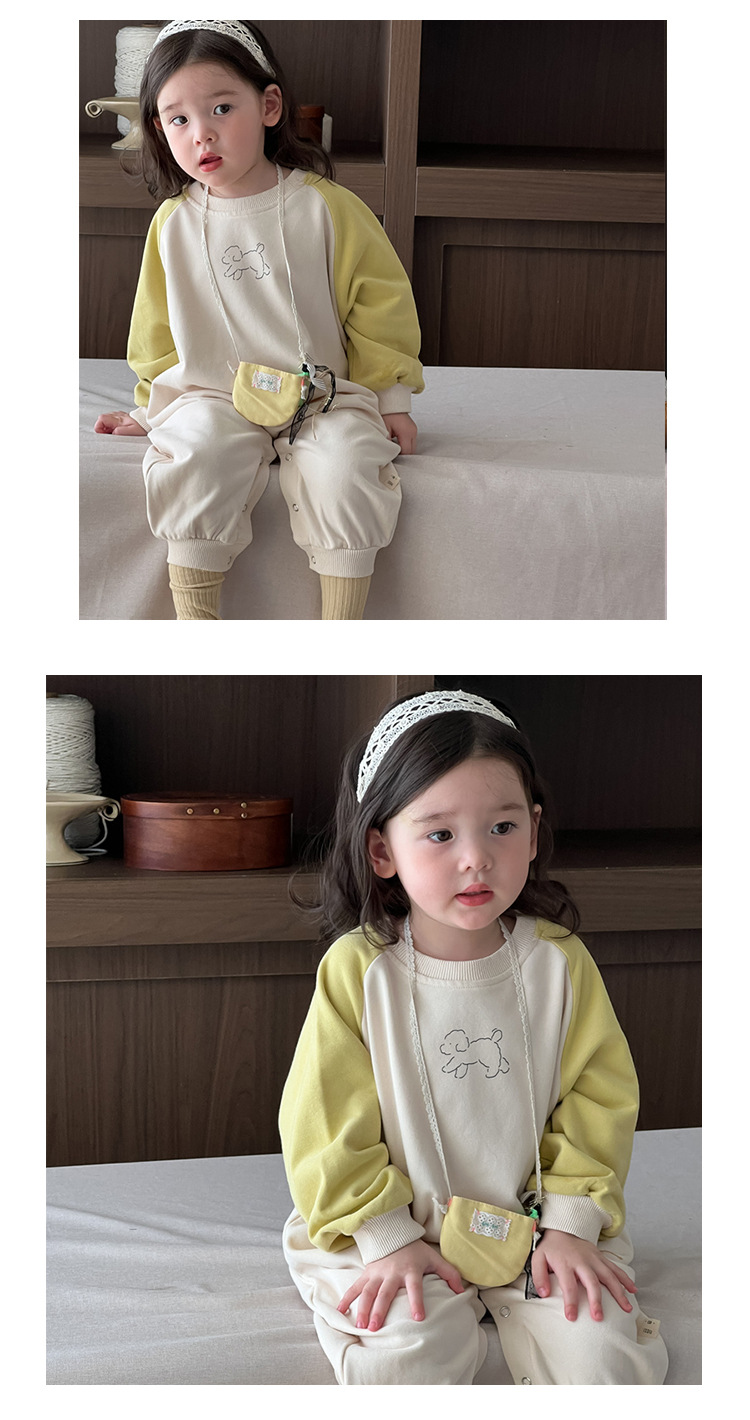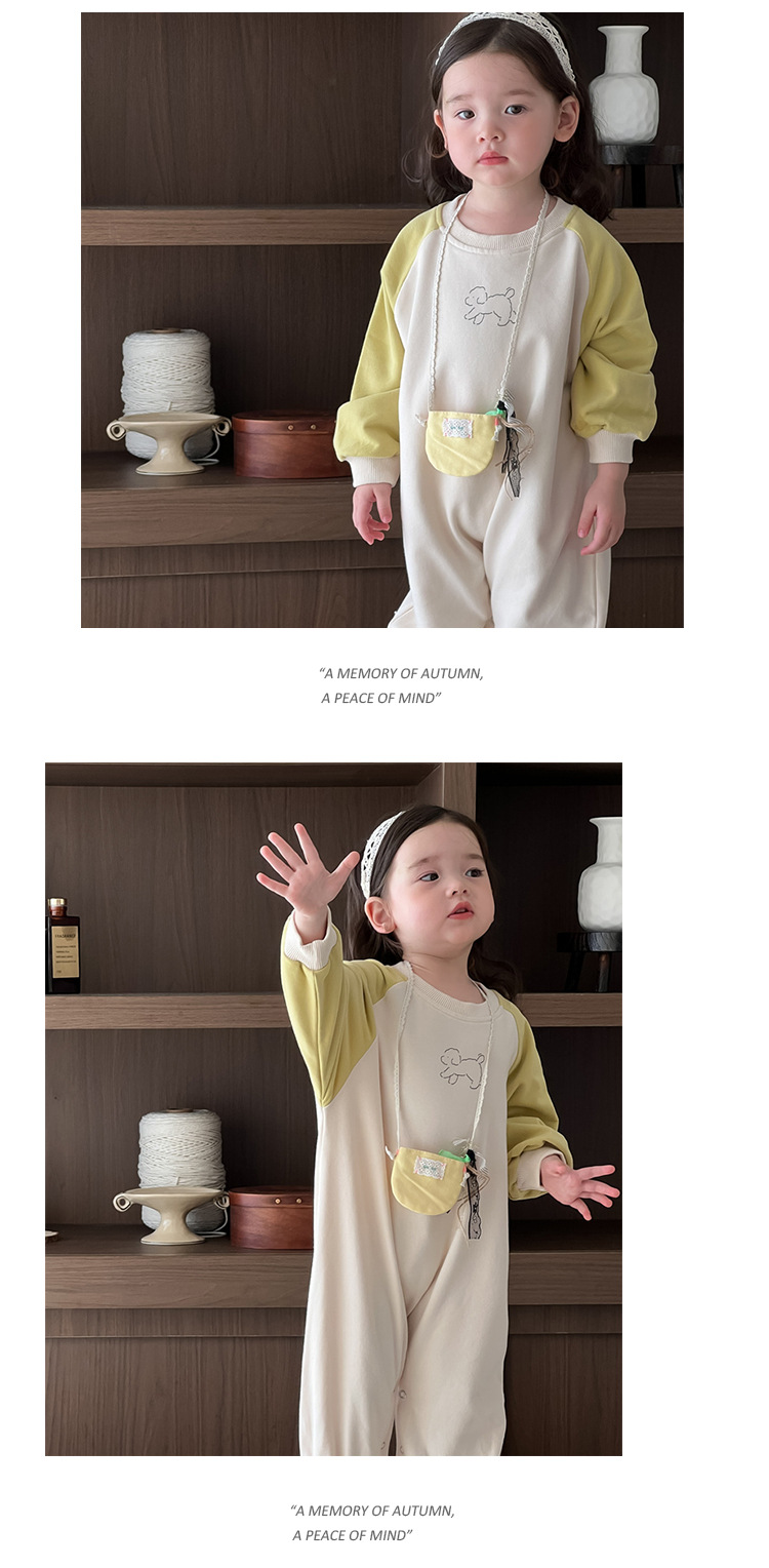 아기의 콘트라스트 컬러 점프 수트 가을 등반복 2024 가을 아기 가을 착용 한국 스타일 아동복 소녀의 컬러 매칭 가방 방귀 옷