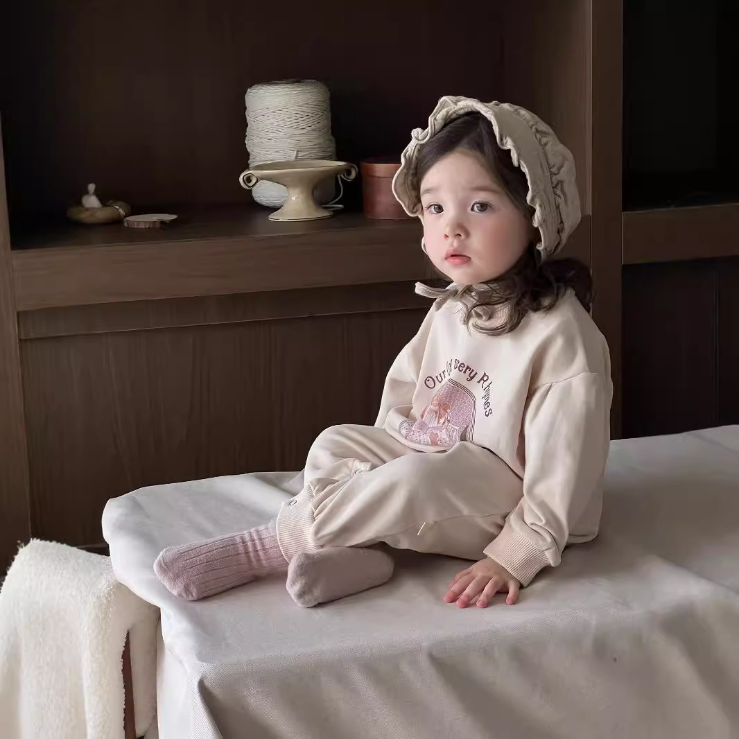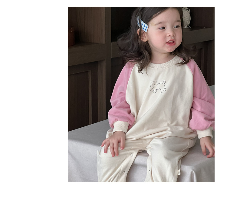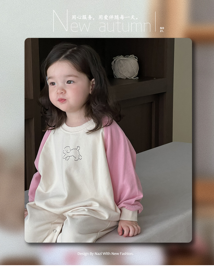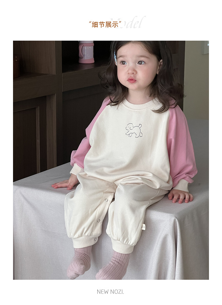 아기의 콘트라스트 컬러 점프 수트 가을 등반복 2024 가을 아기 가을 착용 한국 스타일 아동복 소녀의 컬러 매칭 가방 방귀 옷