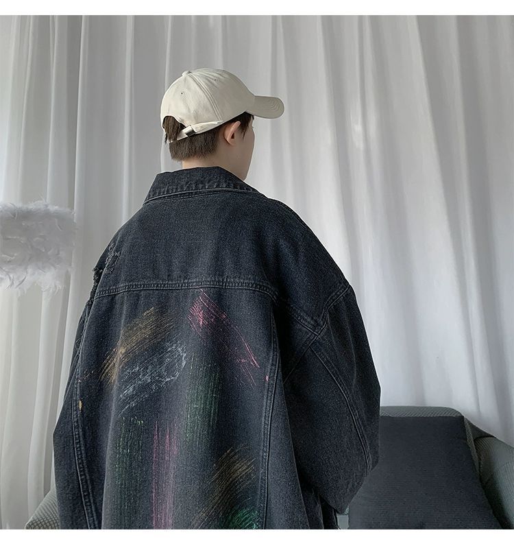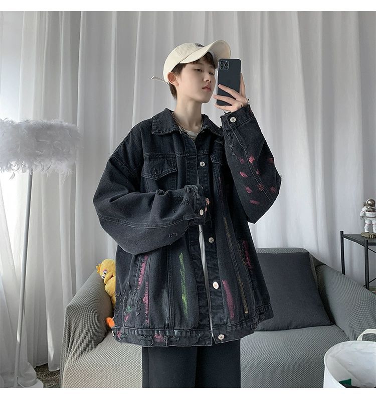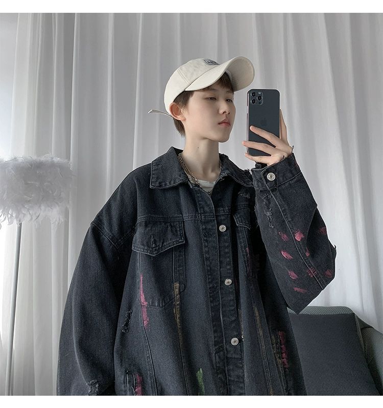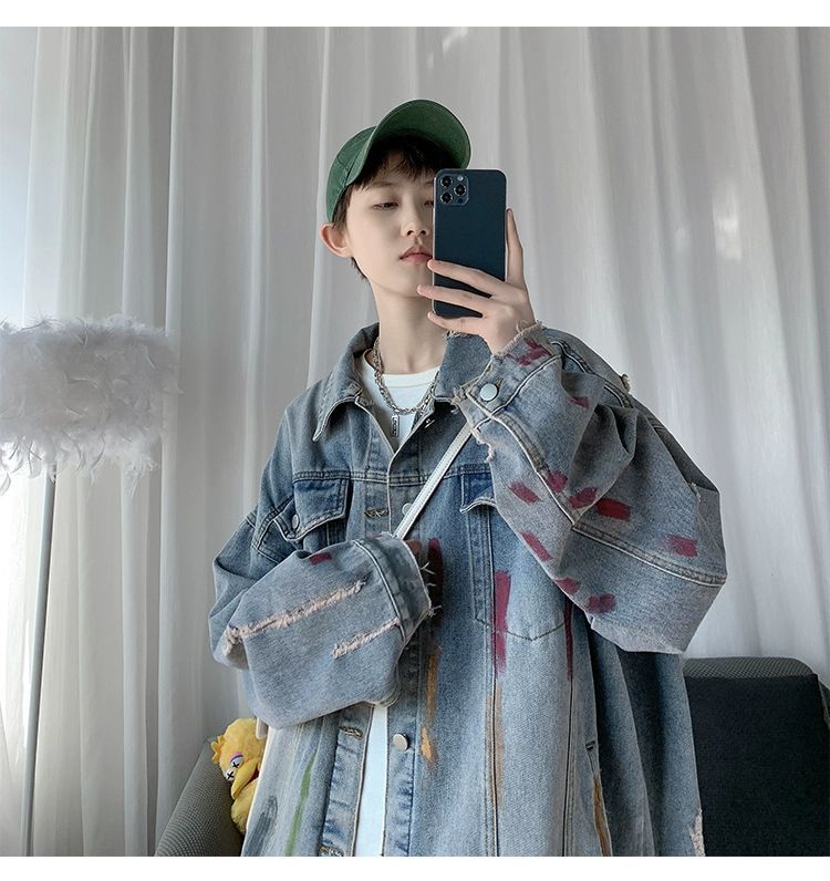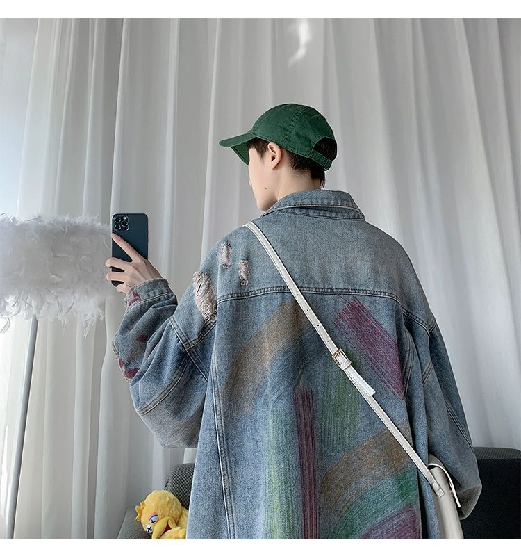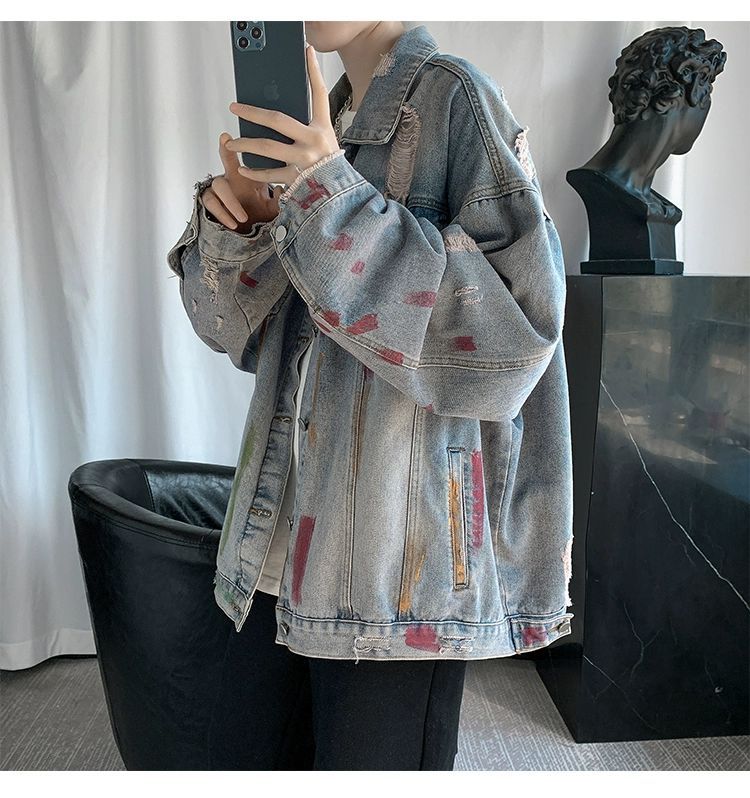 찢어진 데님 재킷 남자 봄 유행 브랜드 인 홍콩 스타일 하이 엔드 의류 봄과 가을 트렌디 루즈 캐주얼 자켓스토어 가기