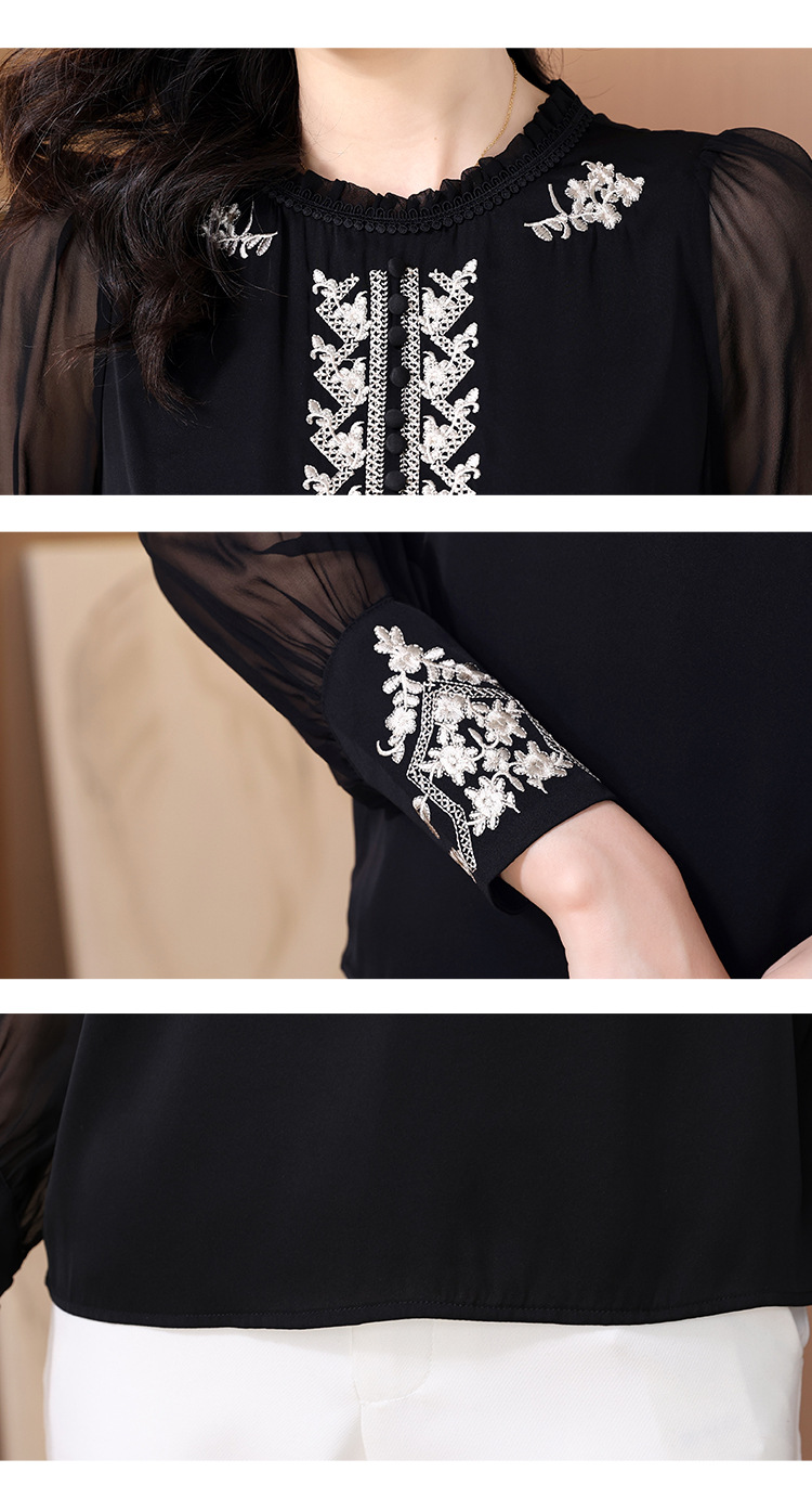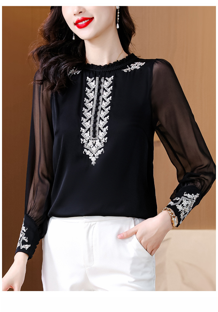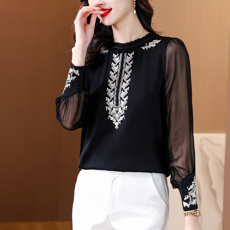 실제 촬영 셔츠 여성용 봄 신상품 러플 칼라 긴팔 고급 자수 상의
