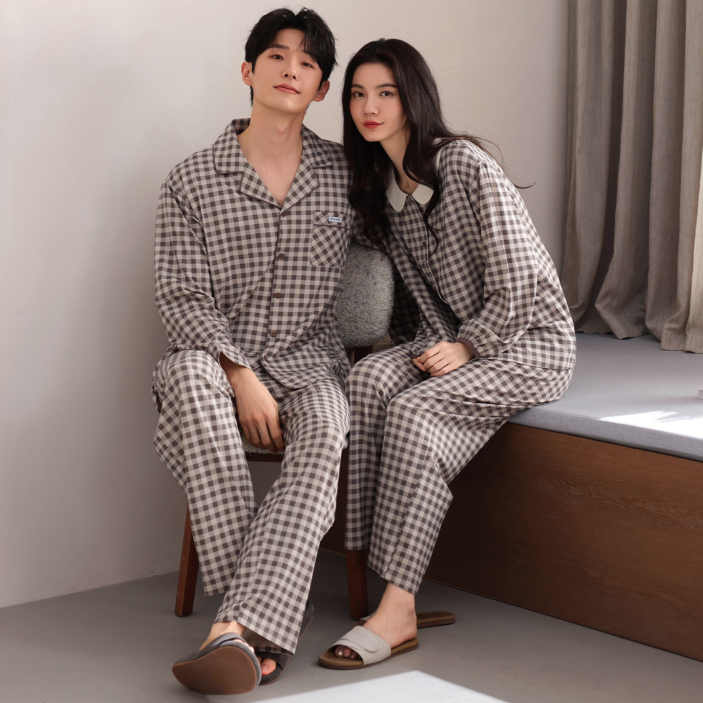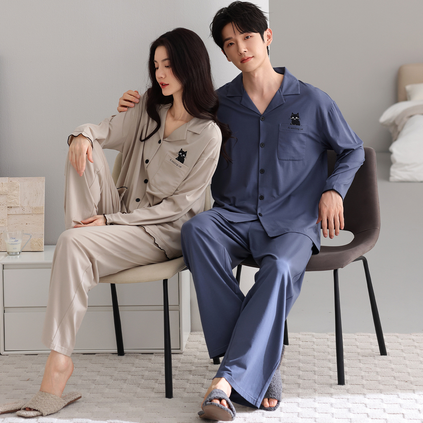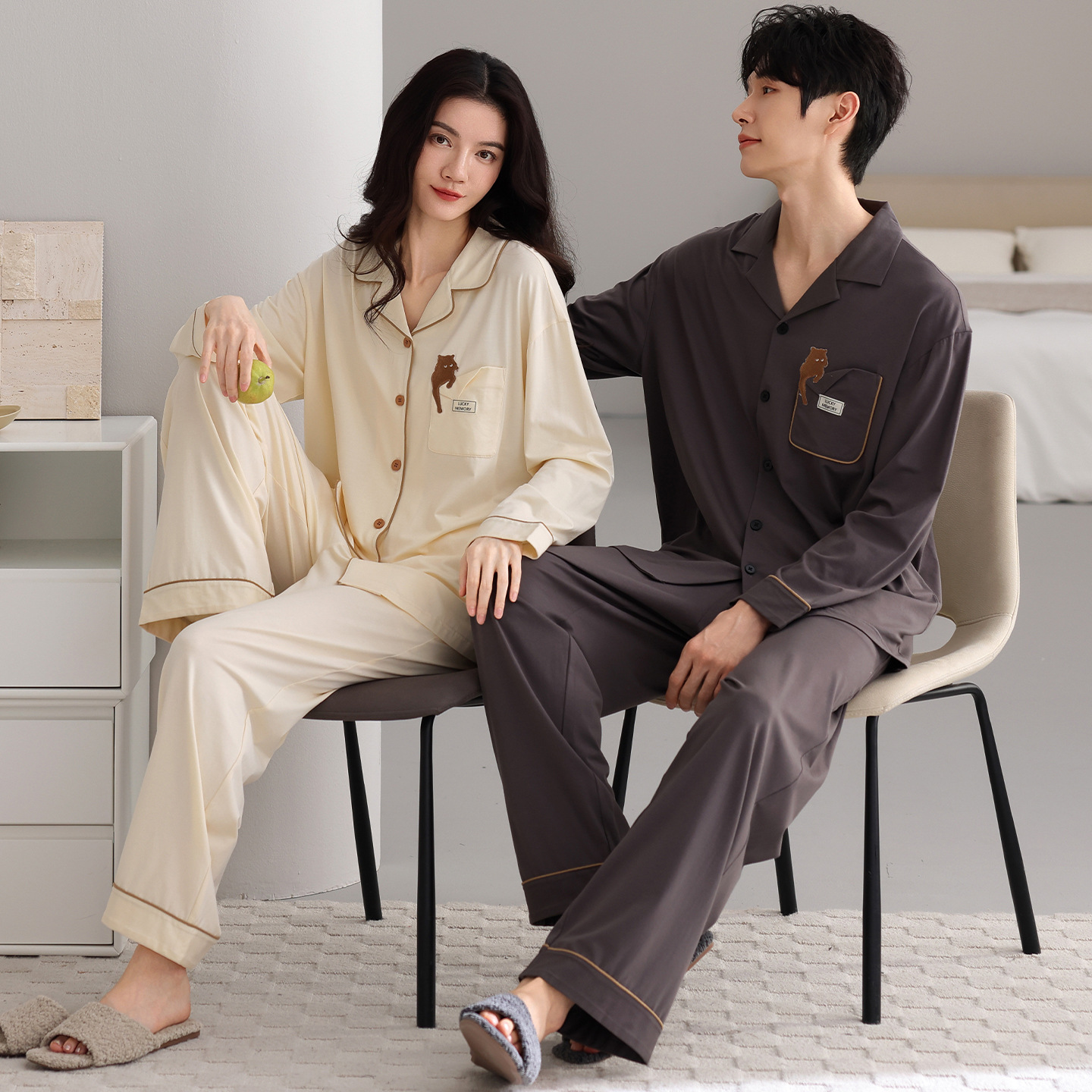 2025 새로운 커플 잠옷 봄과 가을 순수 코튼 캐주얼 홈웨어 옷깃 긴 소매 라이트 럭셔리 스타일 코튼 투피스 세트스토어 가기