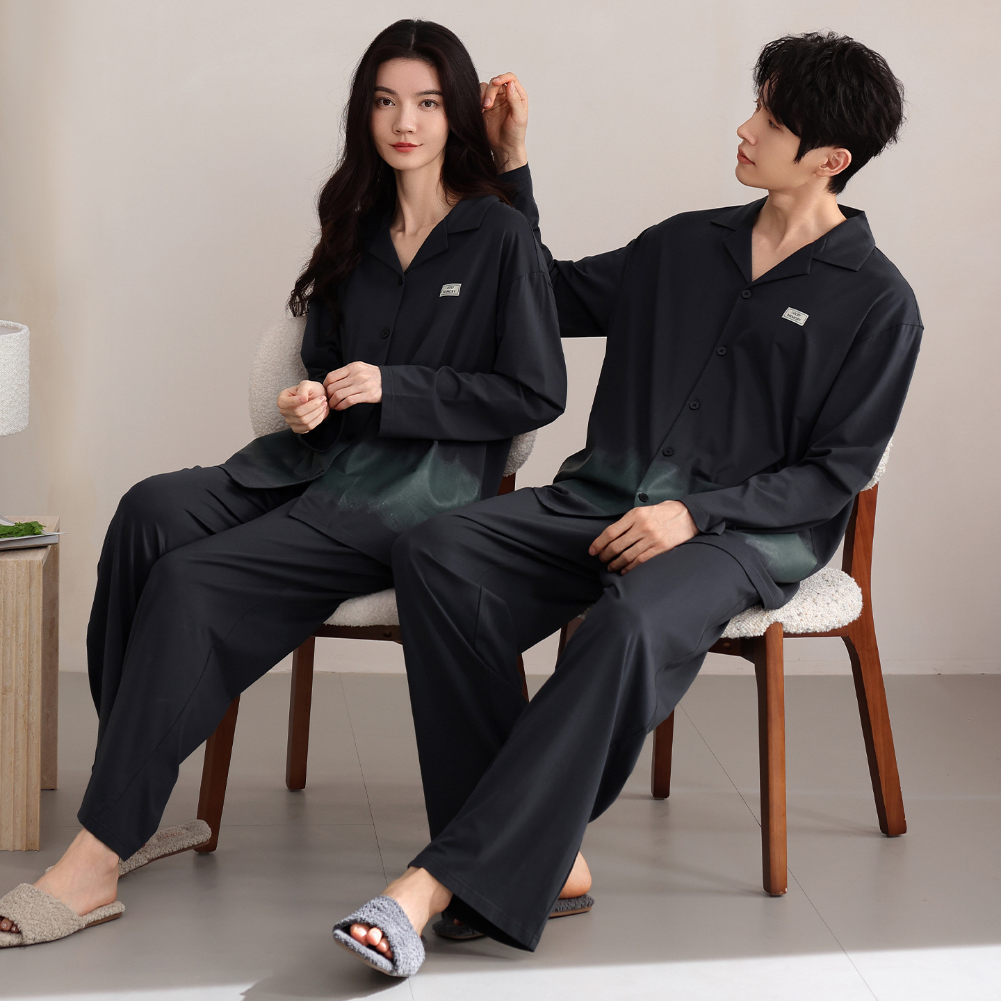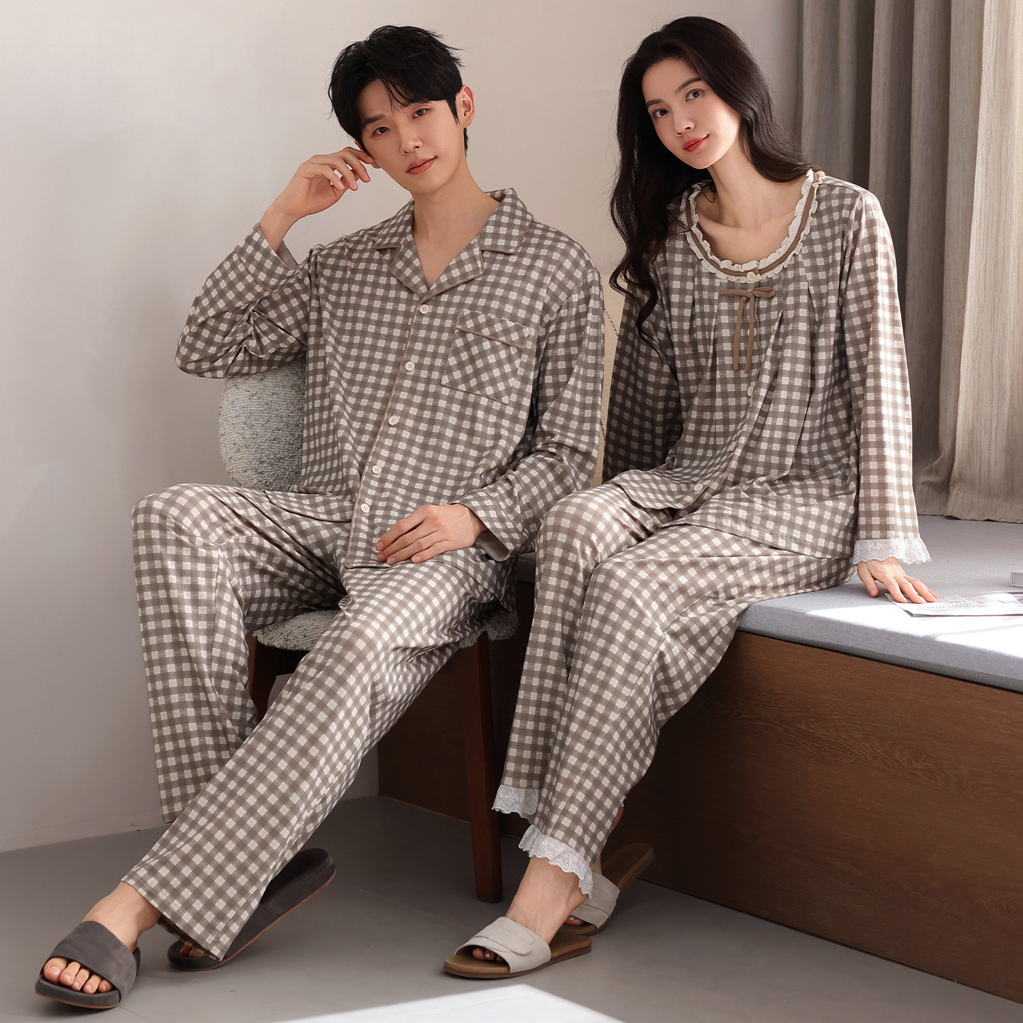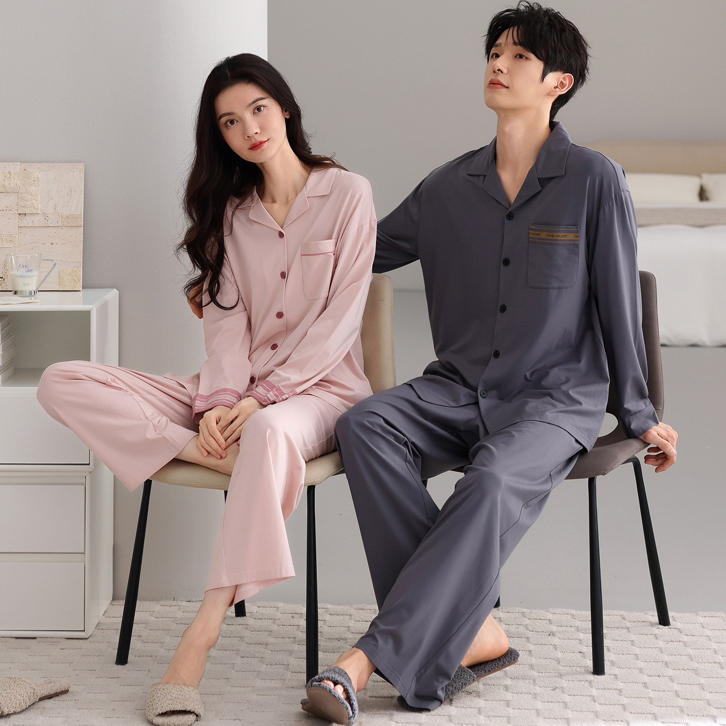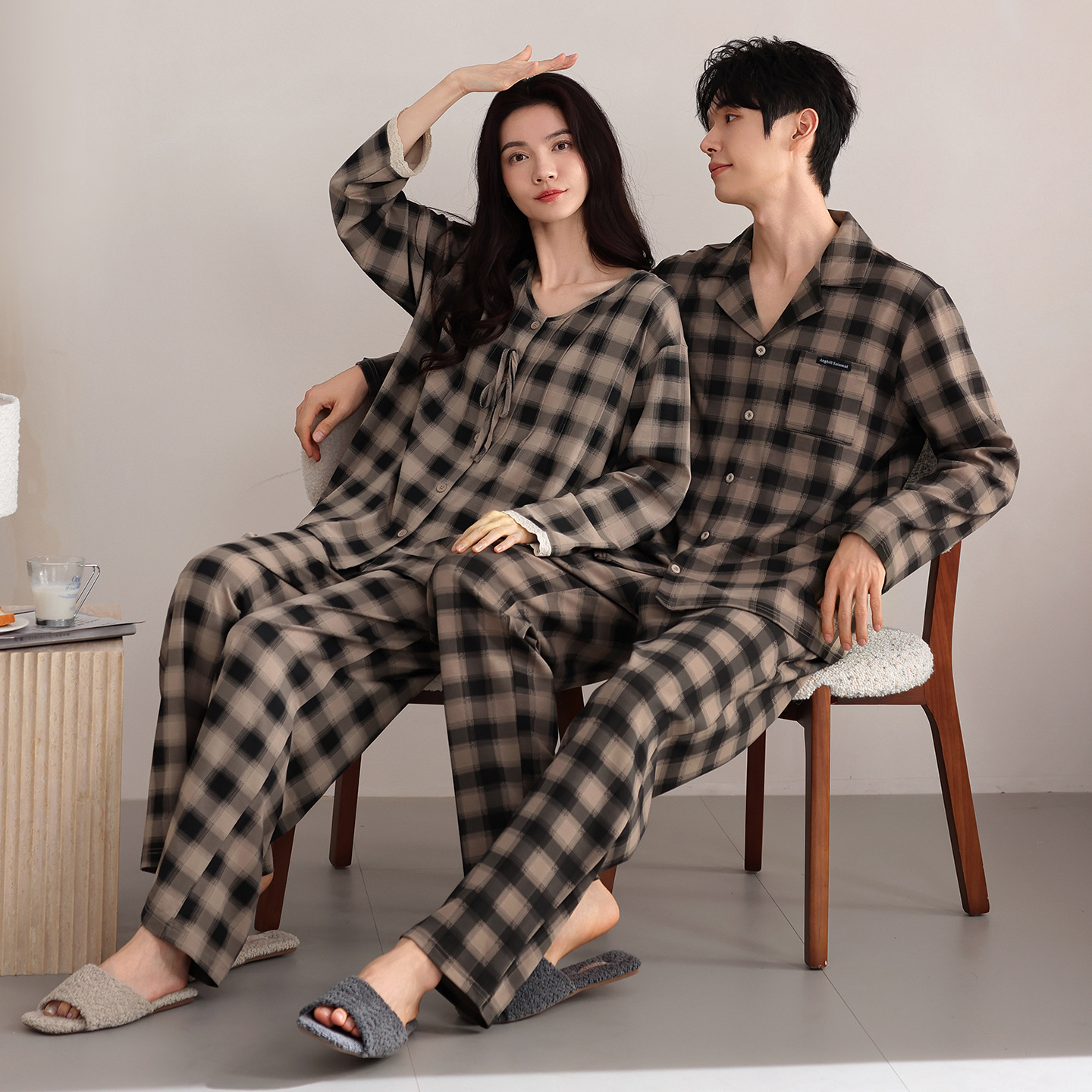 2025 새로운 커플 잠옷 봄과 가을 순수 코튼 캐주얼 홈웨어 옷깃 긴 소매 라이트 럭셔리 스타일 코튼 투피스 세트스토어 가기