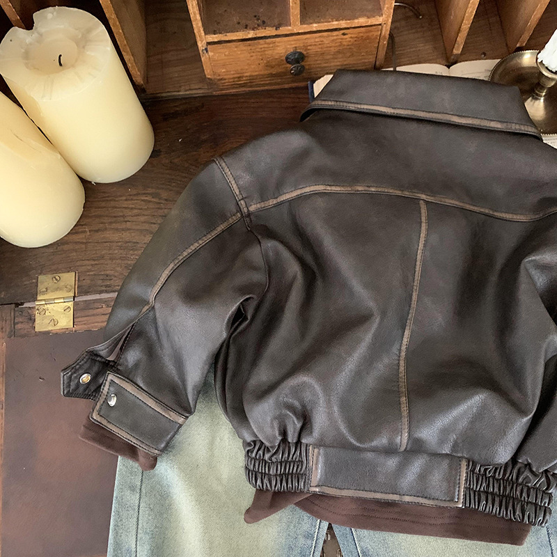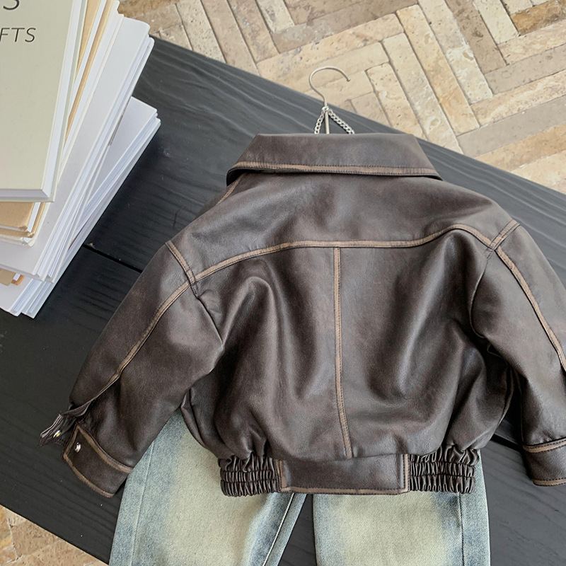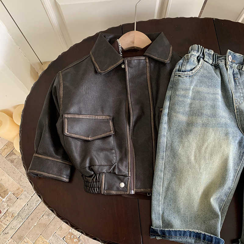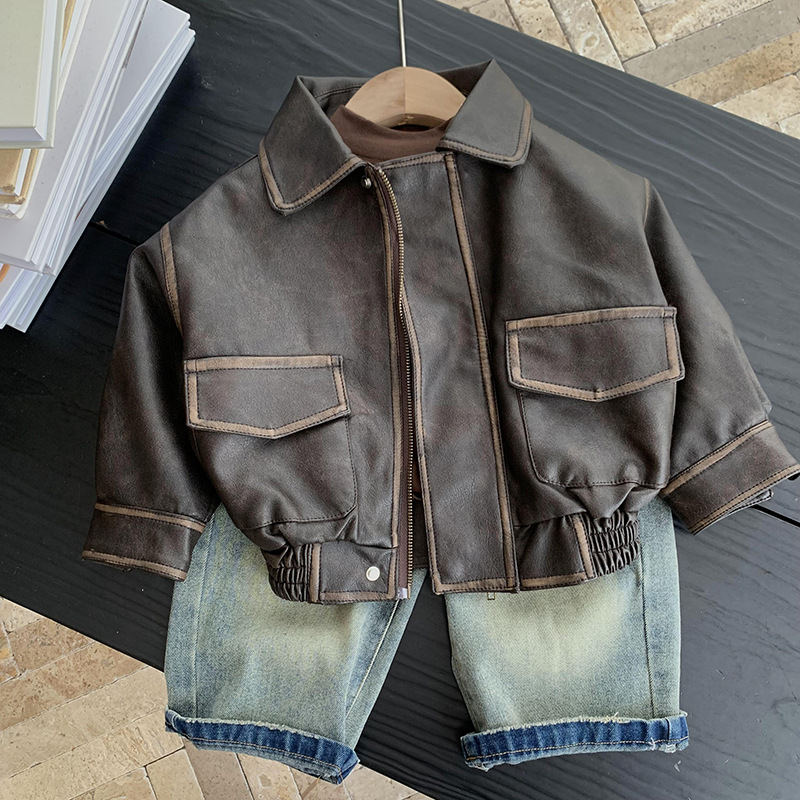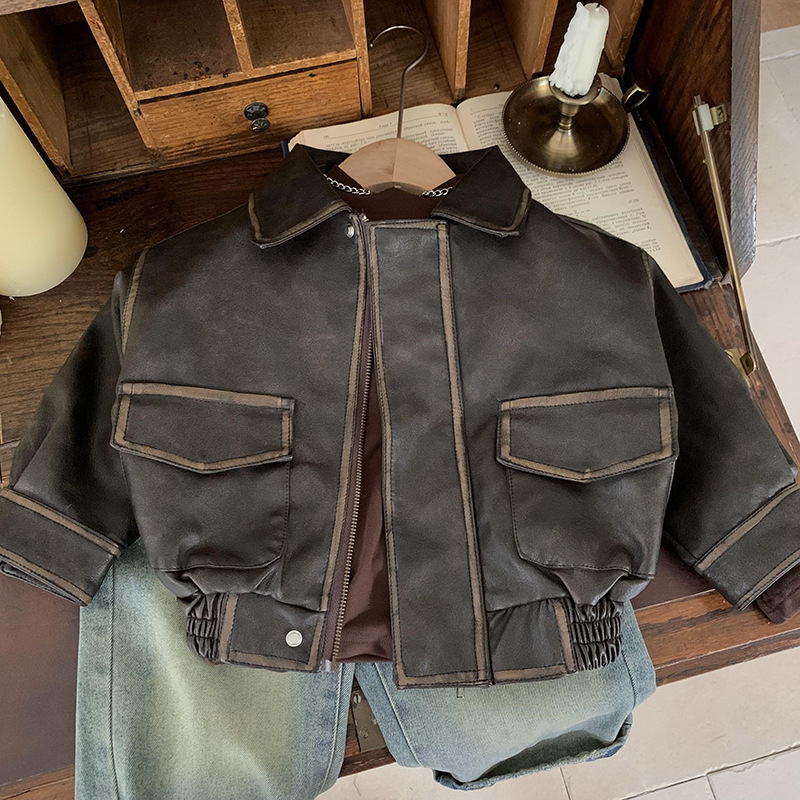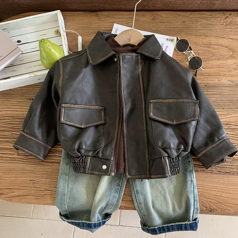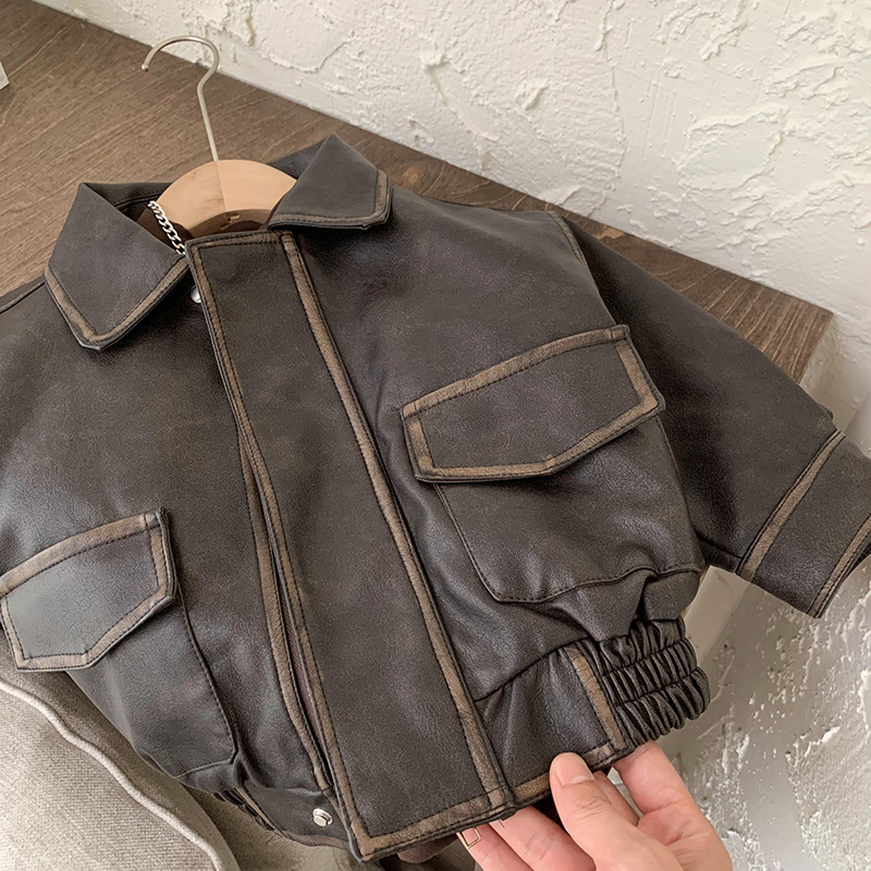 남학생 가죽 자켓 봄과 가을 2024 새로운 스타일 중소 어린이 프라이드 스트리트 보이 플러튼 잘 생긴 어린이 가을 재킷 트렌디 브랜드스토어 가기