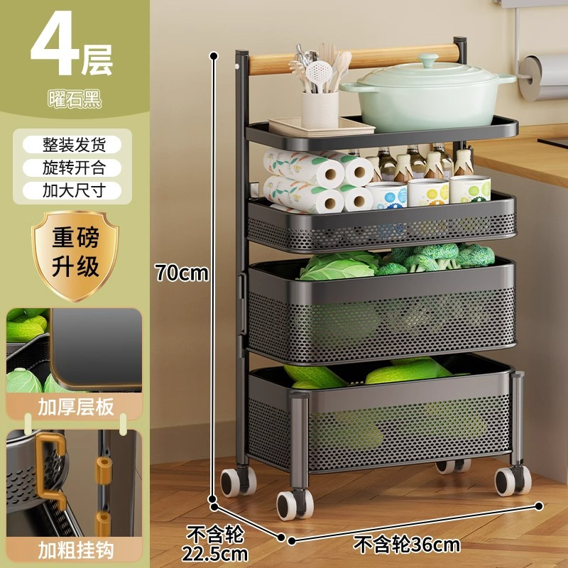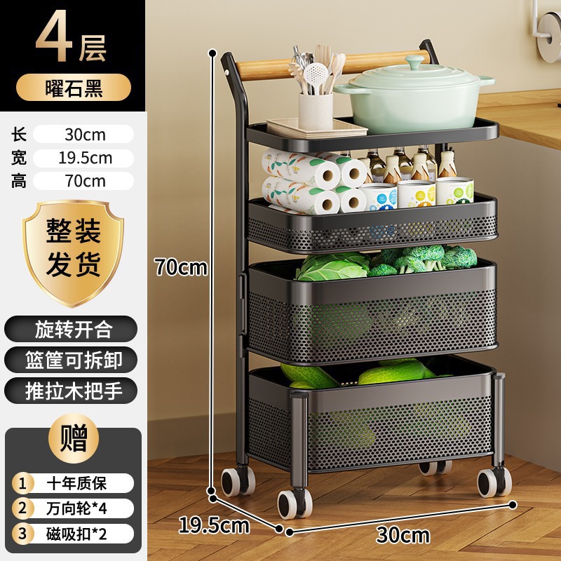 • 4겹 검정색* 나무 손잡이 트롤리 - 탈착식 메쉬 바구니