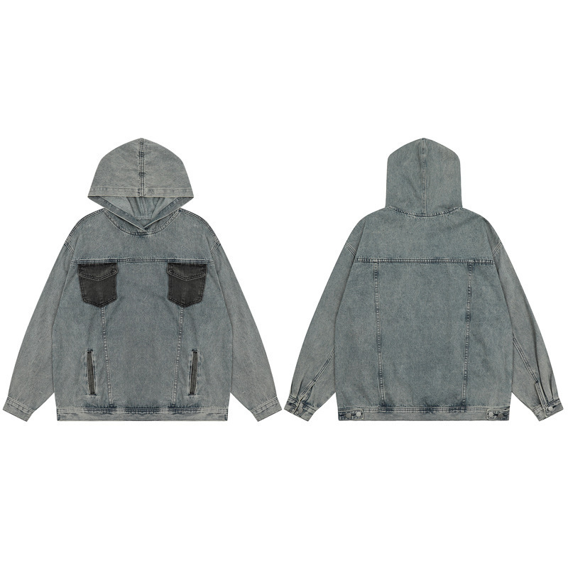 아메리칸 스타일 레트로 오래 된 컬러 패치 워크 포켓 후드 데님 스웨트 셔츠 남성용 트렌디 브랜드 루즈 커플 재킷