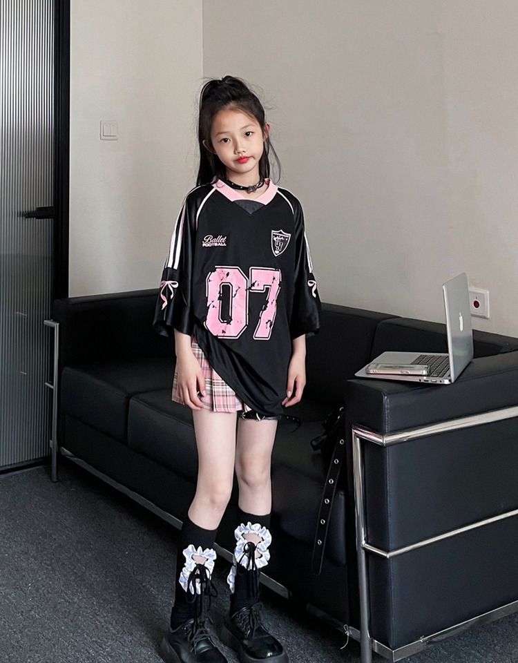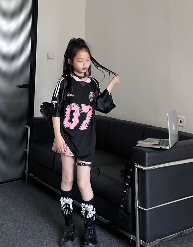 • 블랙과 핑크 배색 저지 + 핑크 체크 무늬 스커트