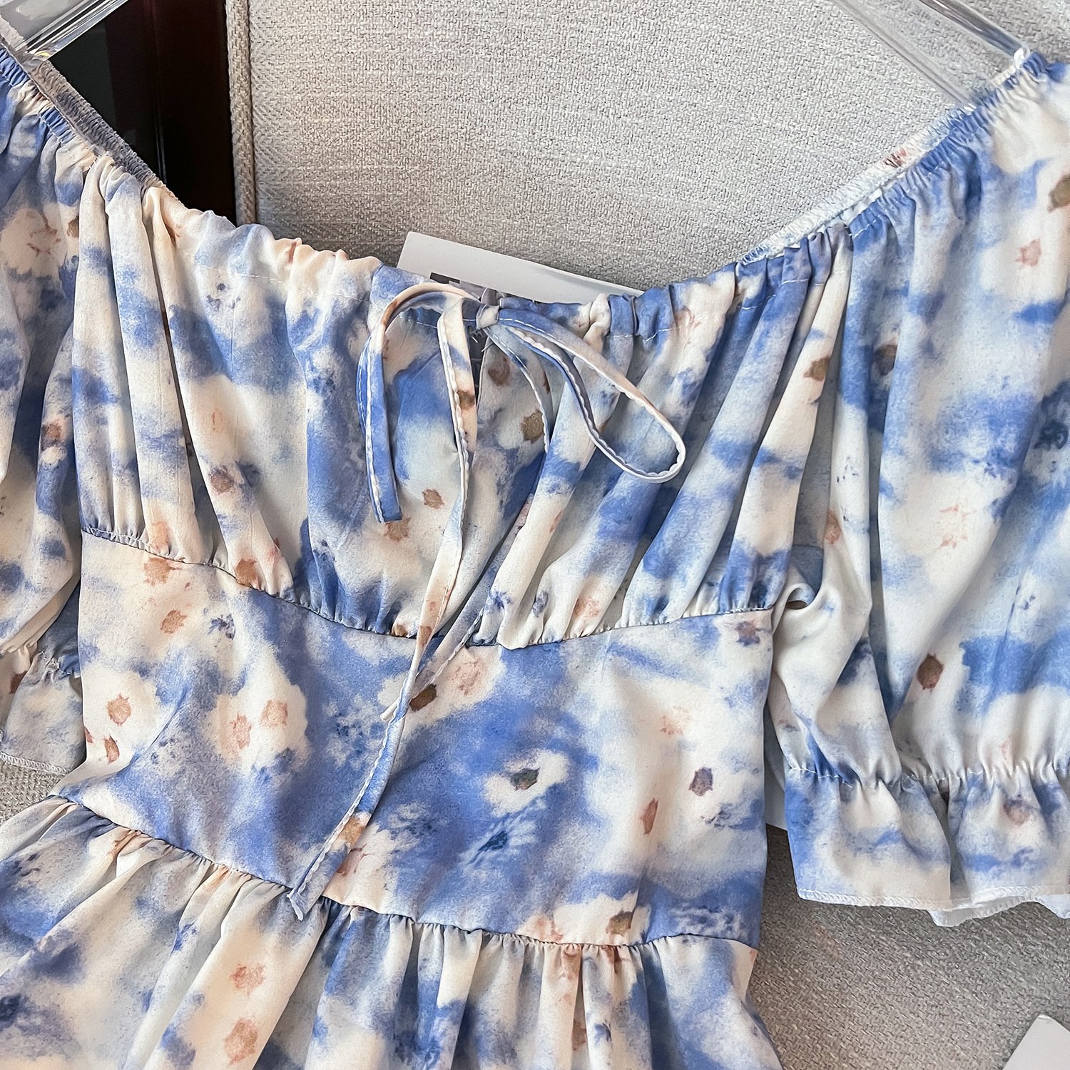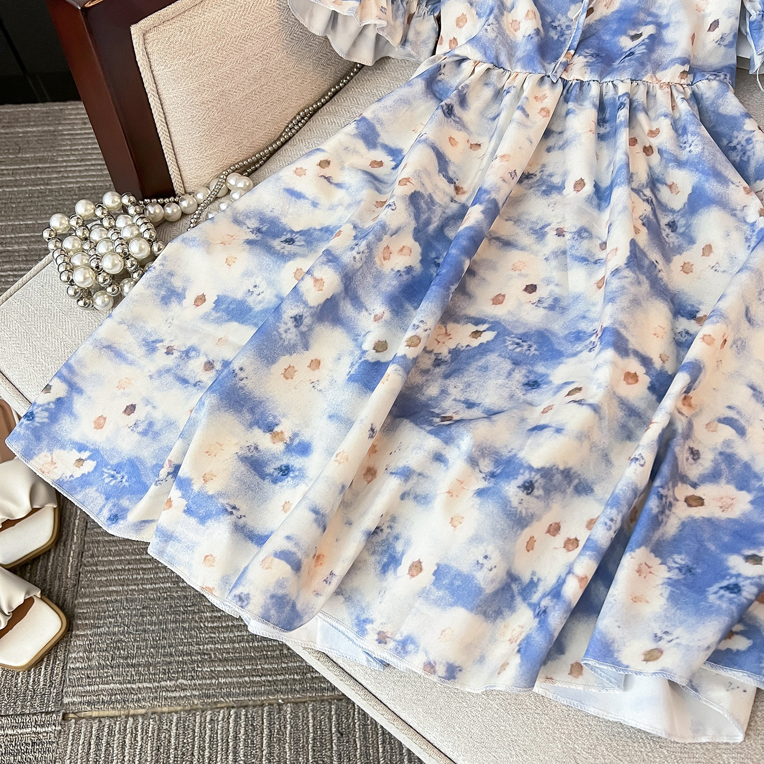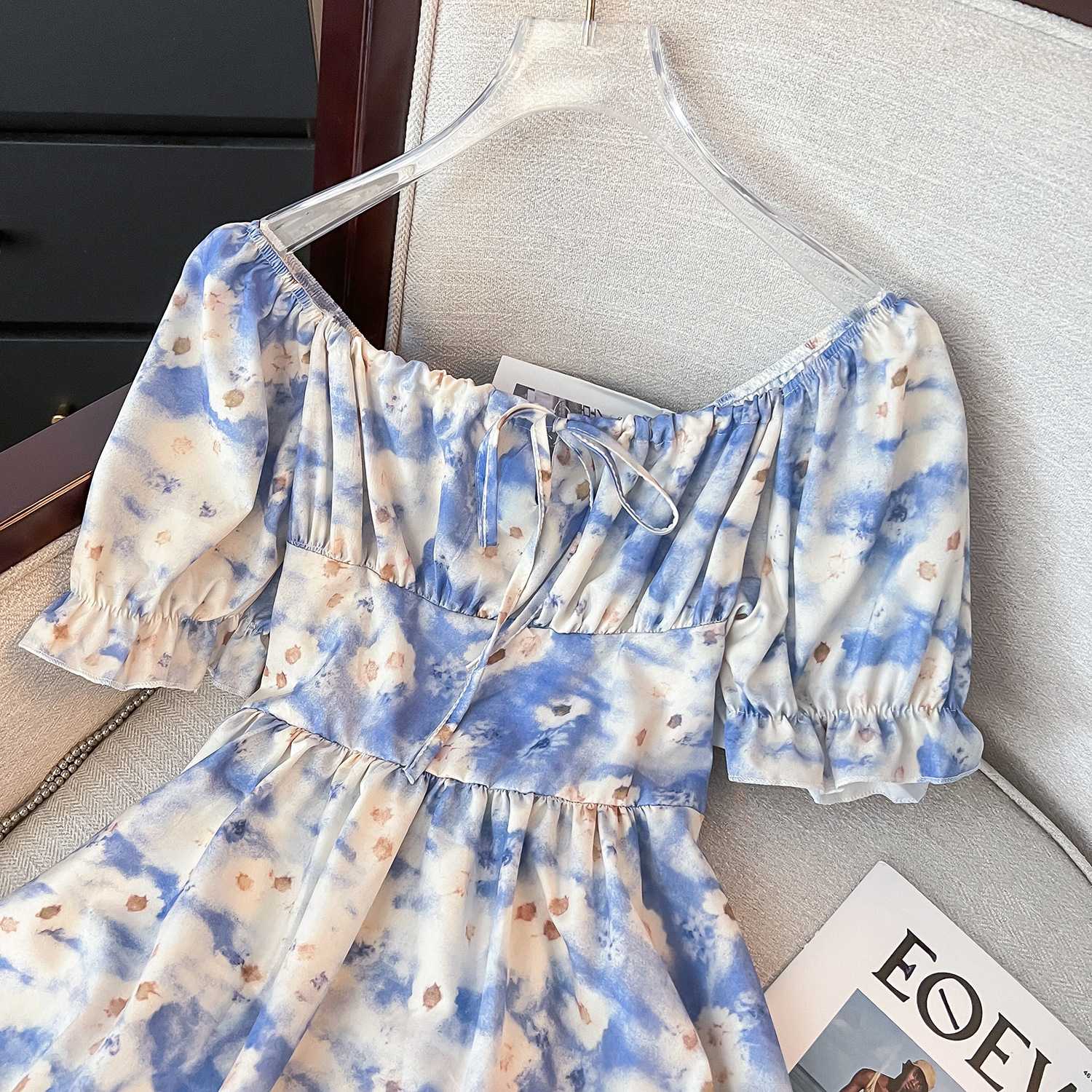 2024 푸른 꽃 원피스 봄과 여름 차 브레이크 프렌치 퍼프 슬리브 주름 허리 슬리밍 스커트스토어 가기
