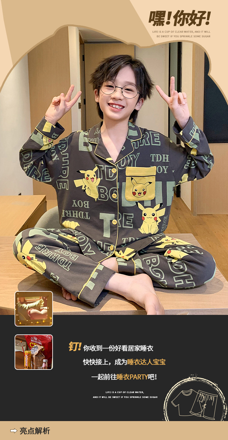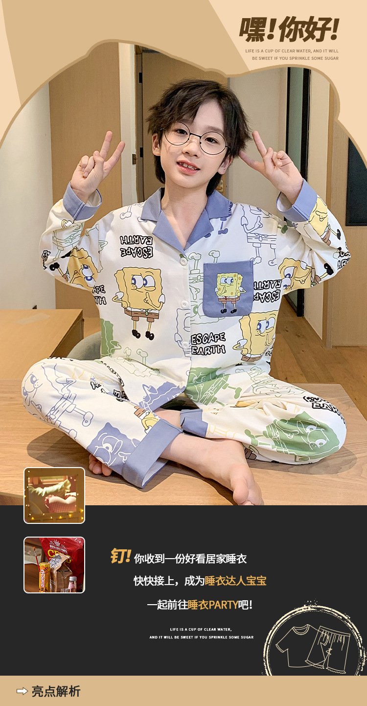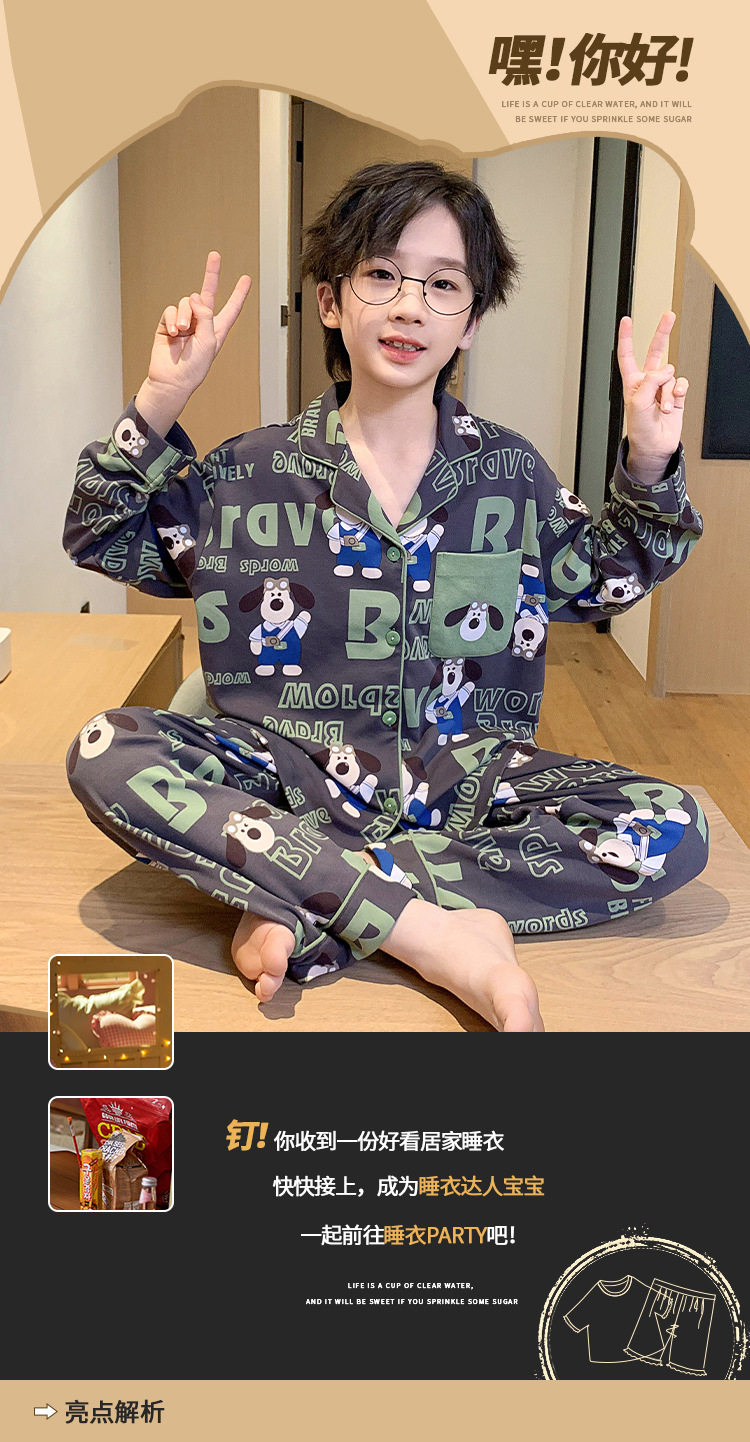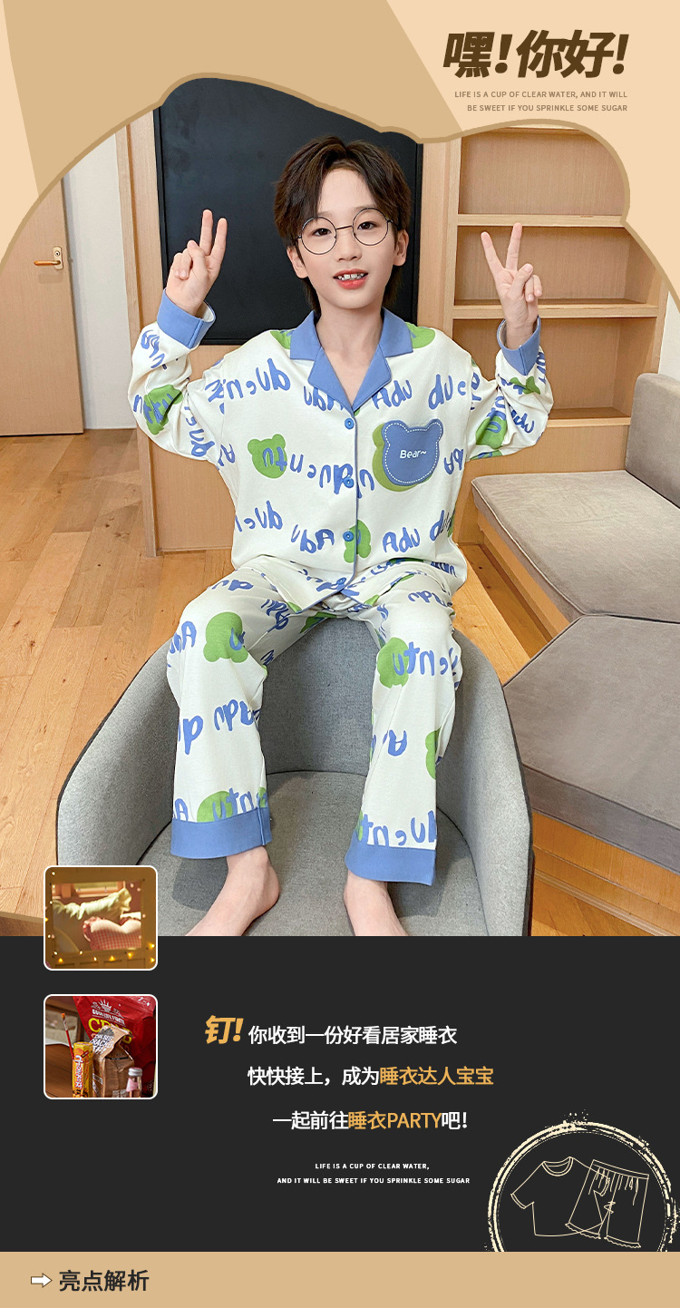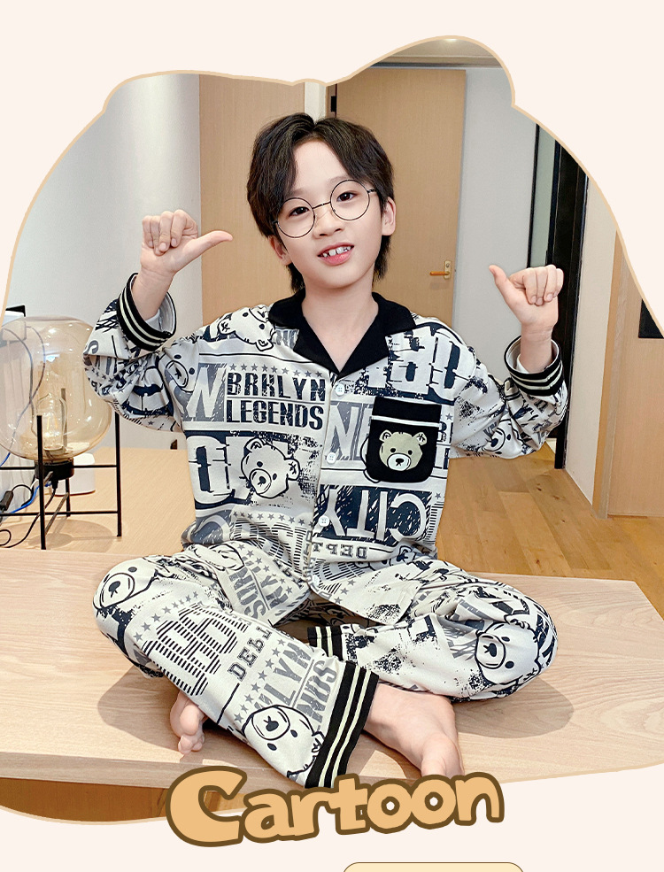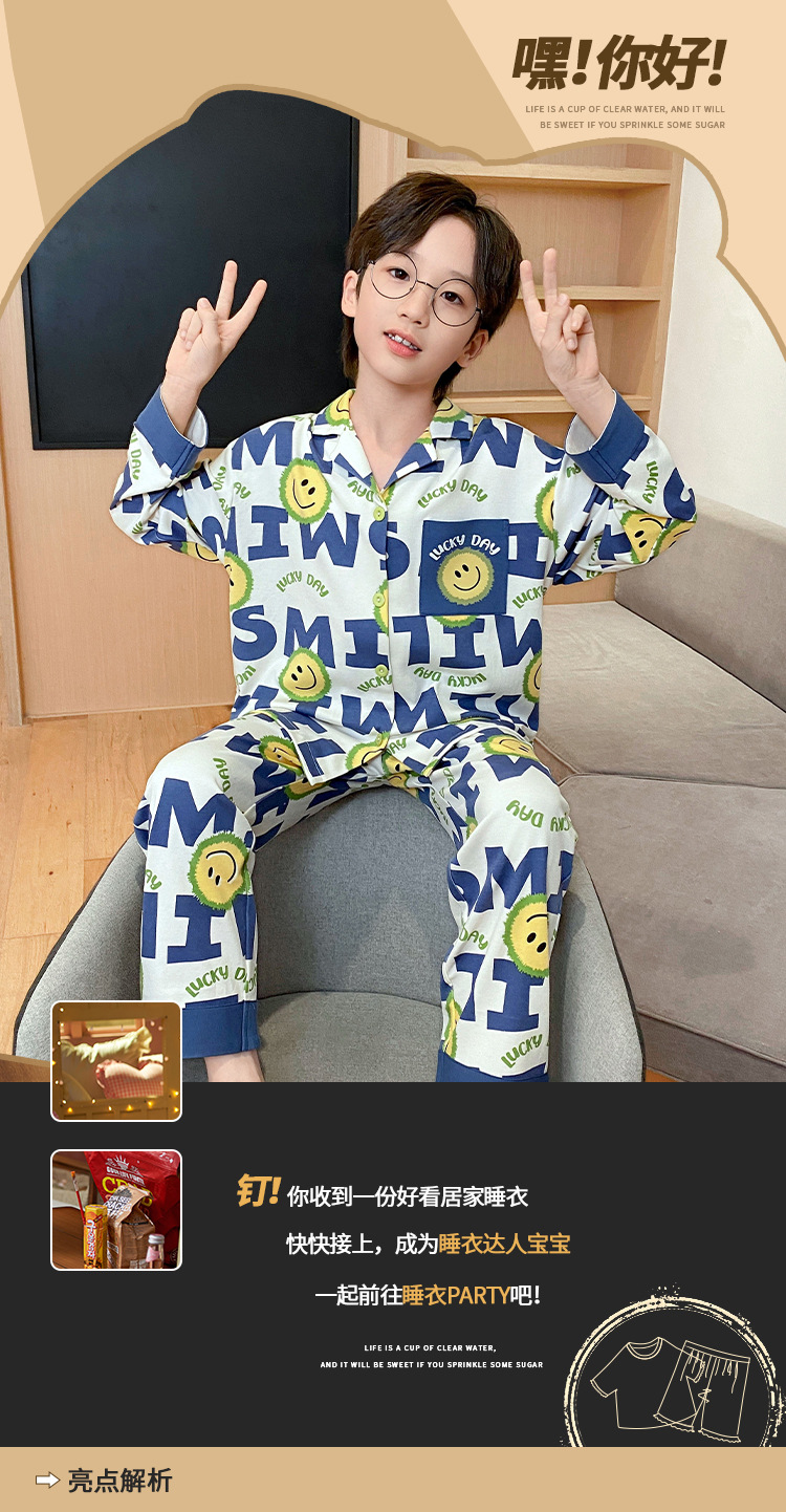 남아용 얇은 긴팔 긴바지 잠옷, 중대형 어린이용 만화 카툰 카라 오픈형 가디건, 외출복으로도 착용 가능한 순면 홈웨어스토어 가기