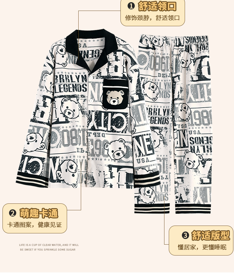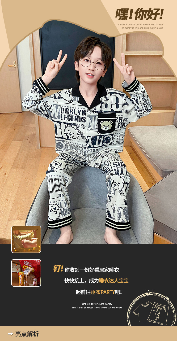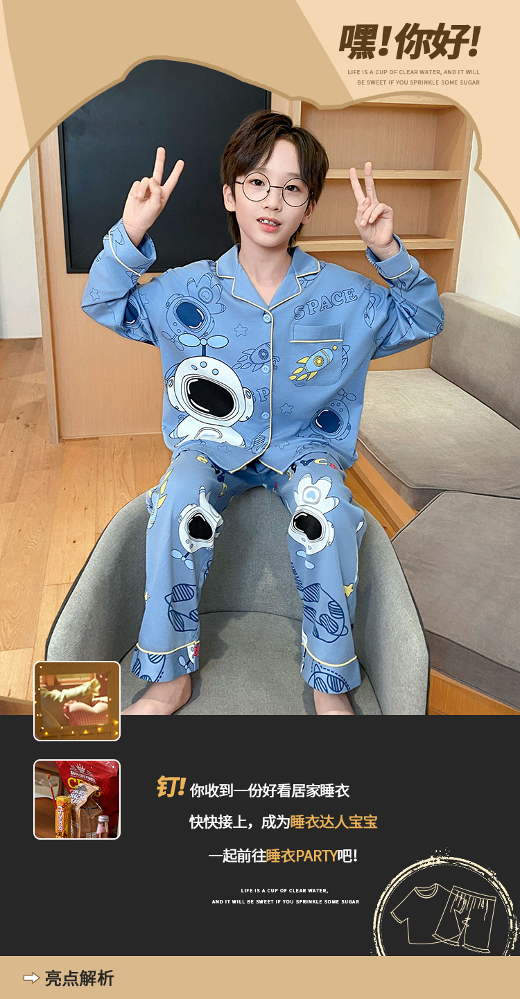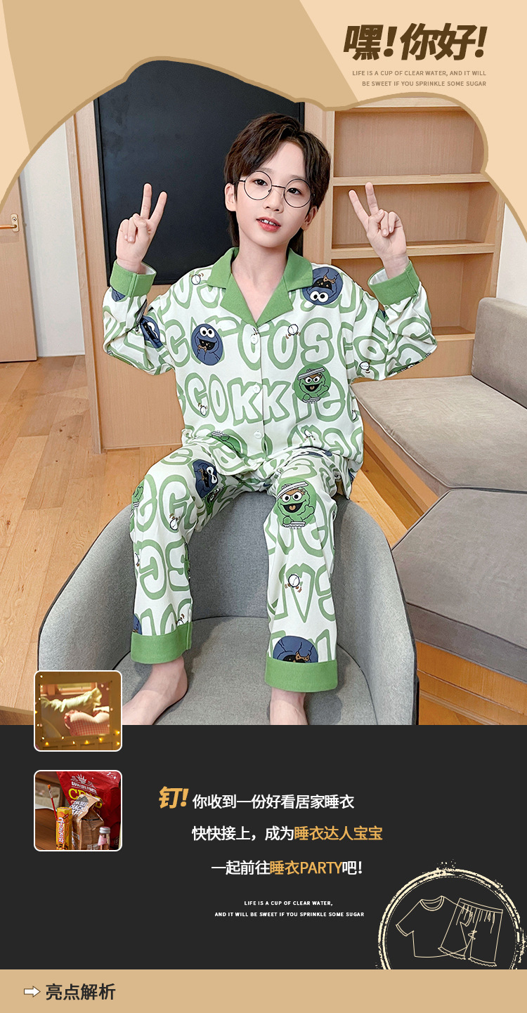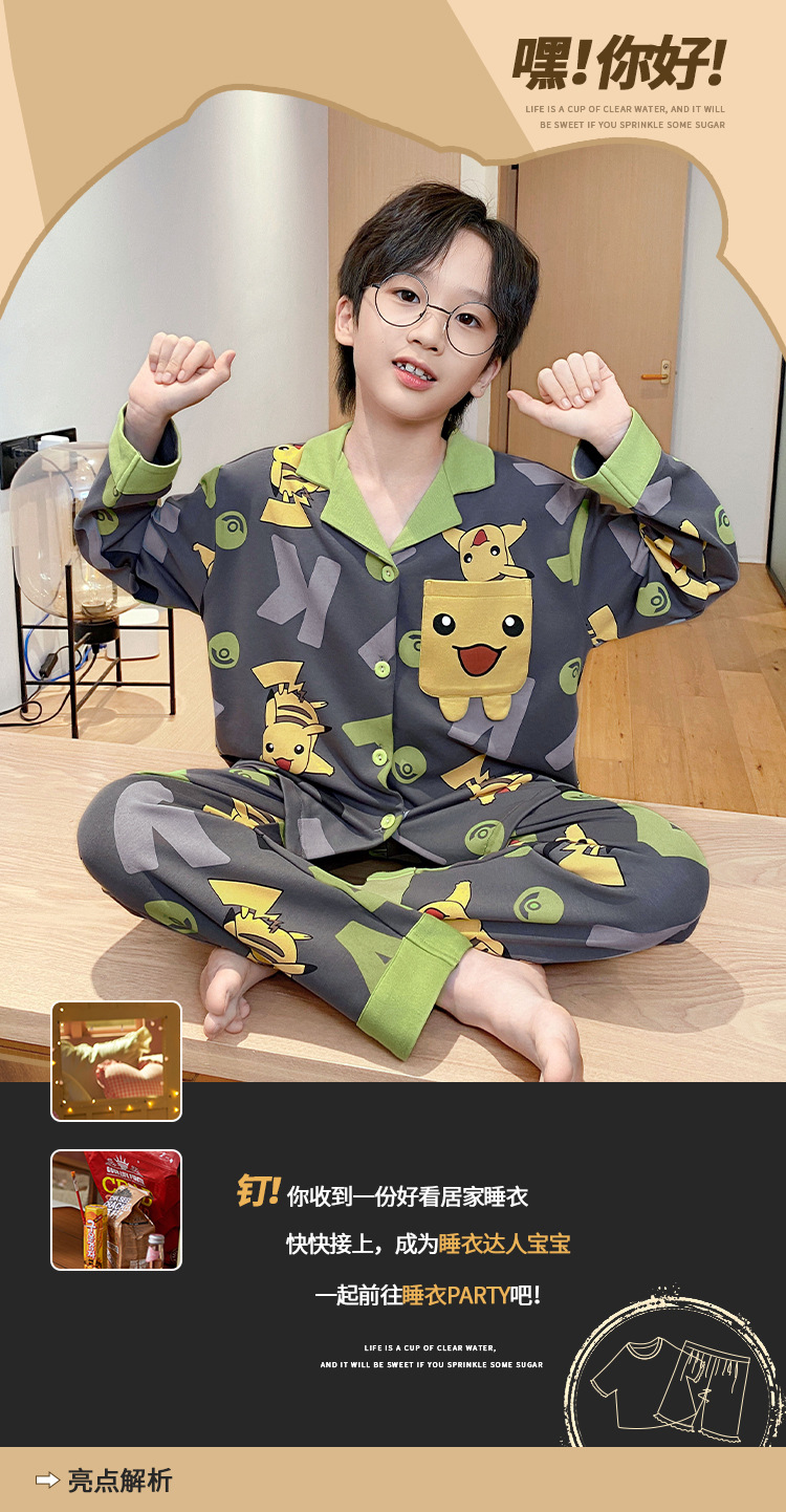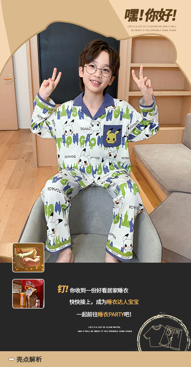 남아용 얇은 긴팔 긴바지 잠옷, 중대형 어린이용 만화 카툰 카라 오픈형 가디건, 외출복으로도 착용 가능한 순면 홈웨어스토어 가기