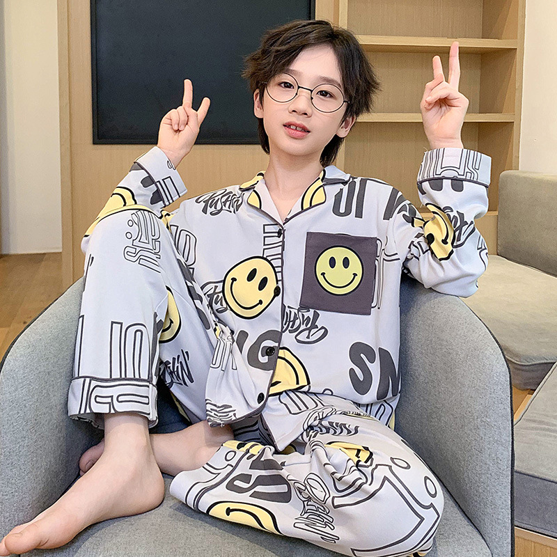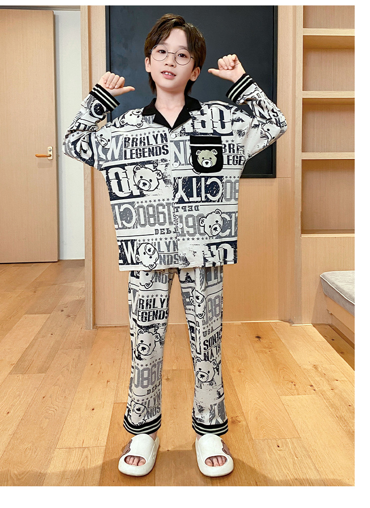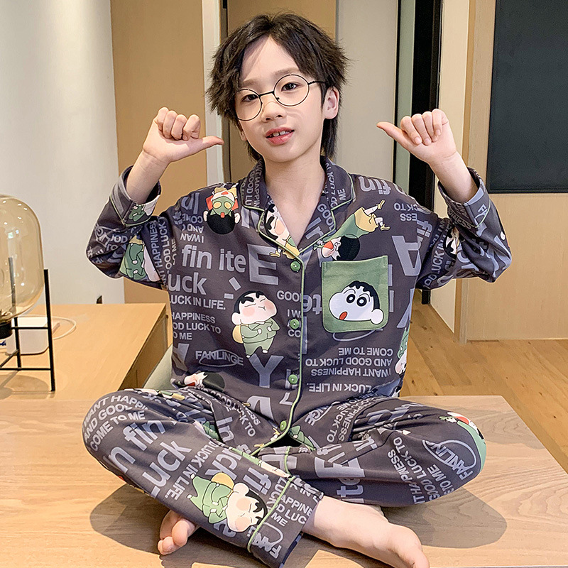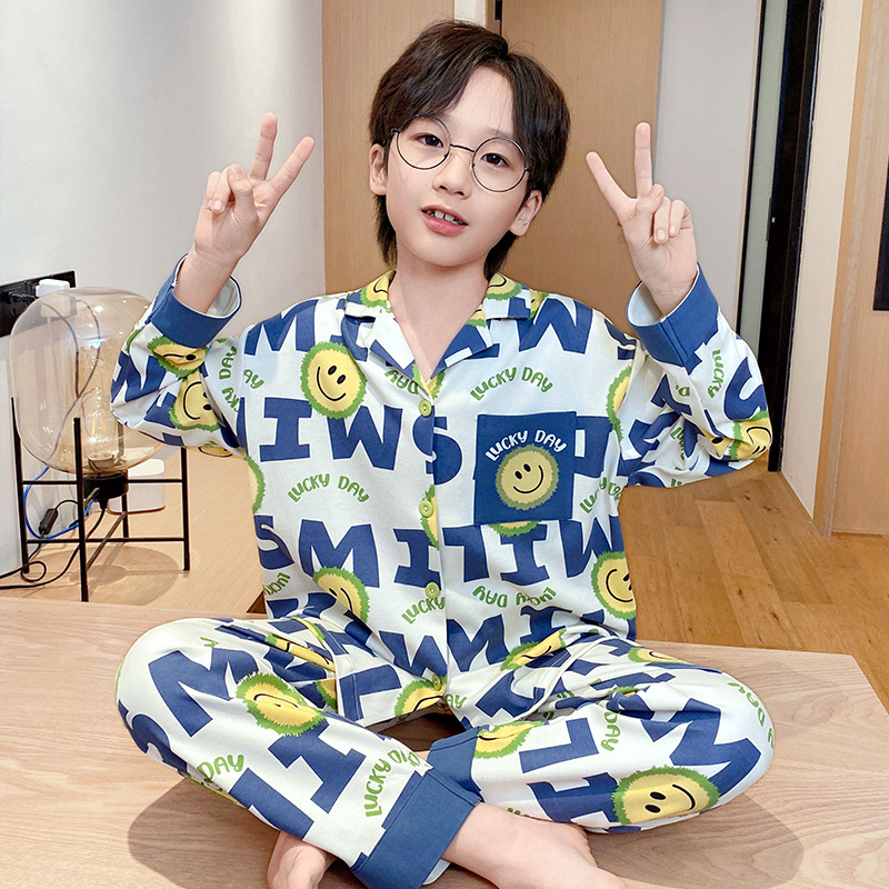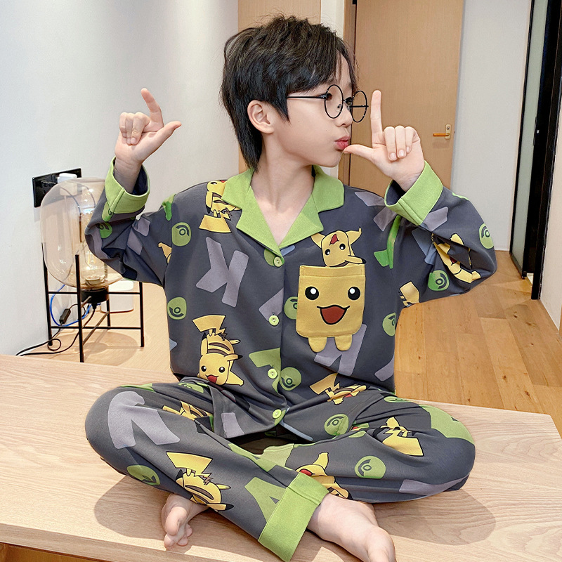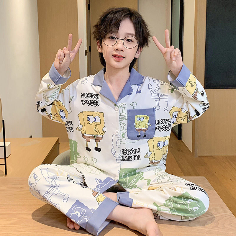 남아용 얇은 긴팔 긴바지 잠옷, 중대형 어린이용 만화 카툰 카라 오픈형 가디건, 외출복으로도 착용 가능한 순면 홈웨어