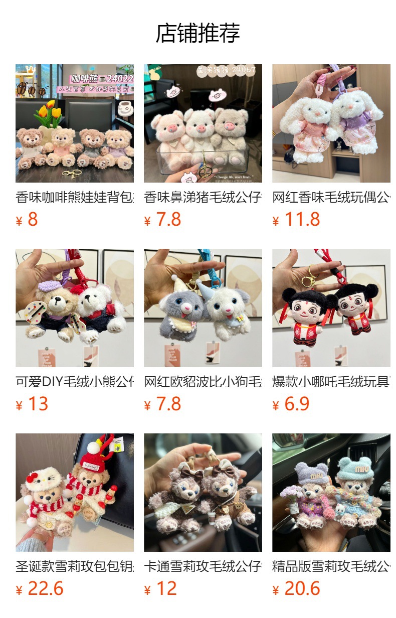 샤오홍슈 인형과 같은 스타일의 셜리 봉제 인형, 귀여운 더피 베어 인형, 자동차 키체인, 여자아이들을 위한 장식품스토어 가기