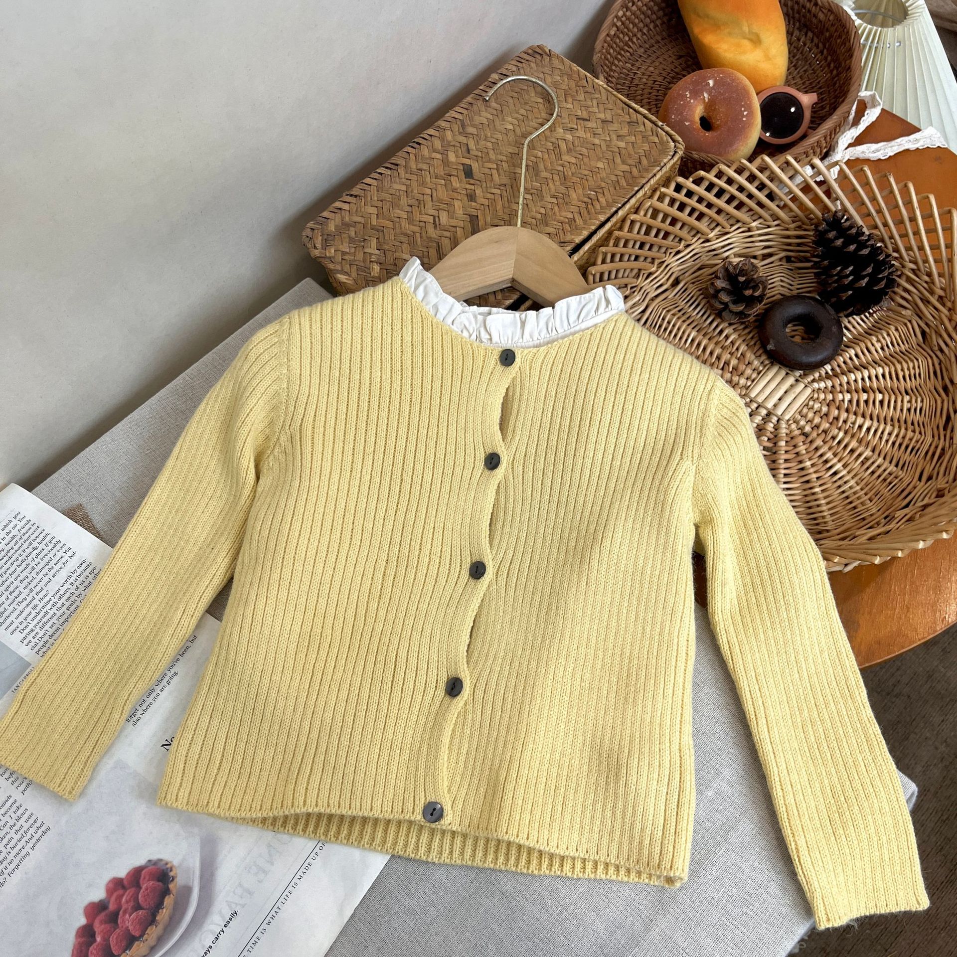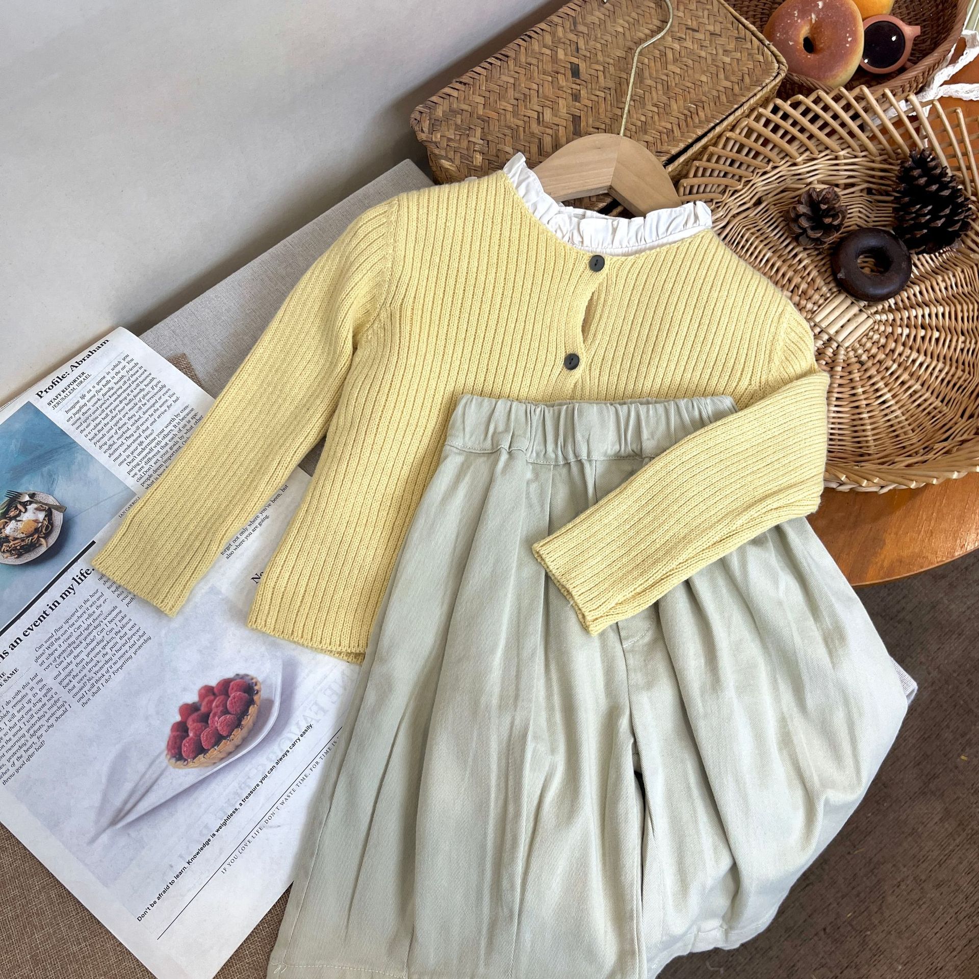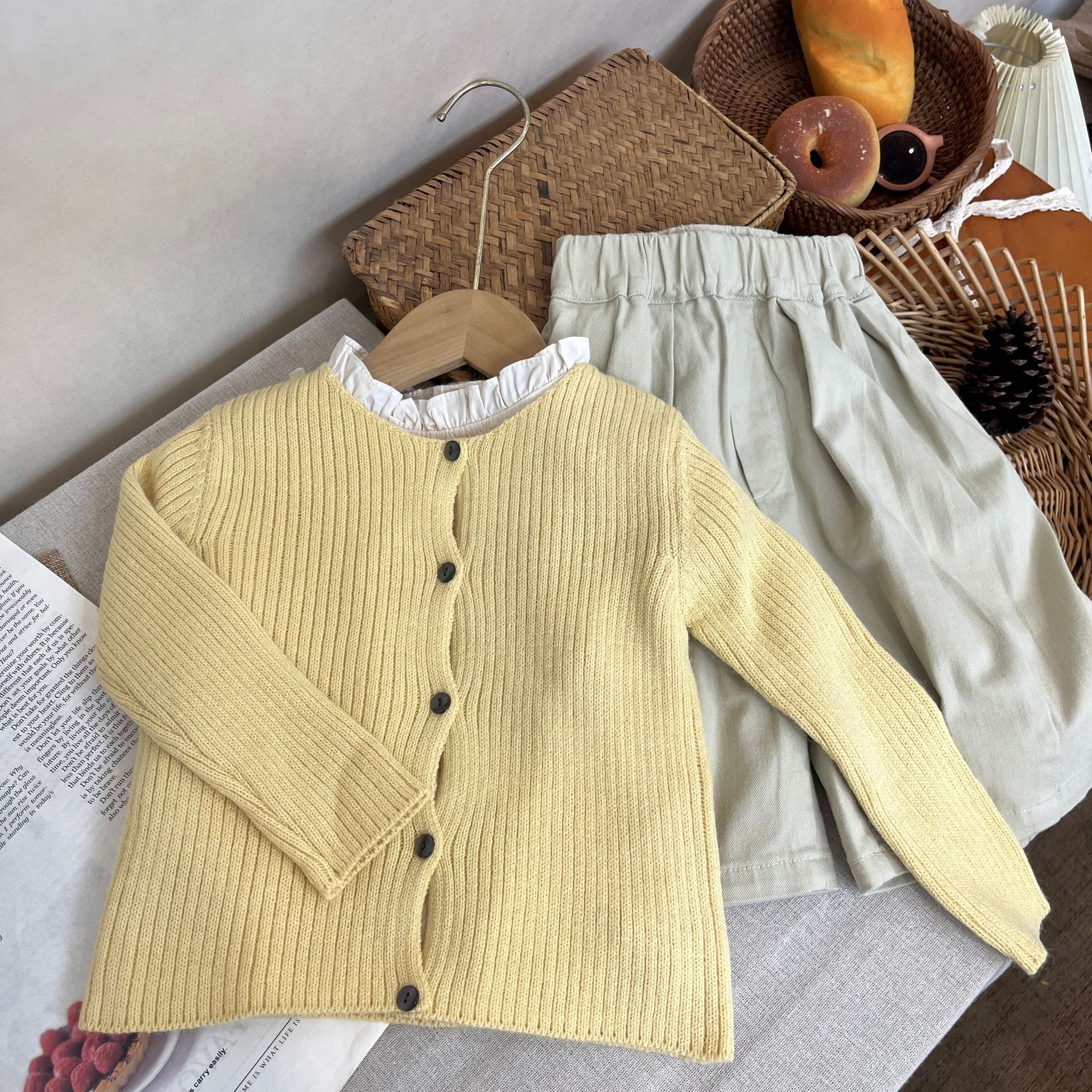 가을 2024 여자 새로운 순수 코튼 니트 카디건 & 귀 테두리 셔츠 & 올 매치 블루머스 클래식 세트