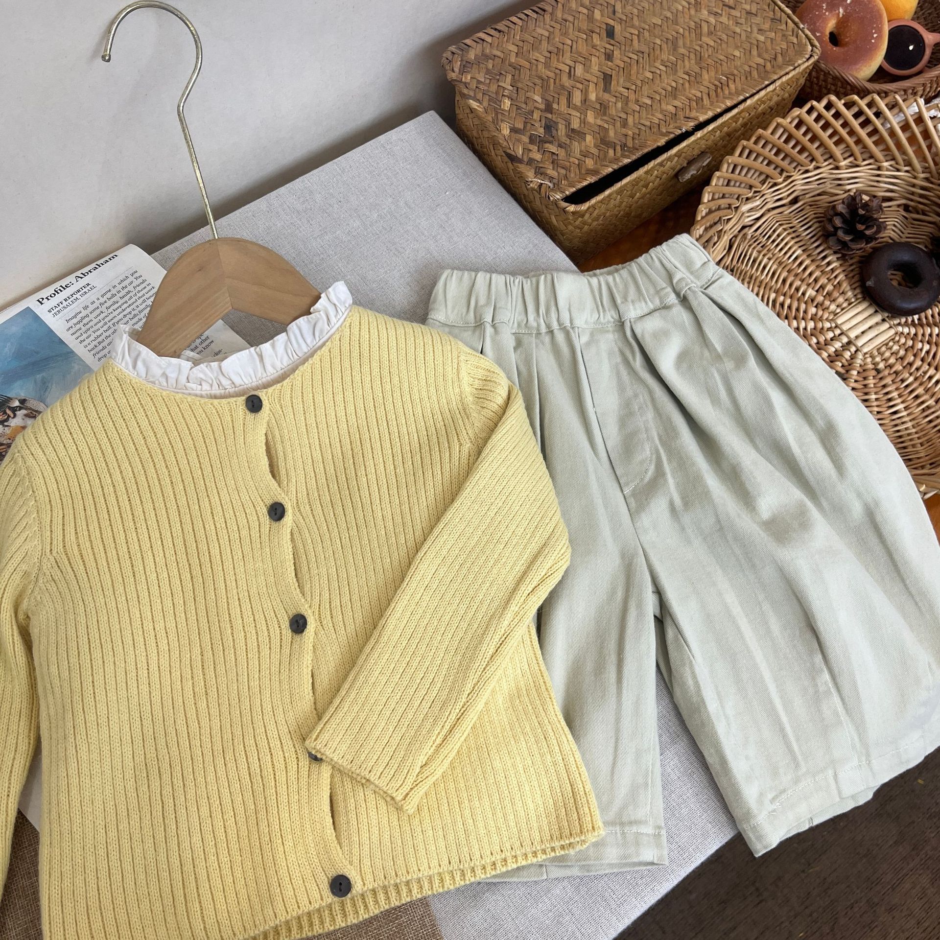 가을 2024 여자 새로운 순수 코튼 니트 카디건 & 귀 테두리 셔츠 & 올 매치 블루머스 클래식 세트스토어 가기