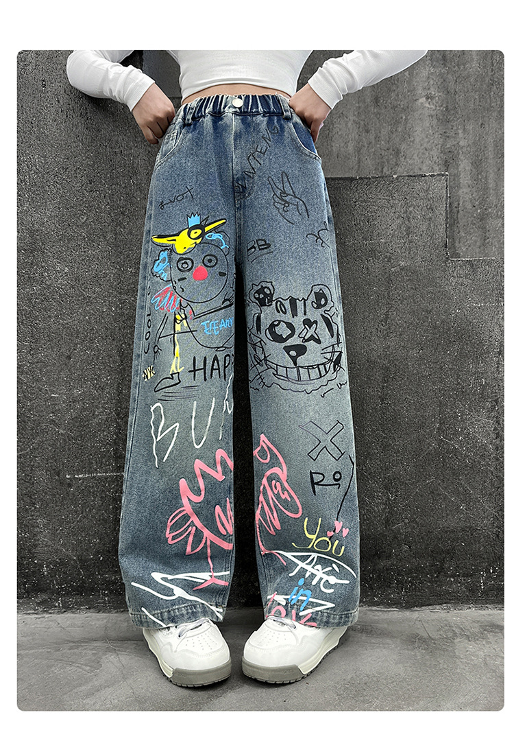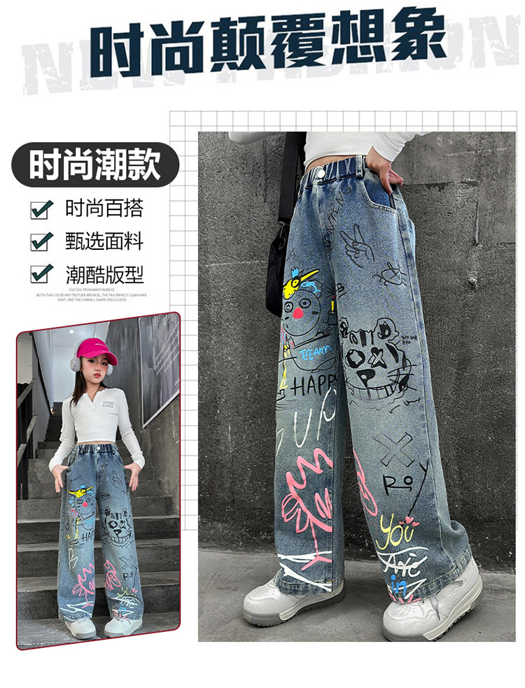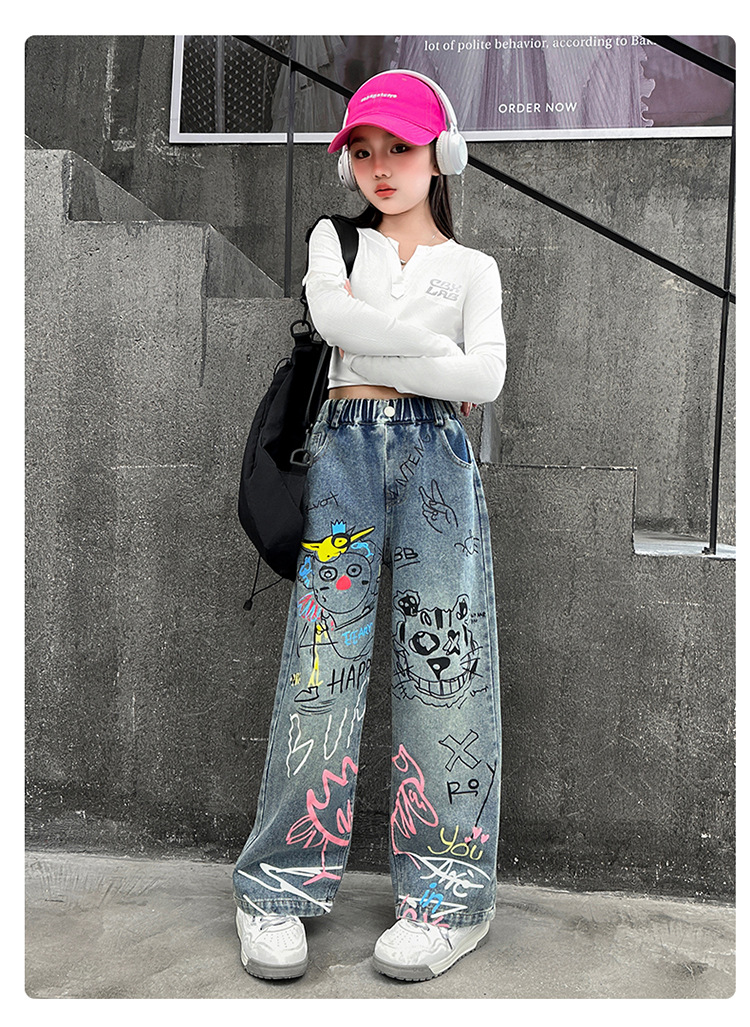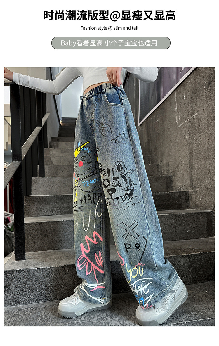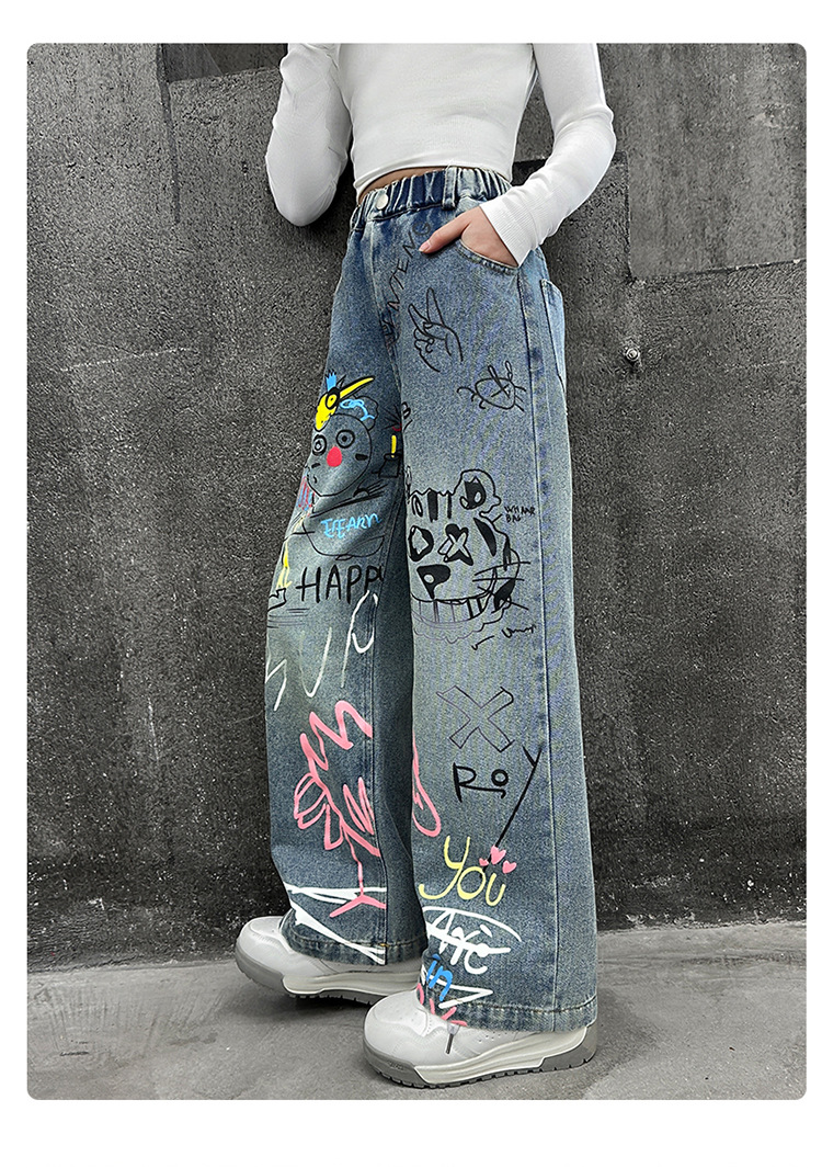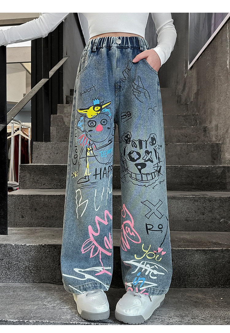 여아용 청바지, 패셔너블하고 스타일리시한 아동용 그래피티 와이드 팬츠, 중대형 아동용 봄 가을 스타일, 인기 있는 루즈핏 스트레이트 롱 팬츠스토어 가기