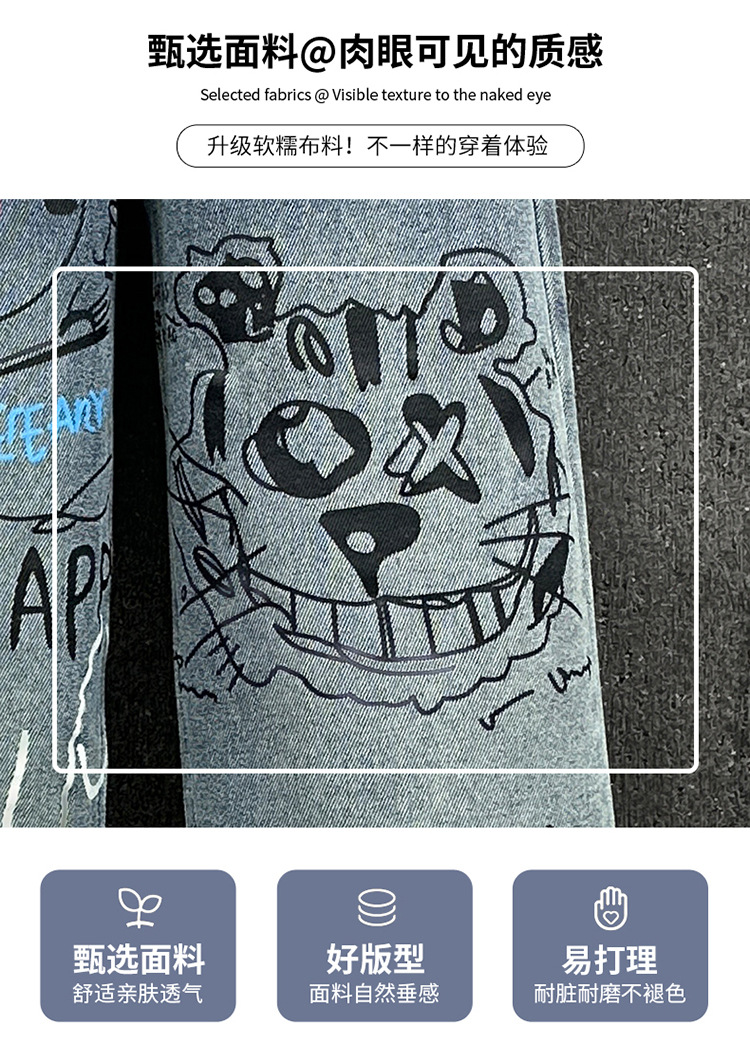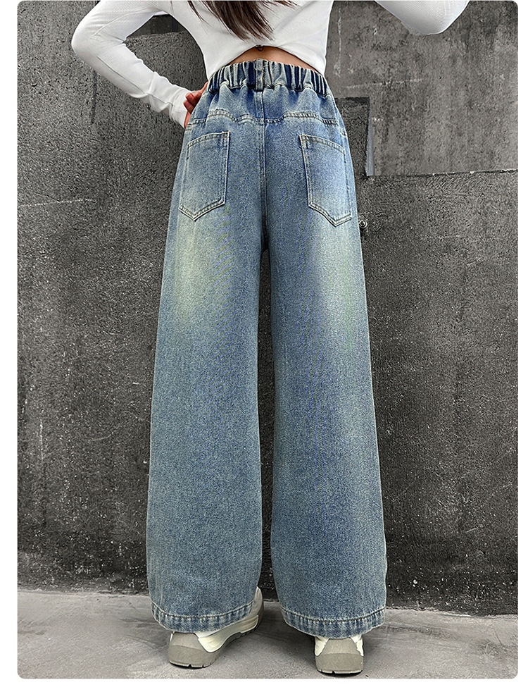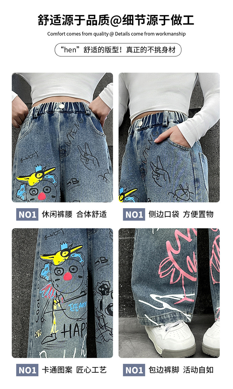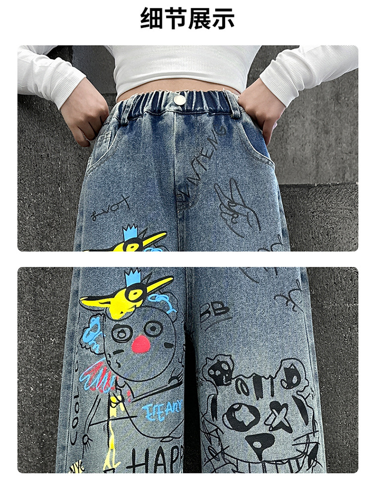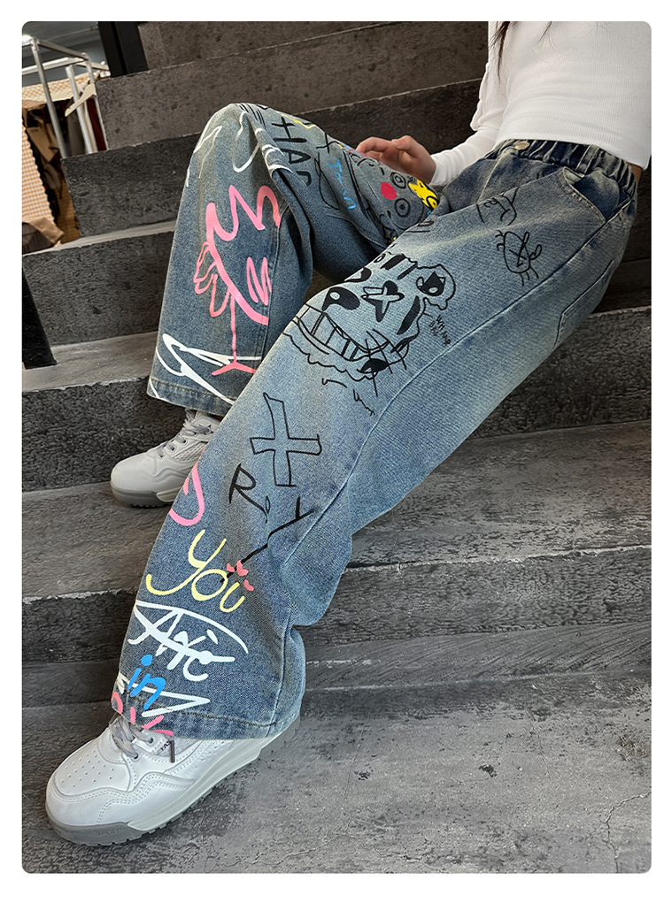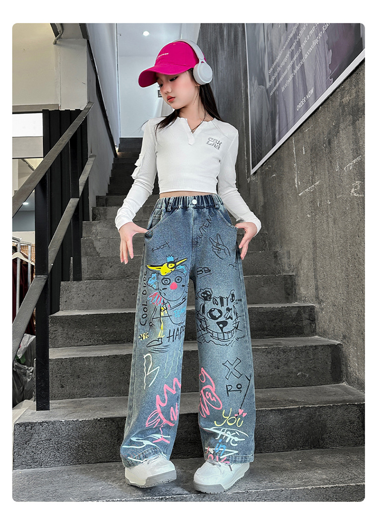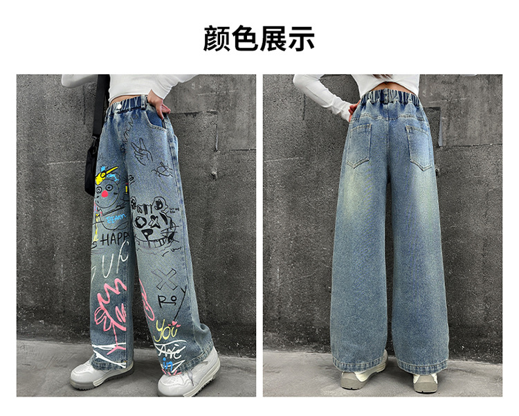 여아용 청바지, 패셔너블하고 스타일리시한 아동용 그래피티 와이드 팬츠, 중대형 아동용 봄 가을 스타일, 인기 있는 루즈핏 스트레이트 롱 팬츠스토어 가기