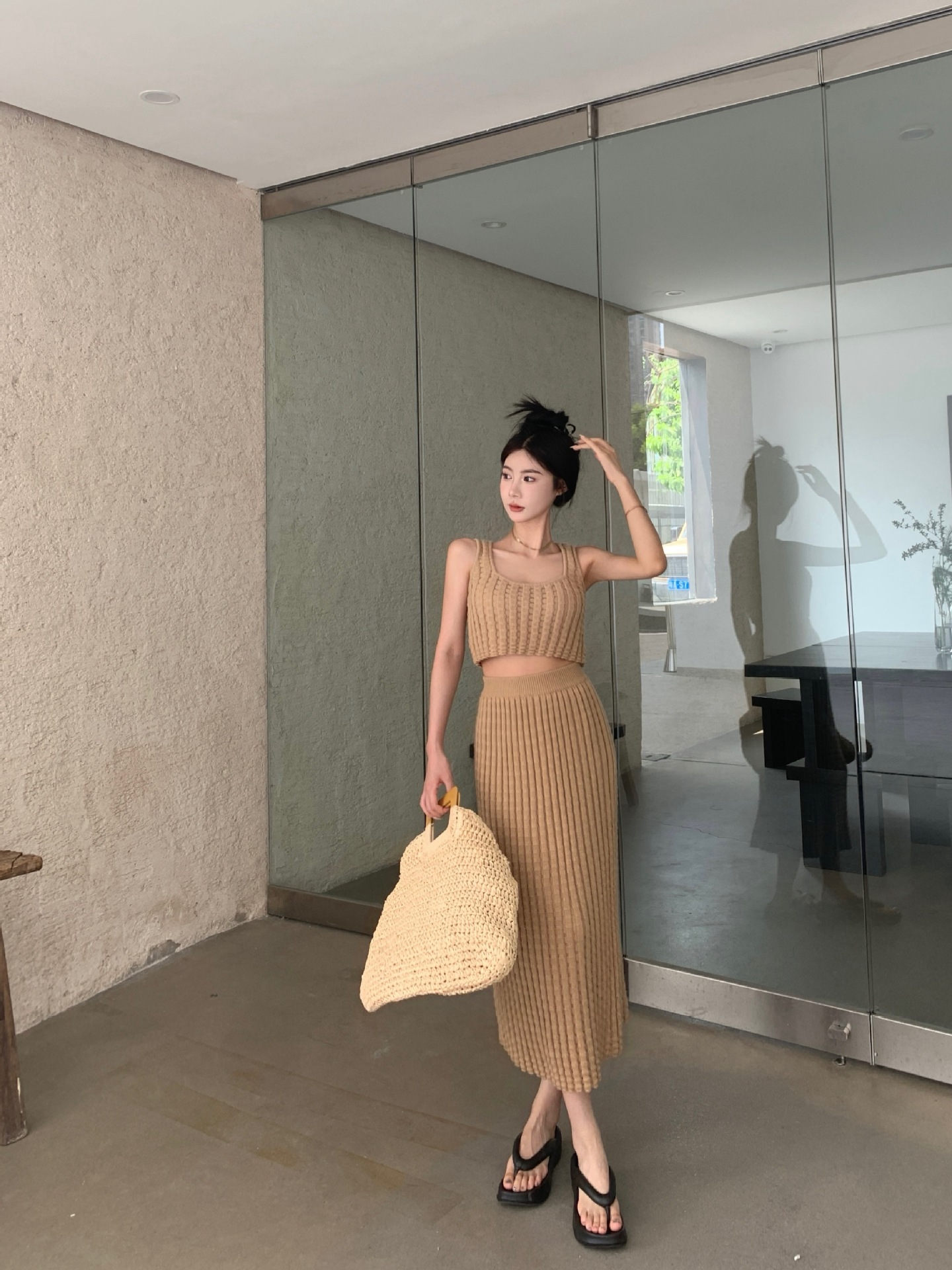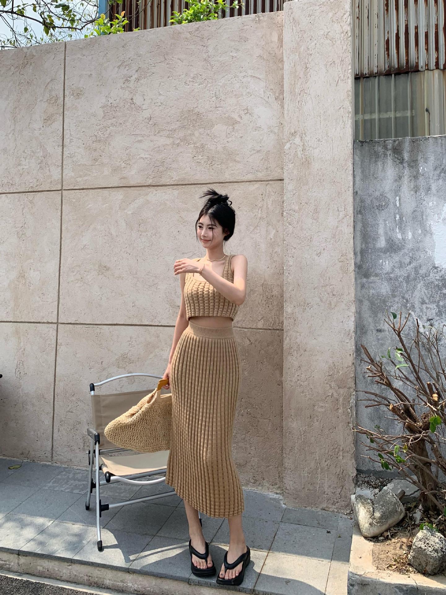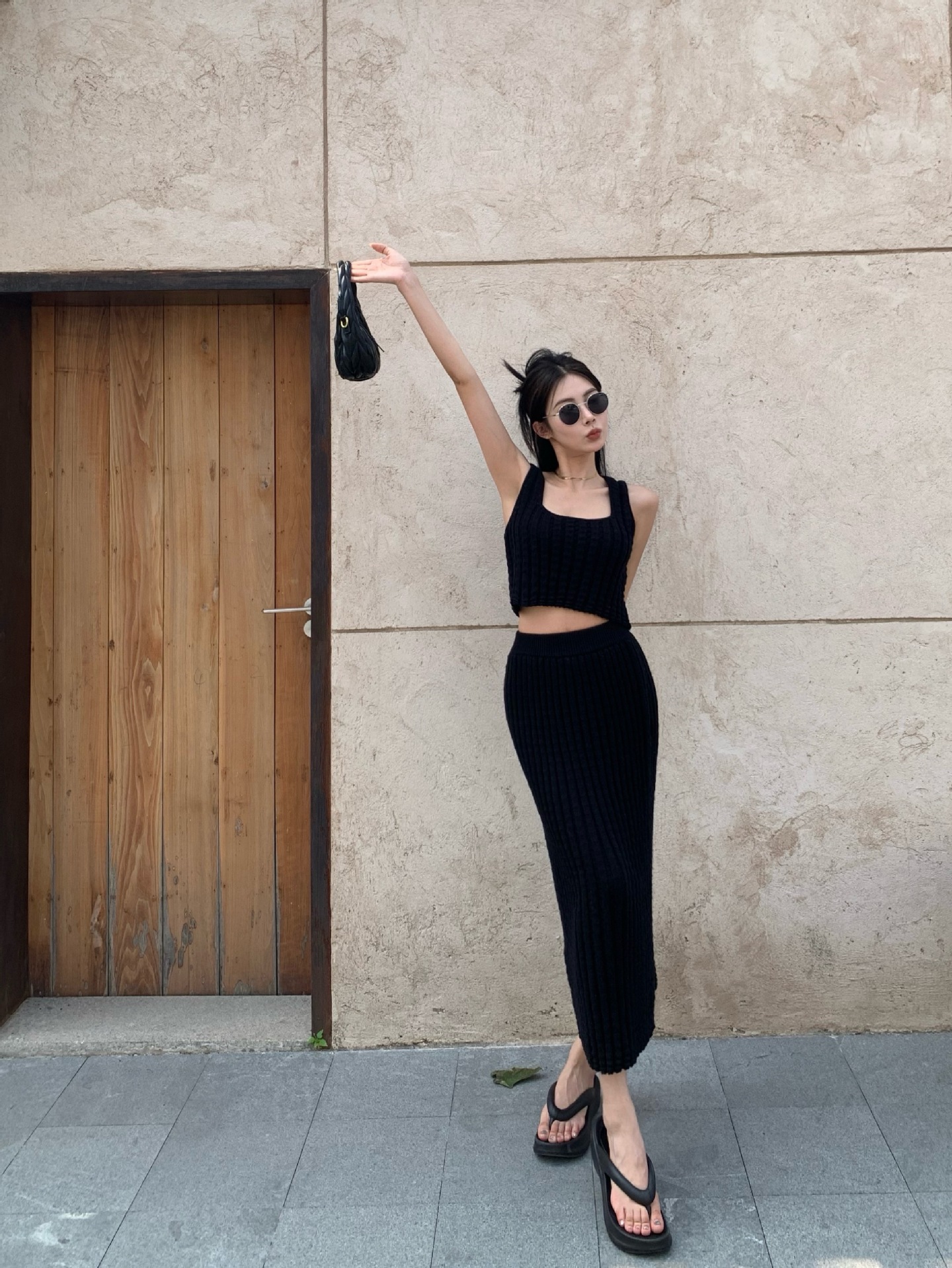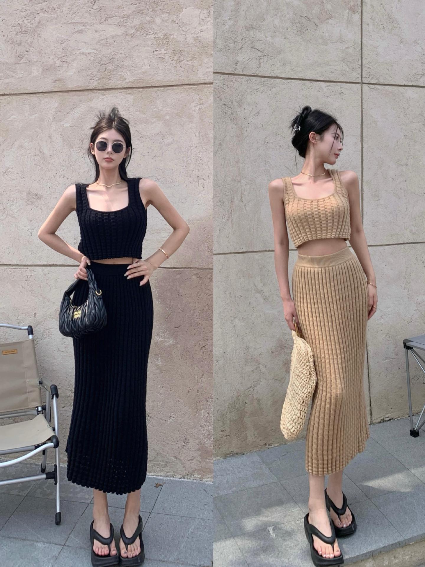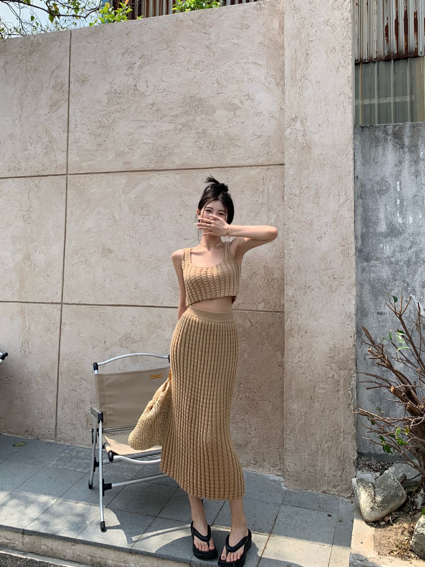 2024 패션 세트 여성의 우아한 니트 카미솔 여름 높은 허리 엉덩이 스커트 스커트 투피스 세트스토어 가기