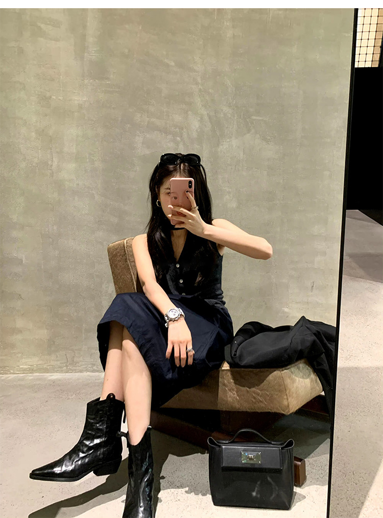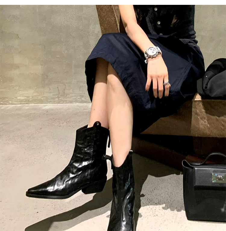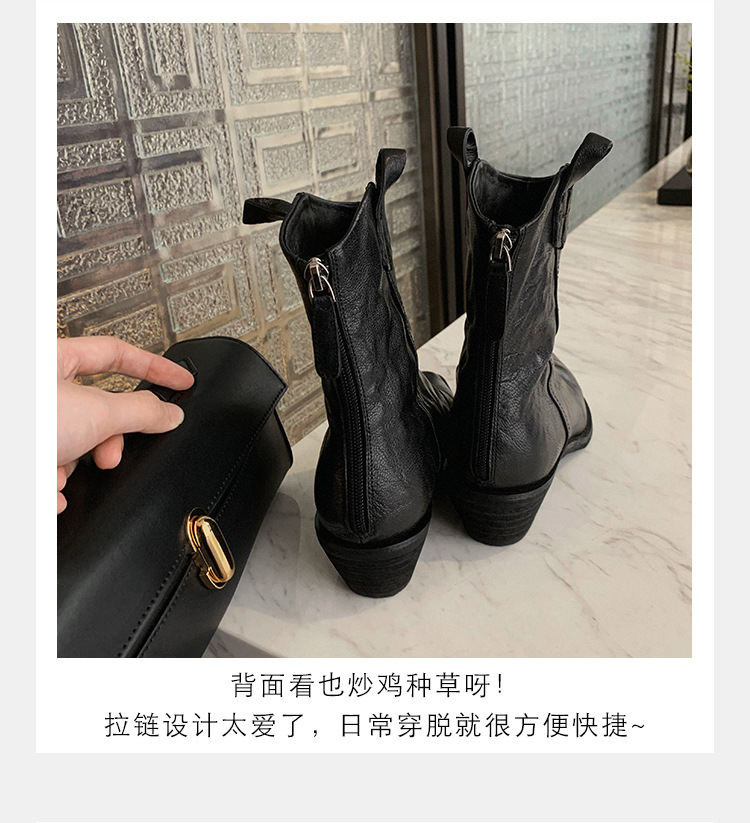 소가죽 버전 ~ 천연가죽 레트로 플리츠 스퀘어토 웨스턴 카우보이부츠 미드카프 라이더부츠 여성용 두꺼운 굽 마틴 다용도스토어 가기