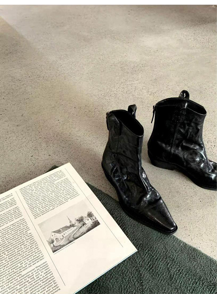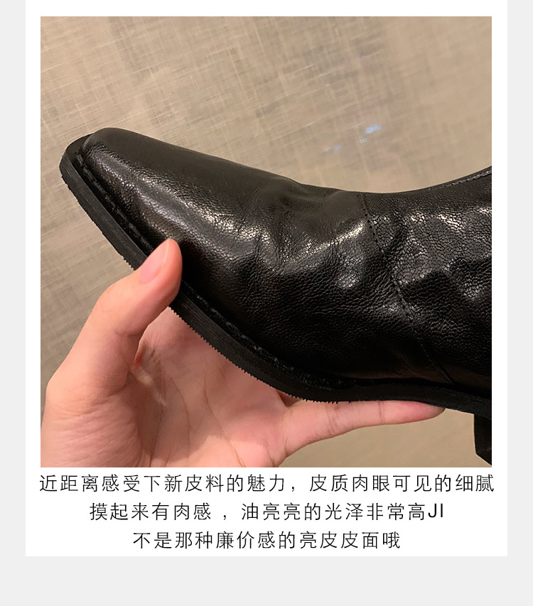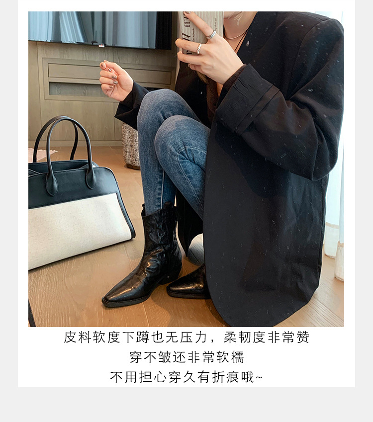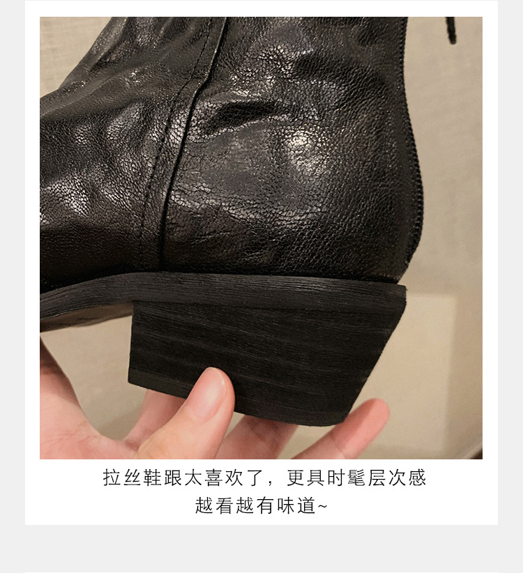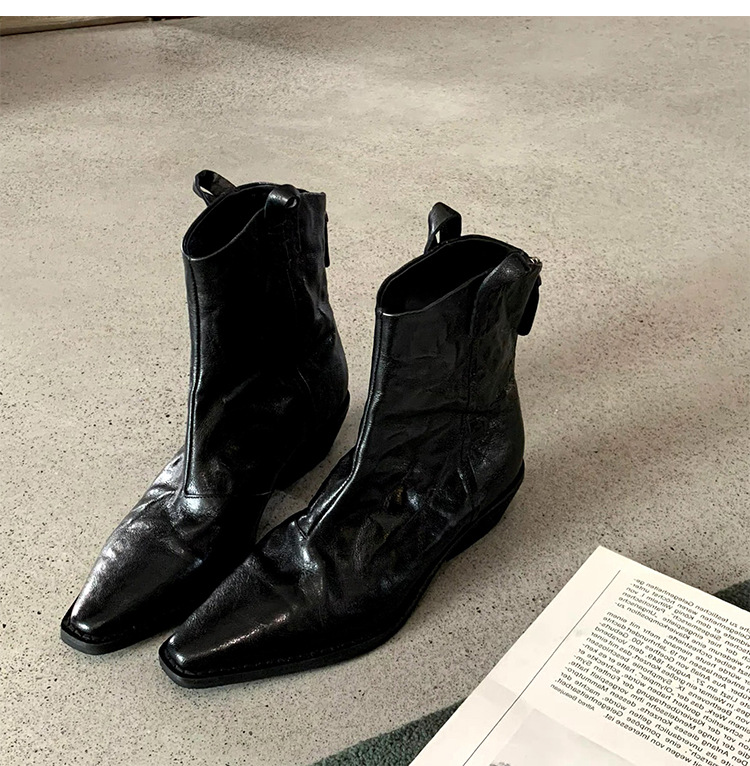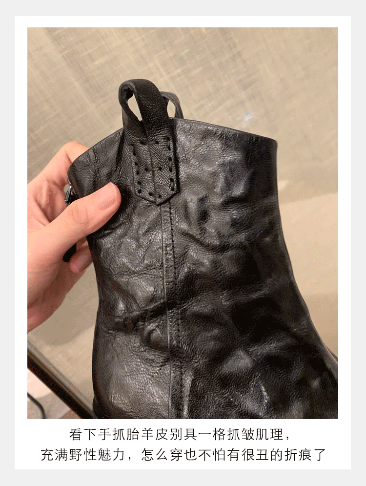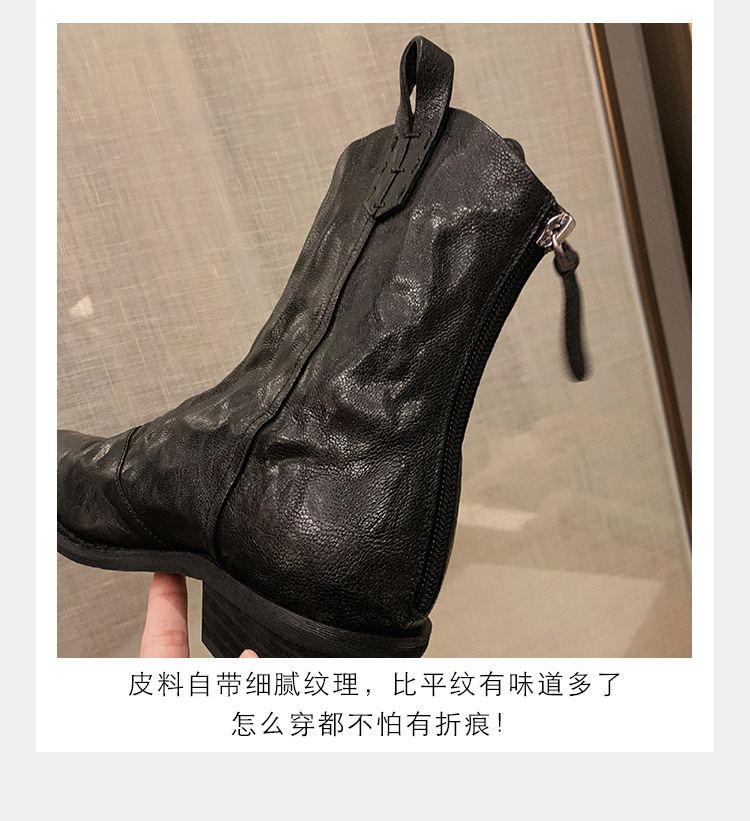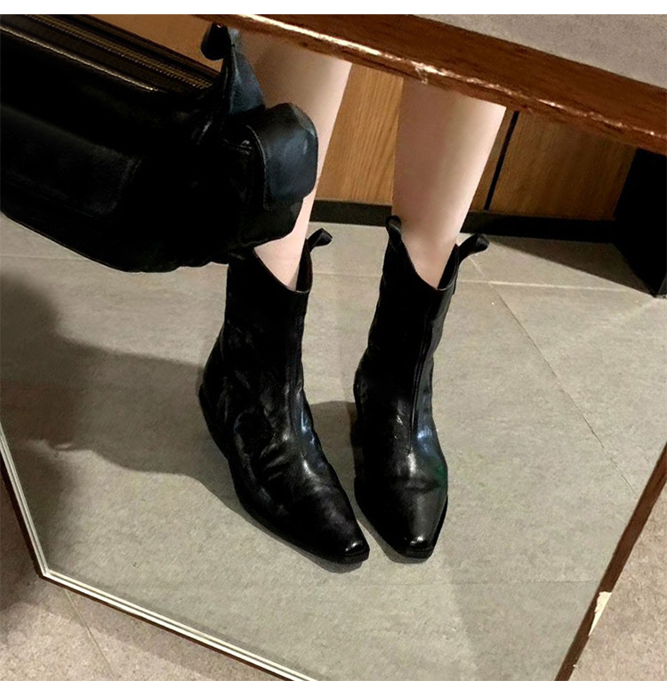 소가죽 버전 ~ 천연가죽 레트로 플리츠 스퀘어토 웨스턴 카우보이부츠 미드카프 라이더부츠 여성용 두꺼운 굽 마틴 다용도