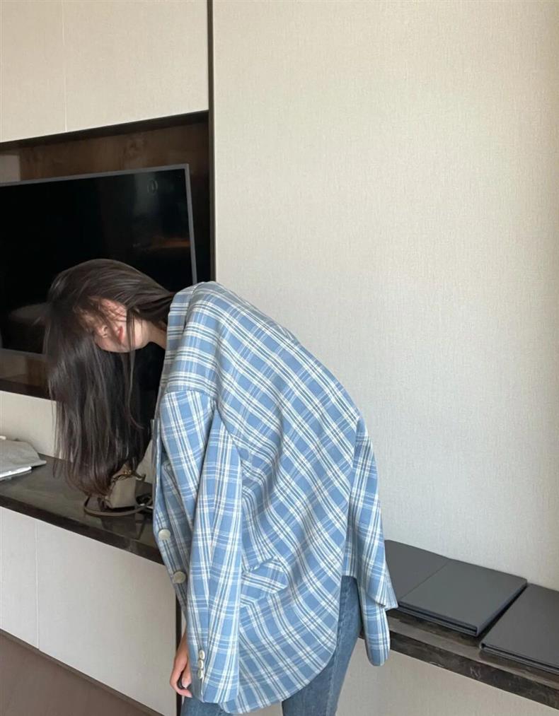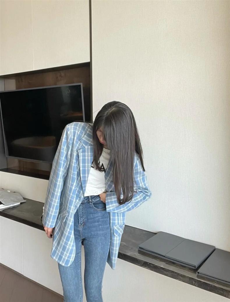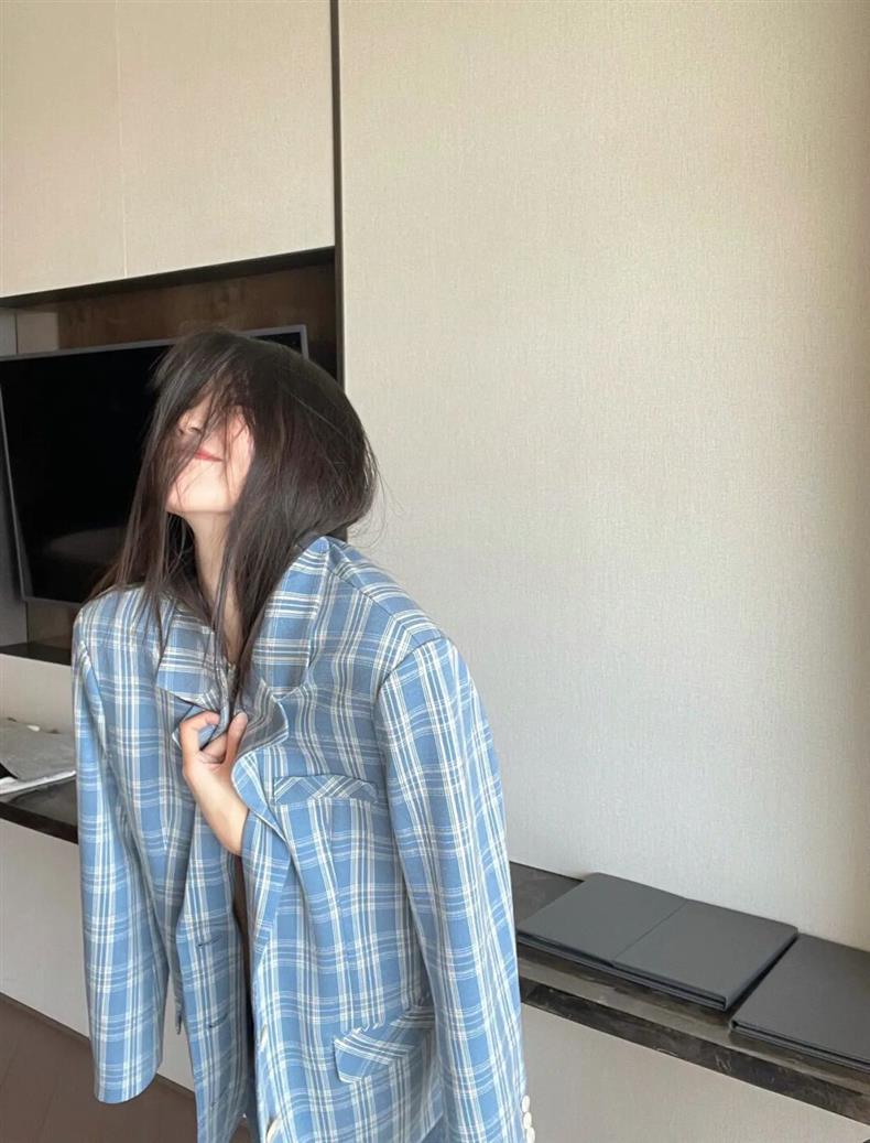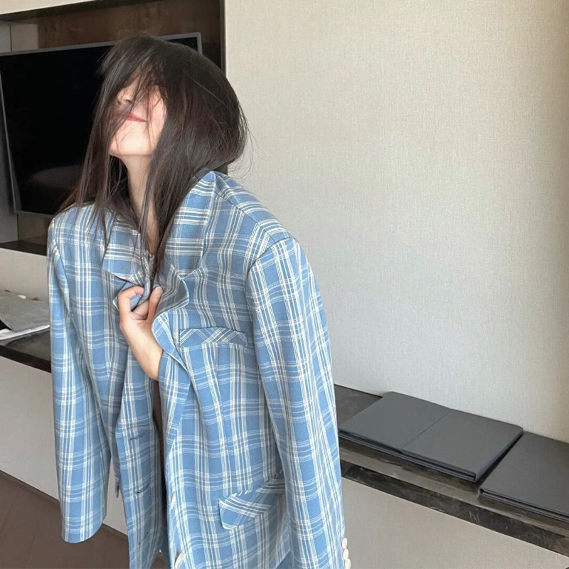 YT21278 봄 2024 새로운 디자인 센스 틈새 시크 탑 한풍 세련된 블루 격자 무늬 세트스토어 가기