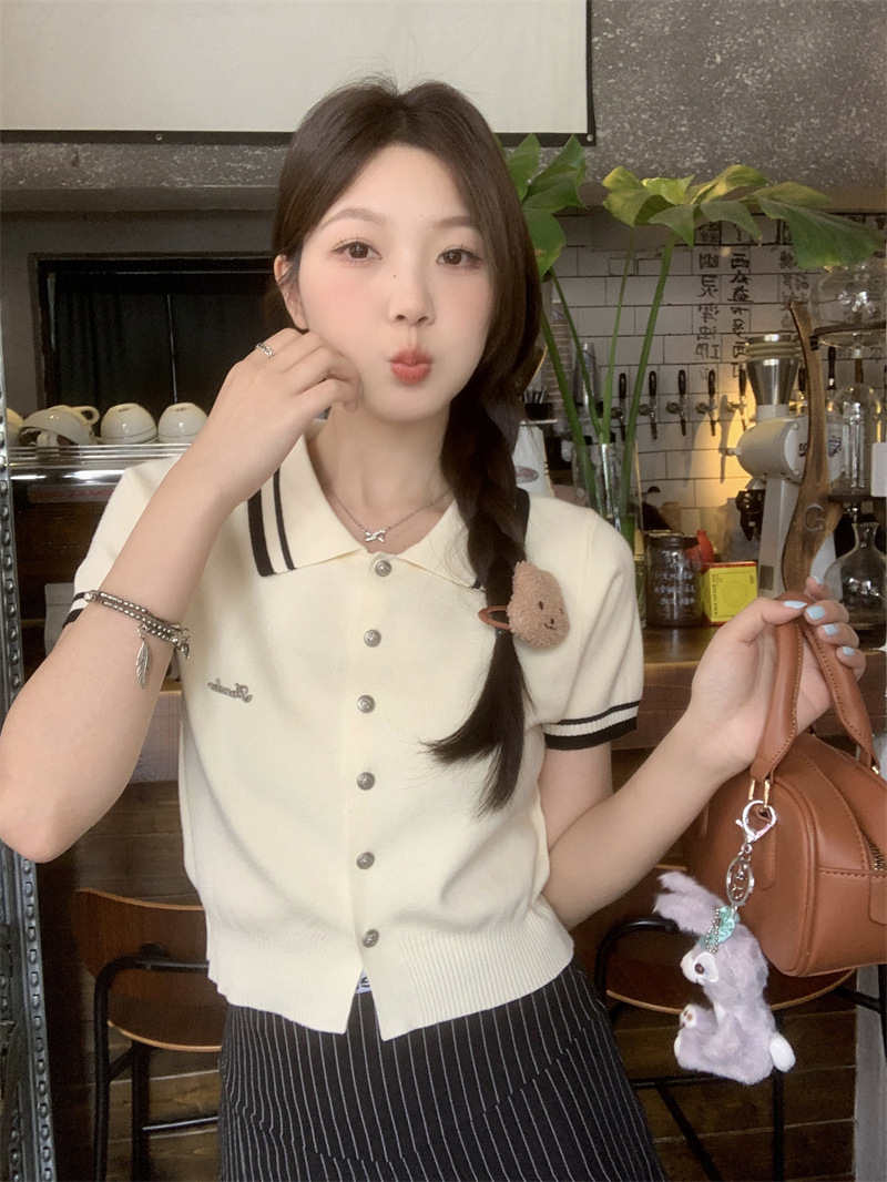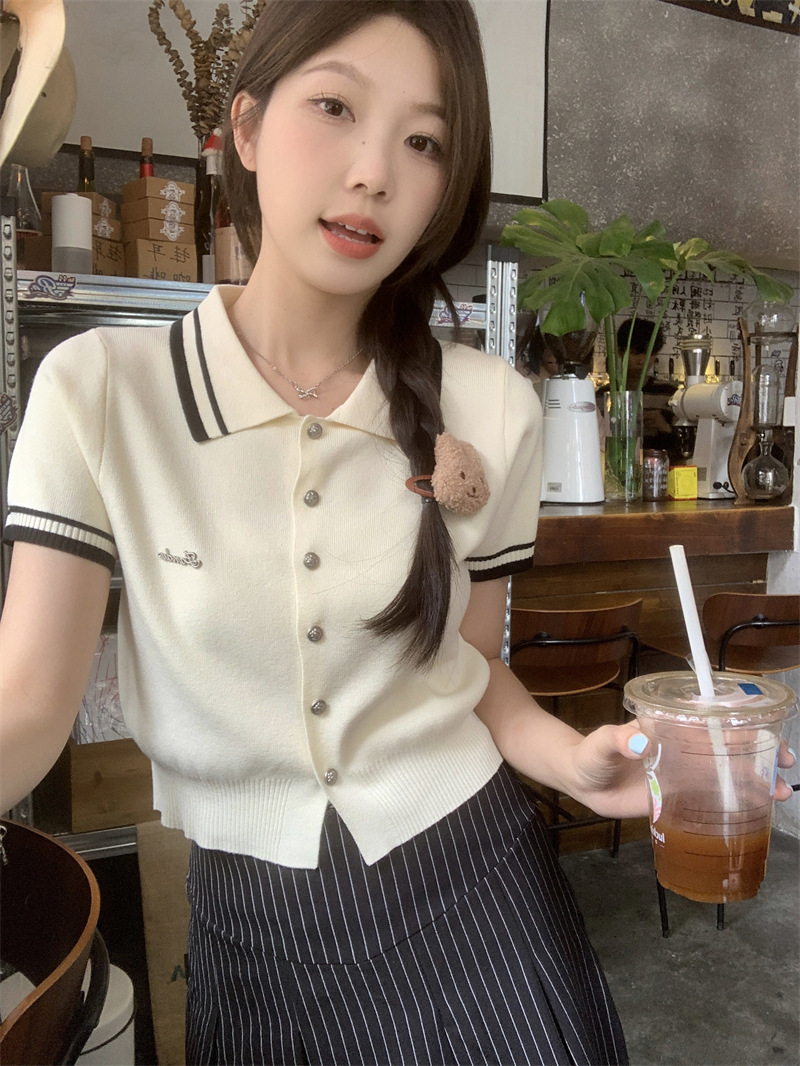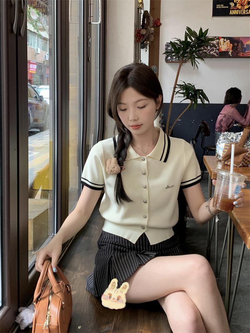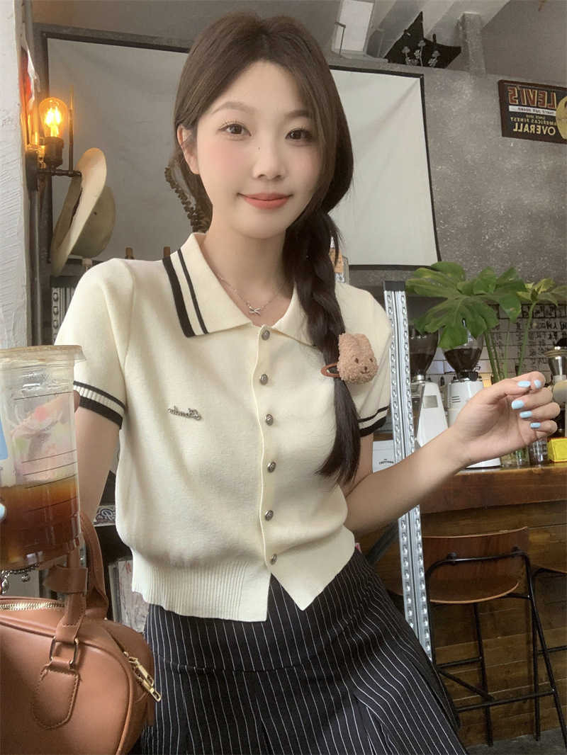 2024 새로운 독특하고 아름다운 프랑스 폴로 칼라 대조 아이스 실크 니트 카디건 반팔 여성용 여름 연령 감소 탑스토어 가기