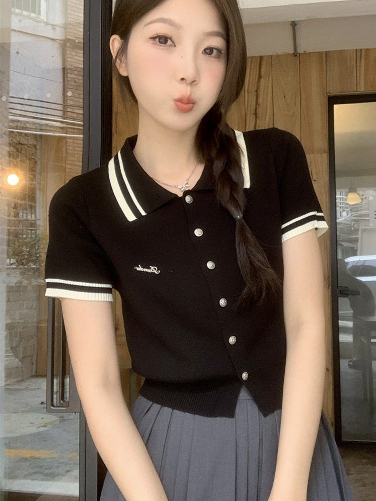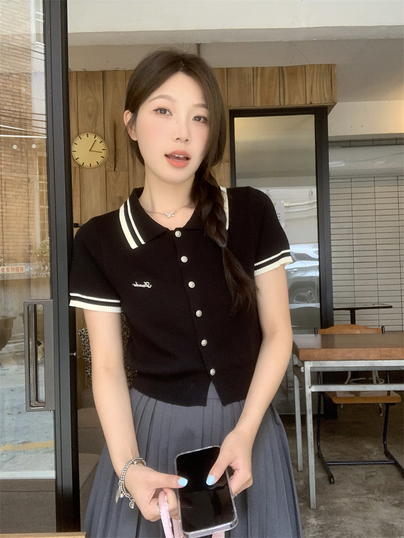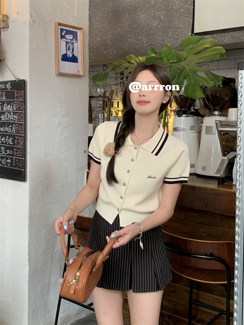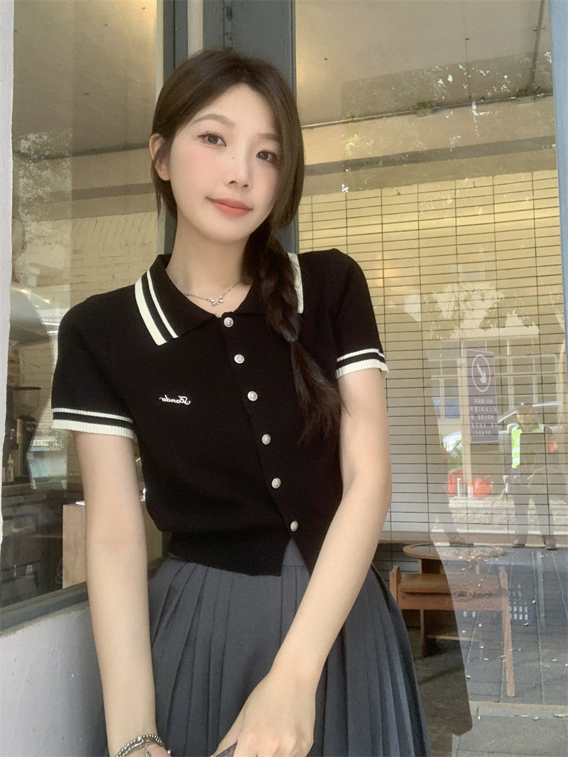2024 새로운 독특하고 아름다운 프랑스 폴로 칼라 대조 아이스 실크 니트 카디건 반팔 여성용 여름 연령 감소 탑스토어 가기