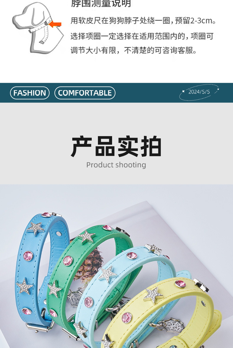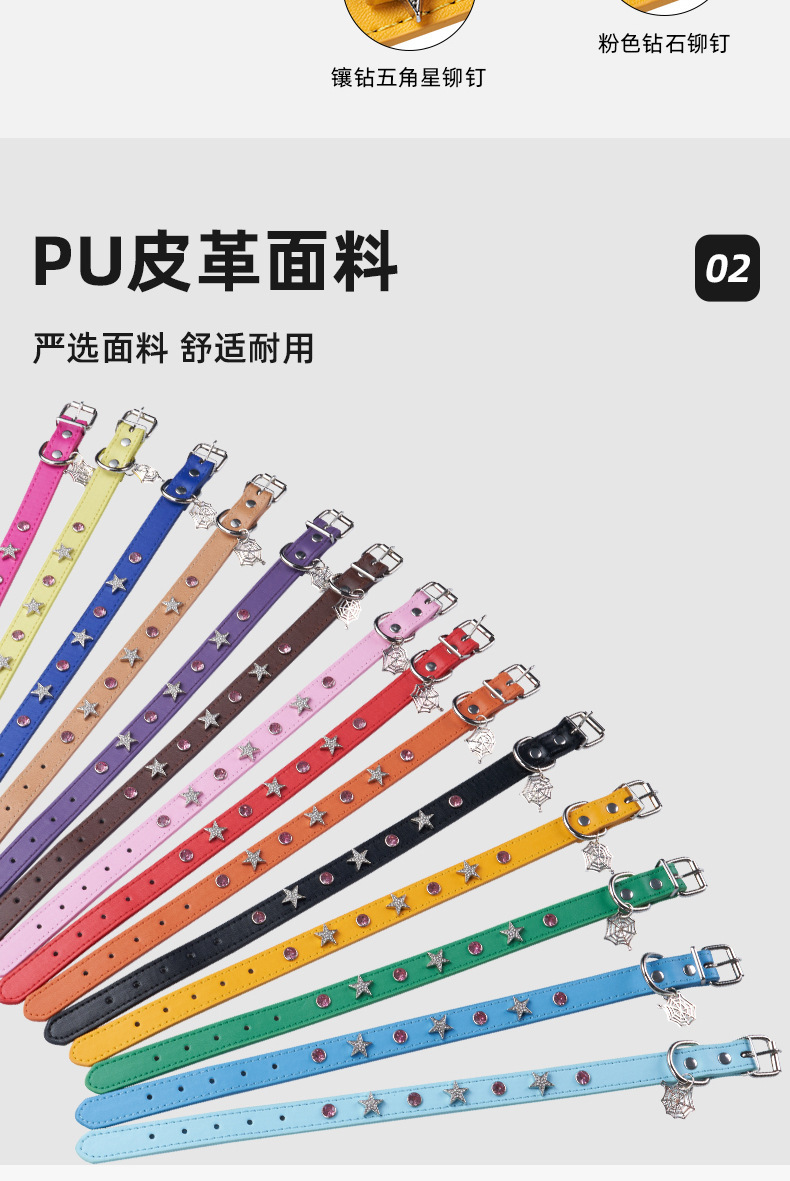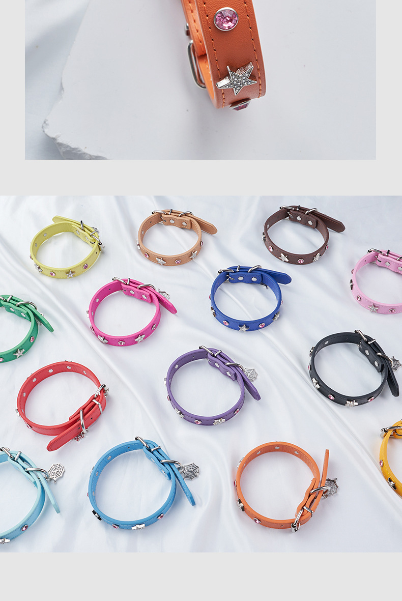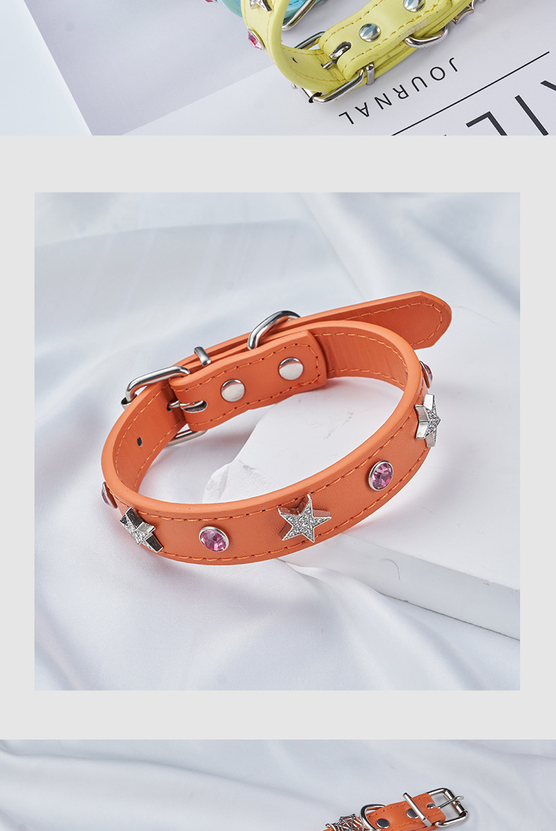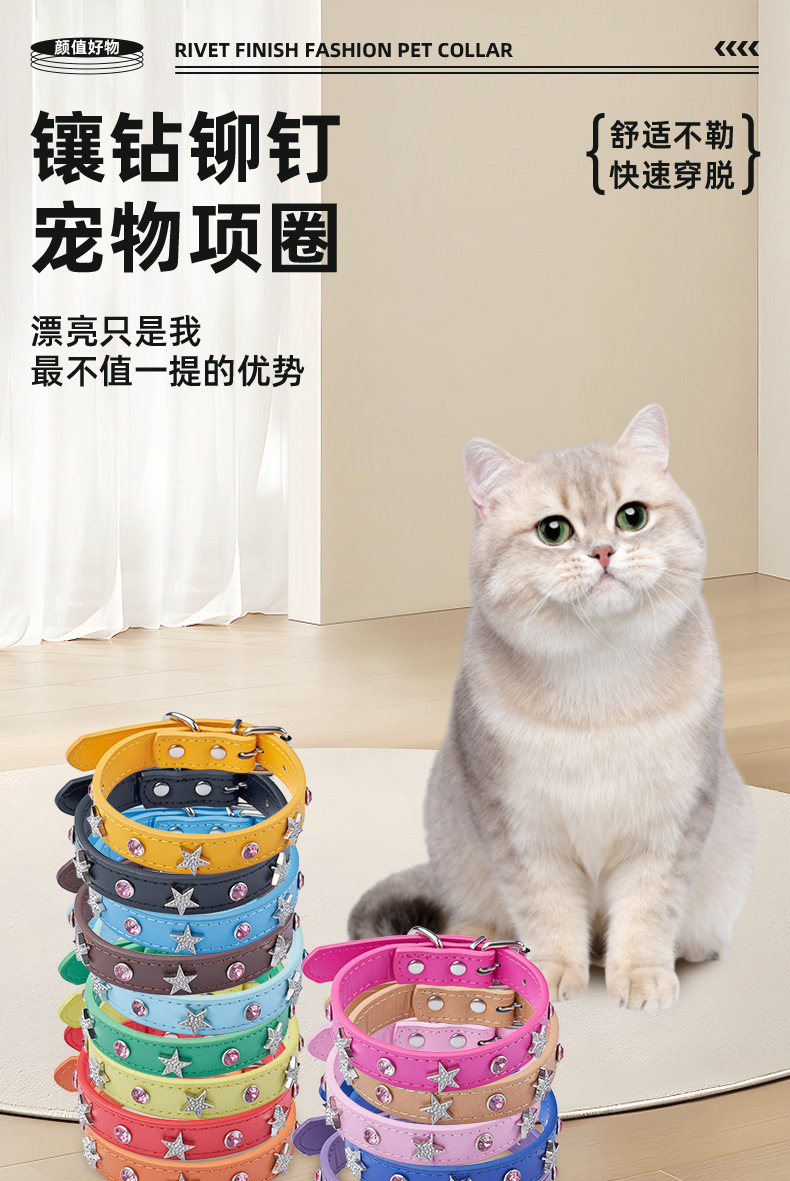 새로운 고양이 애완동물 목걸이, 다이아몬드가 박힌 분홍색 오각별 리벳, 강아지 용품 가죽 목걸이, 새끼 고양이용