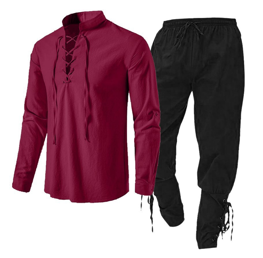 2025 남성용 긴팔 유럽 사이즈 코튼 린넨 헨리 셔츠 캐주얼 비치 스탠드 칼라 셔츠 솔리드 컬러 투피스 세트 재고 있음