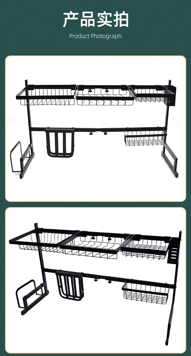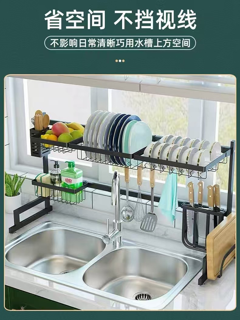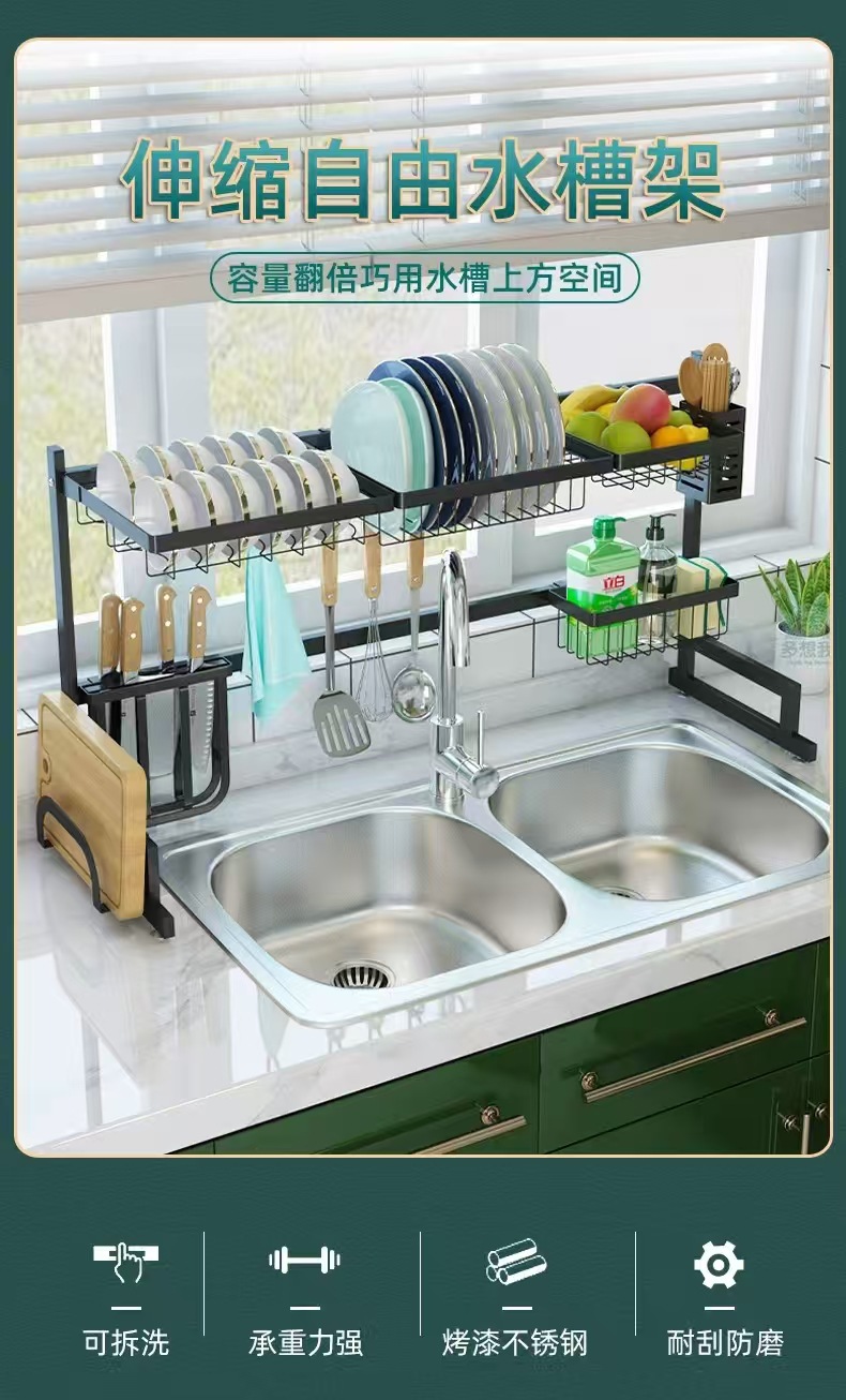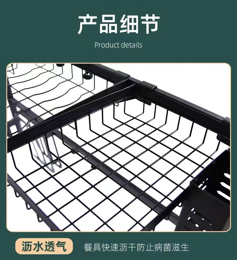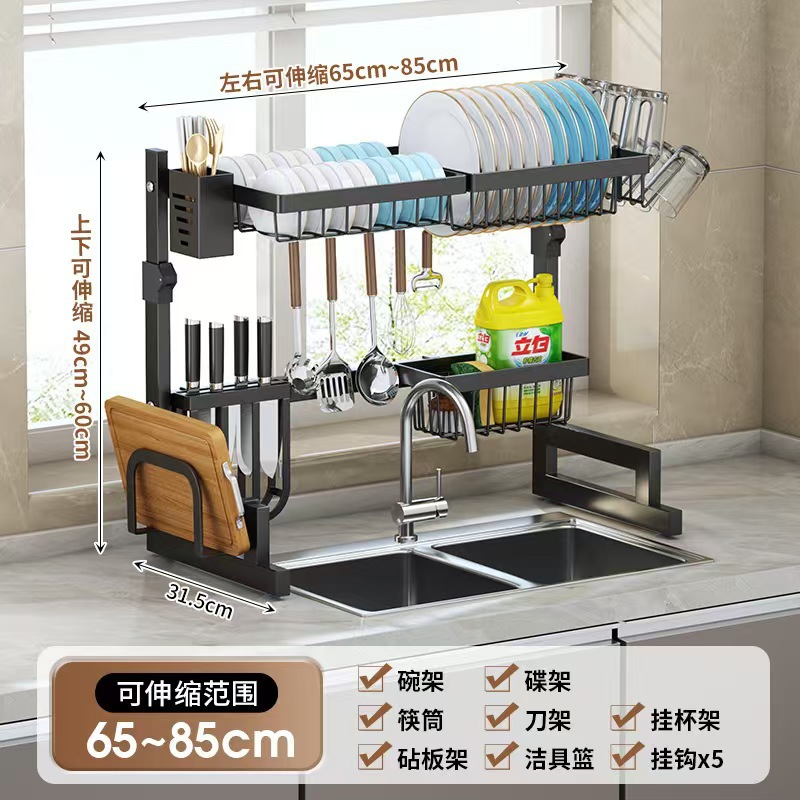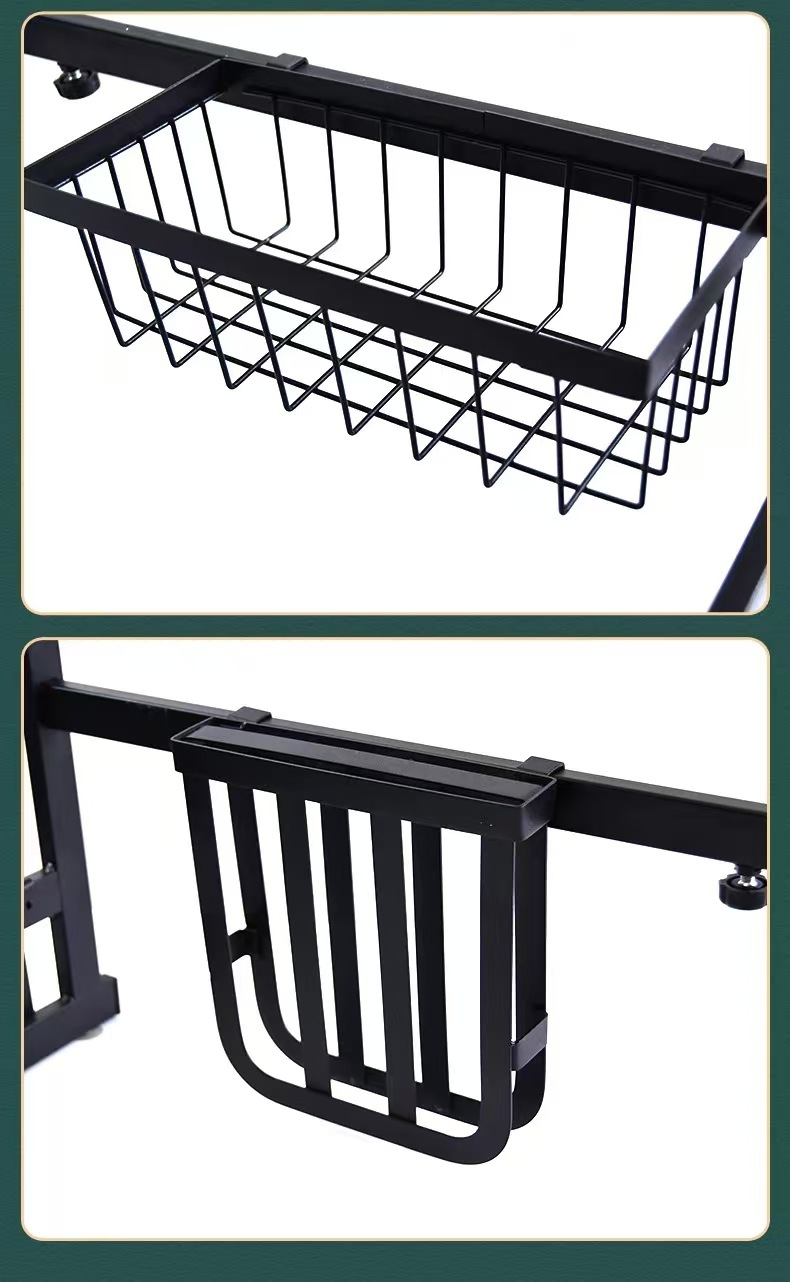 국경 간 동일 스타일의 텔레스코픽 주방 싱크 블랙 스토리지 랙 스테인레스 스틸 드레인 랙 칼 세척 및 보관 랙스토어 가기