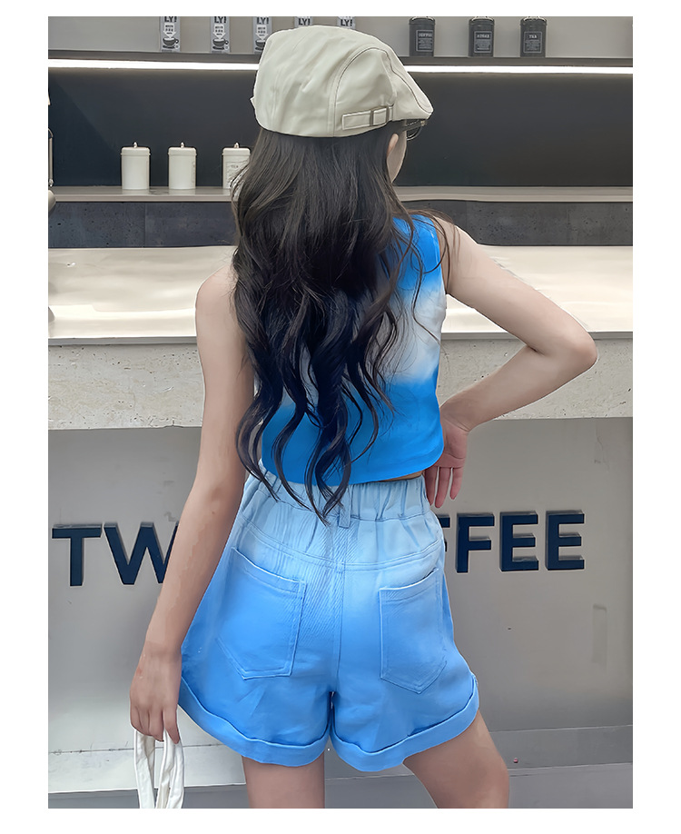 여자 달콤한 쿨 스파이스 소녀 패션 세트 2024 여름 새로운 미들 빅 키즈 도파민 데님 반바지 조끼 그라디언트스토어 가기