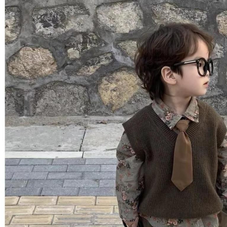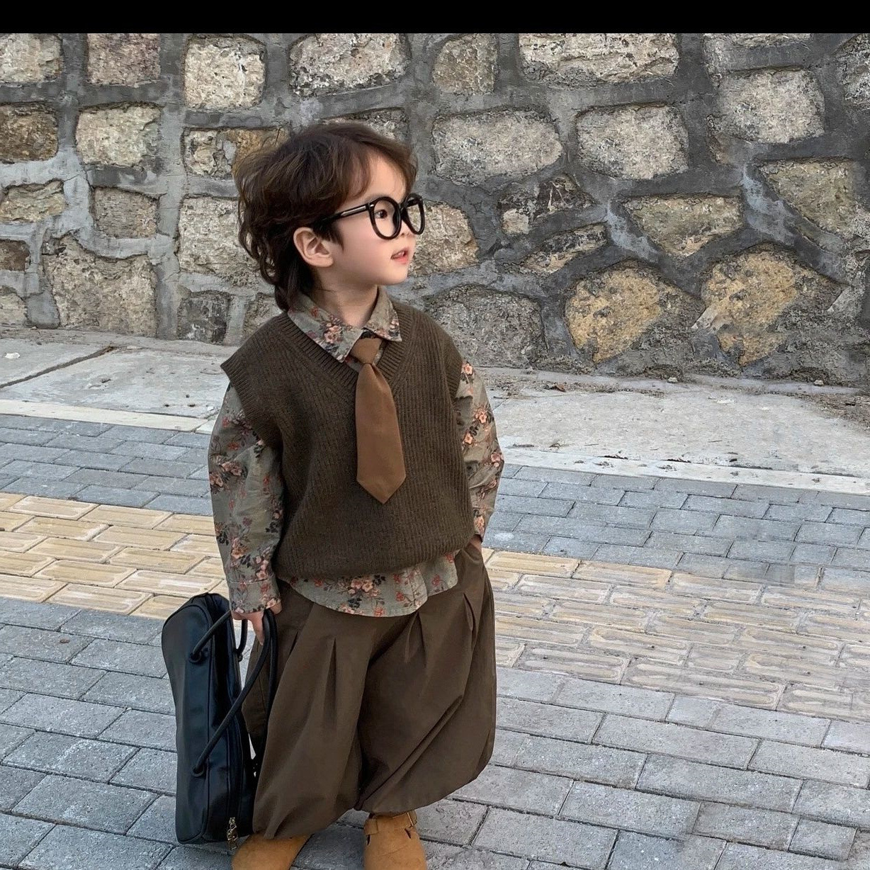 남아 2025 가을 아기 세트 긴팔 셔츠 니트 조끼 세련된 캐주얼 바지 유아용 3종 세트 트렌디스토어 가기