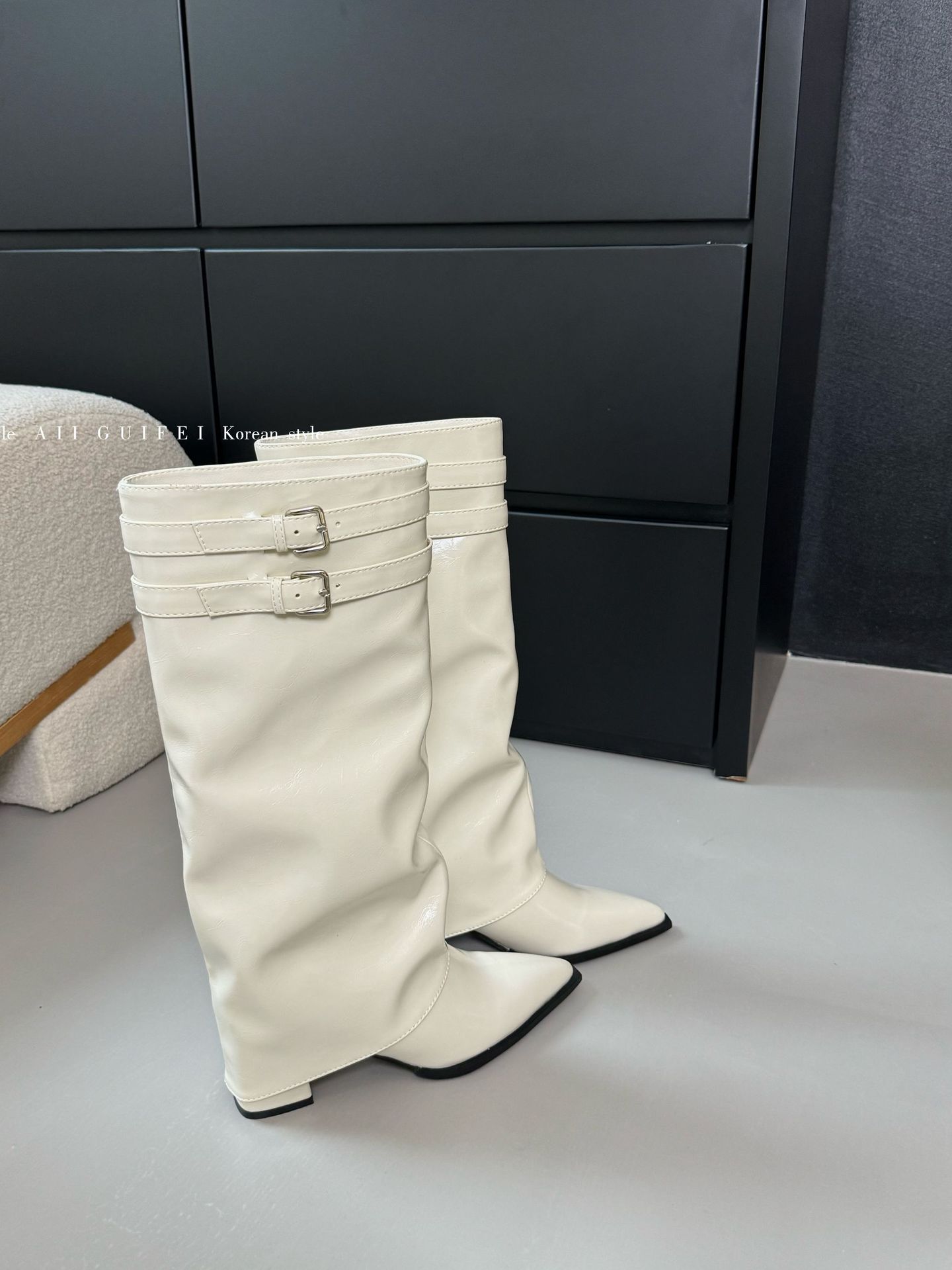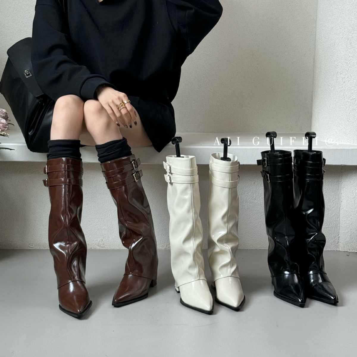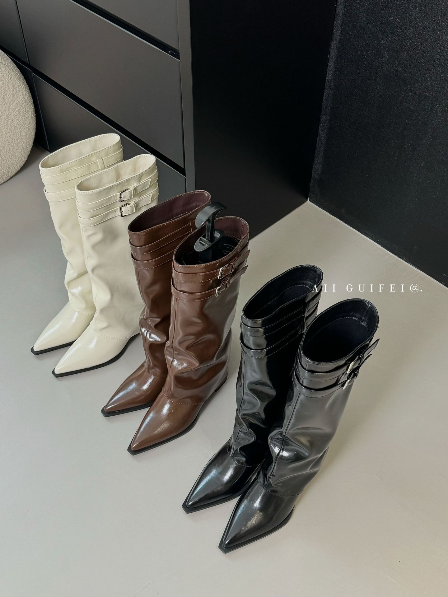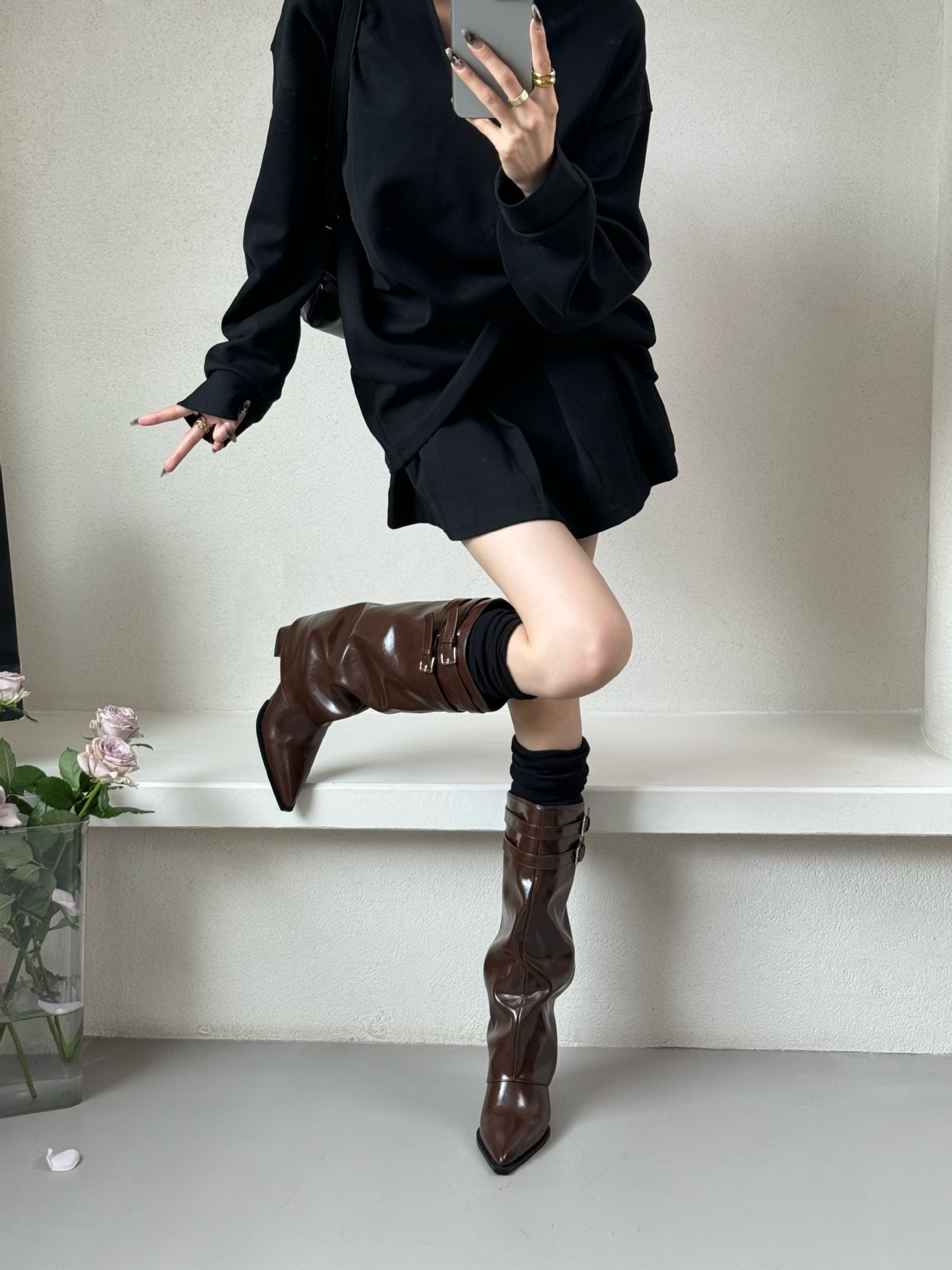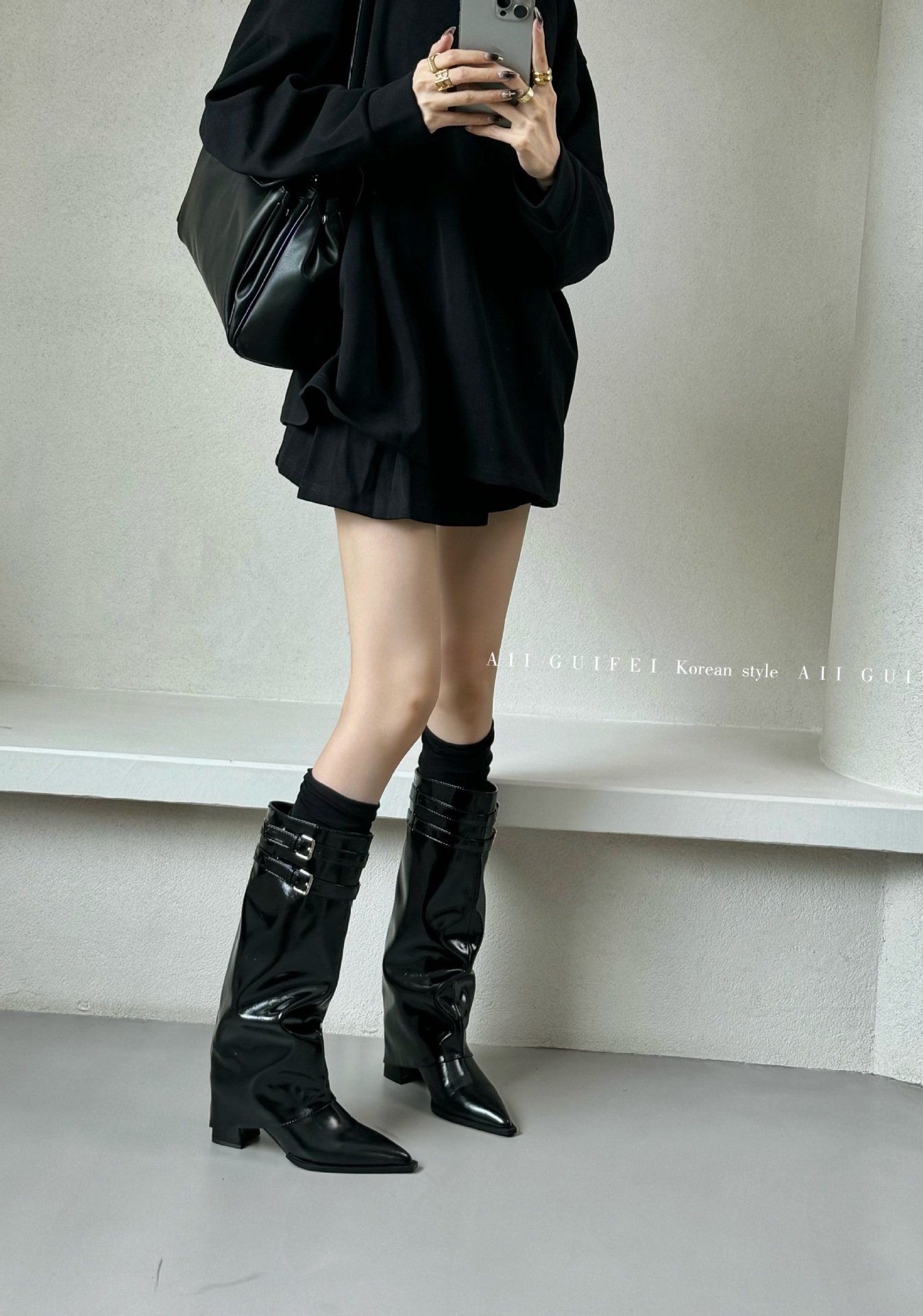 한국 패션 팬츠 부츠 얇은 미드 힐 부츠를 가리키고 있지만 무릎 기질 올 매치 벨트 버클 슬리브 패션 부츠스토어 가기