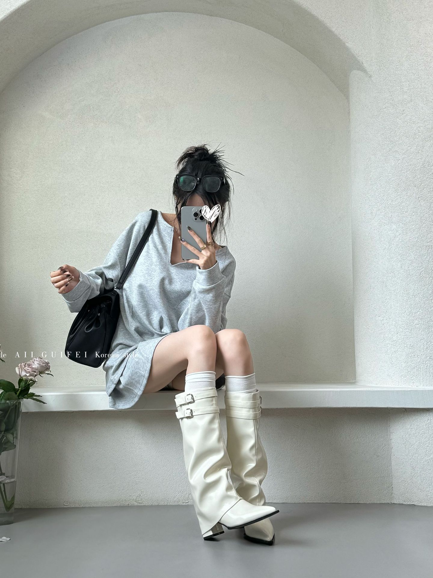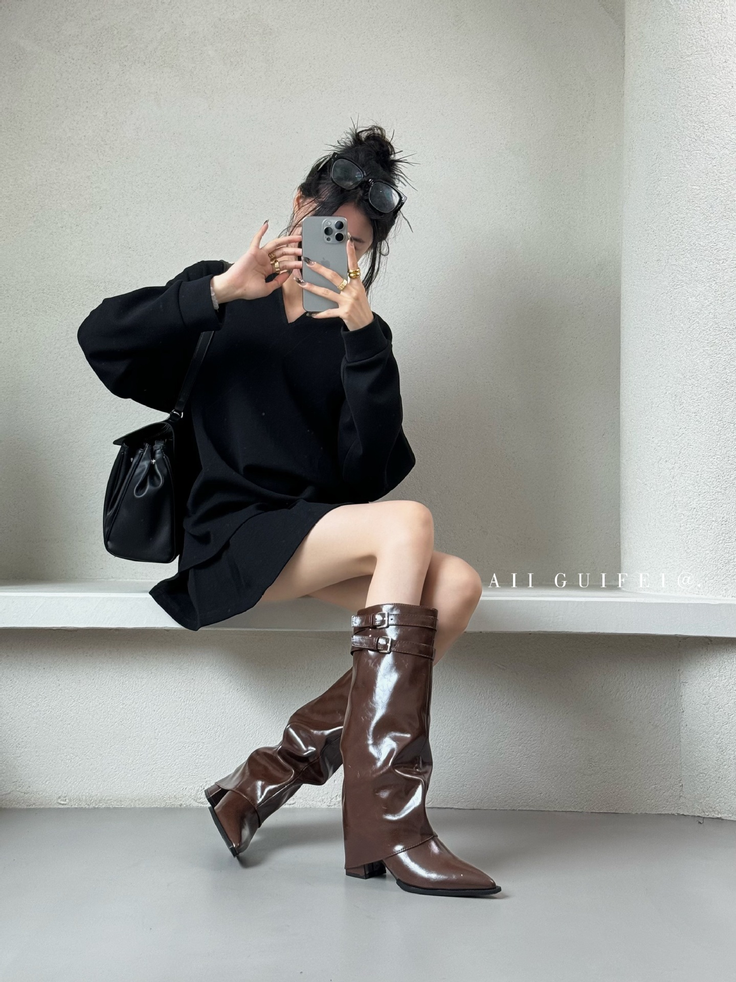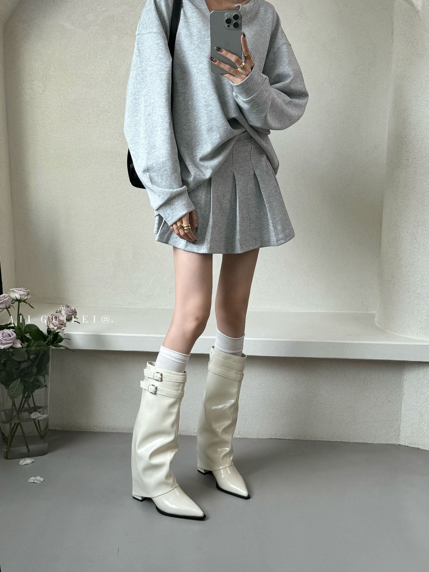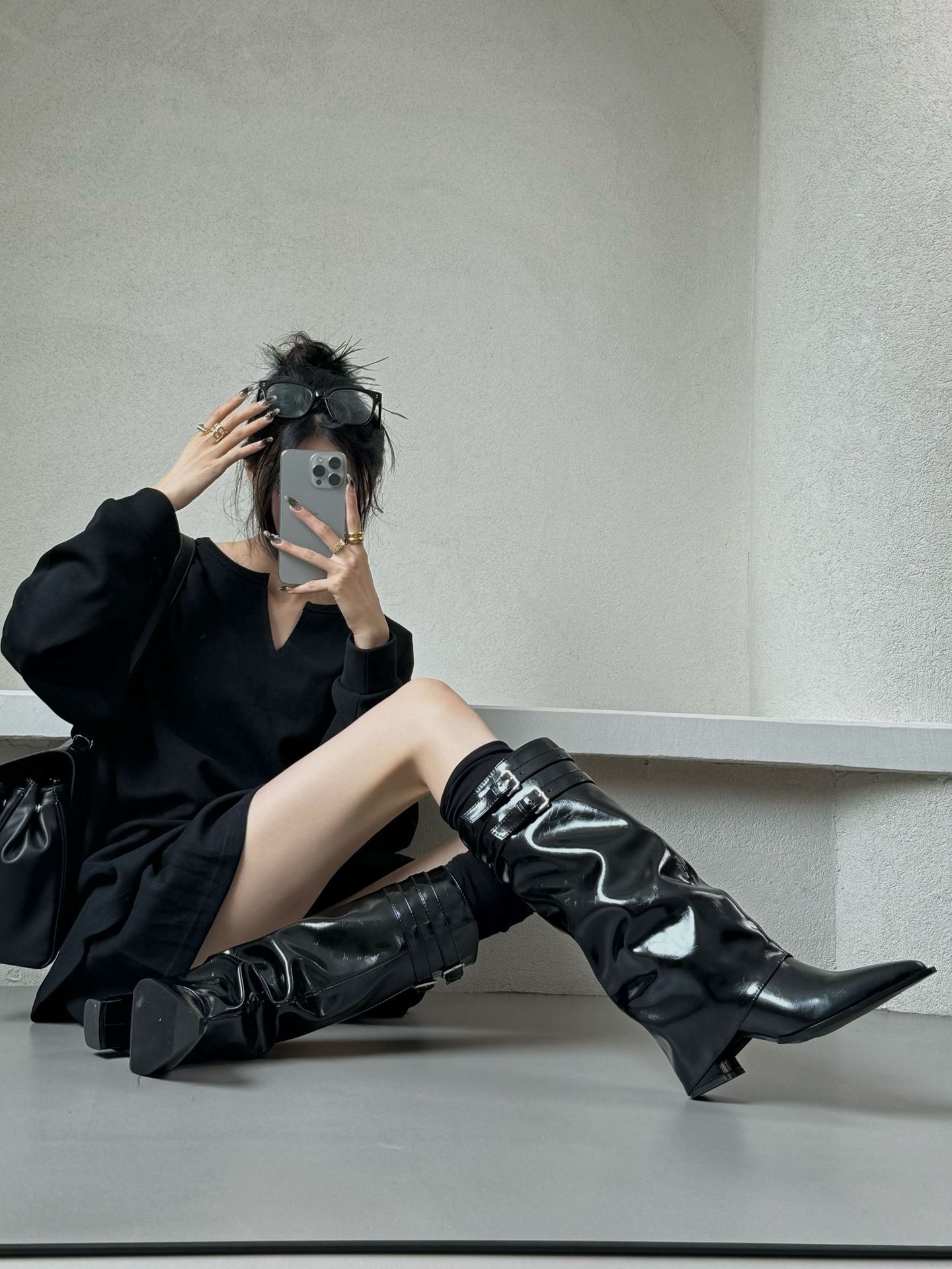 한국 패션 팬츠 부츠 얇은 미드 힐 부츠를 가리키고 있지만 무릎 기질 올 매치 벨트 버클 슬리브 패션 부츠스토어 가기