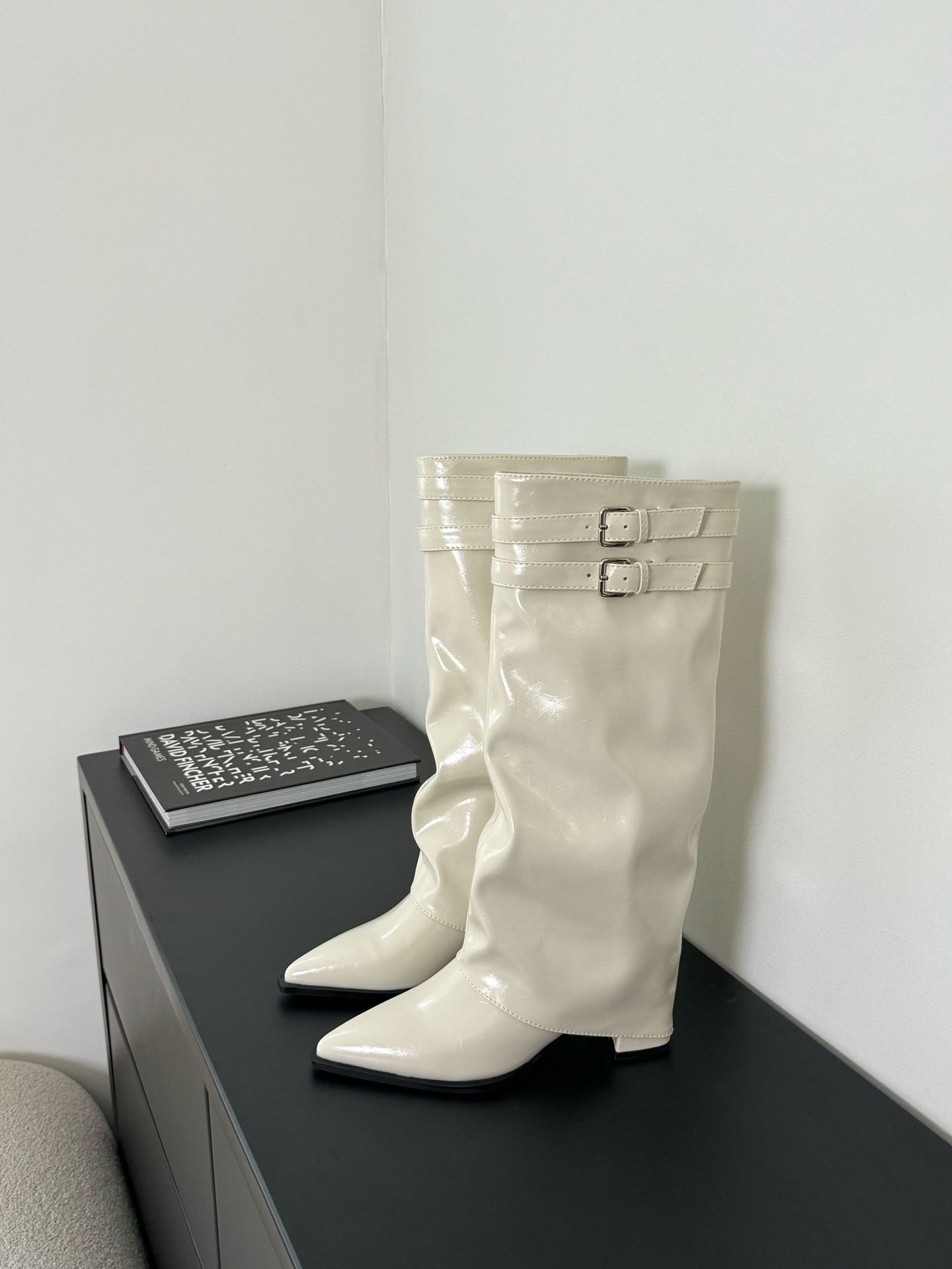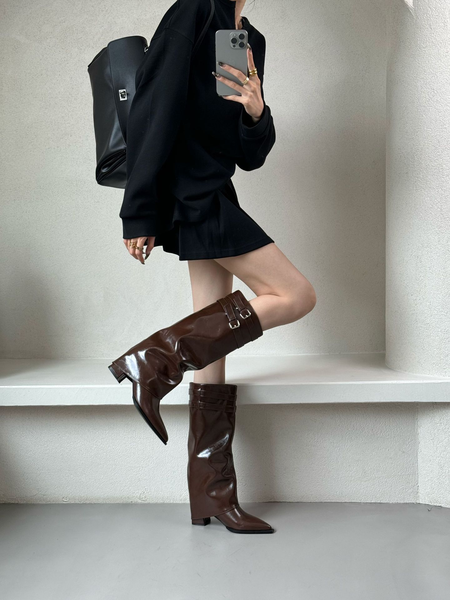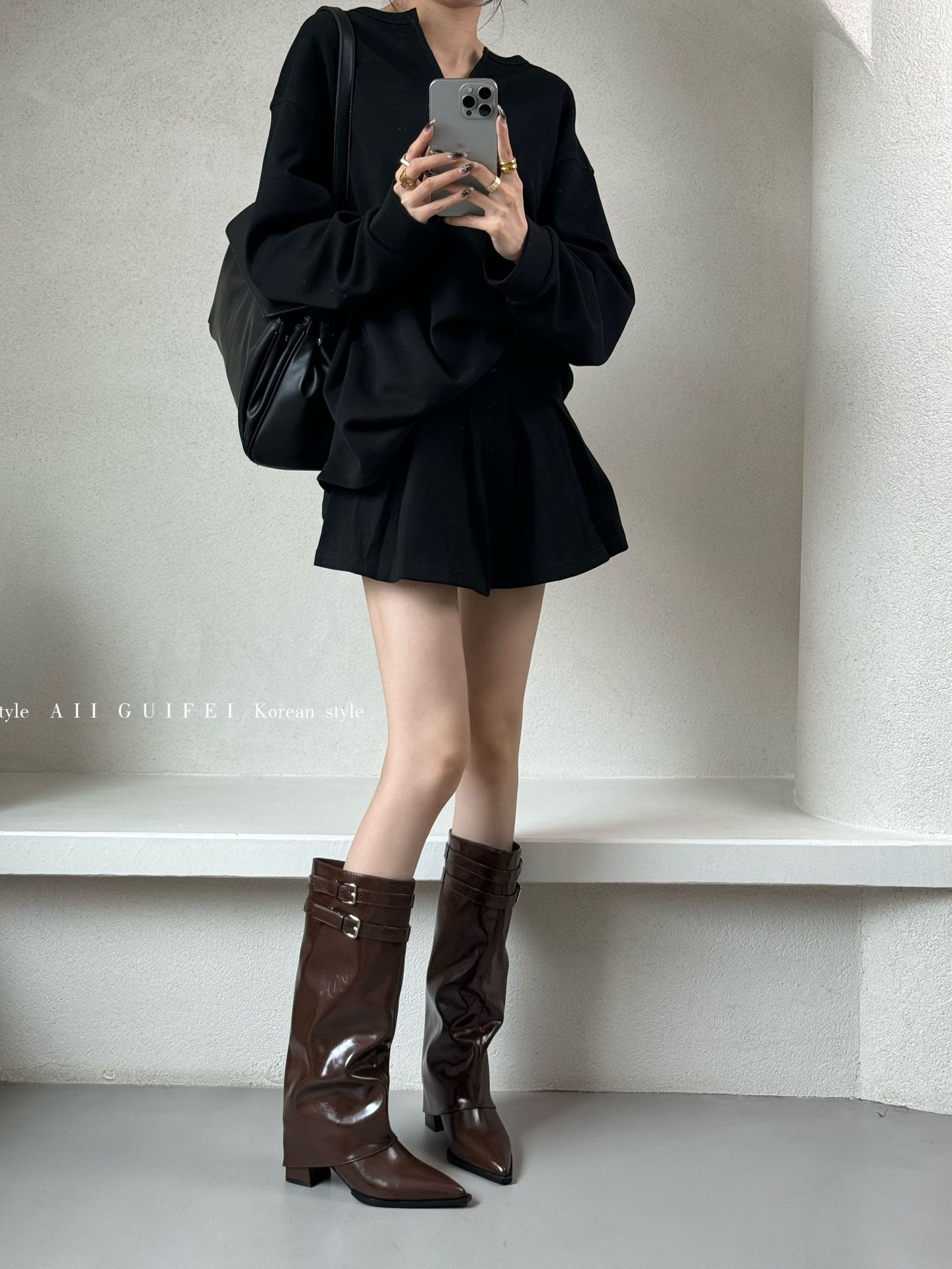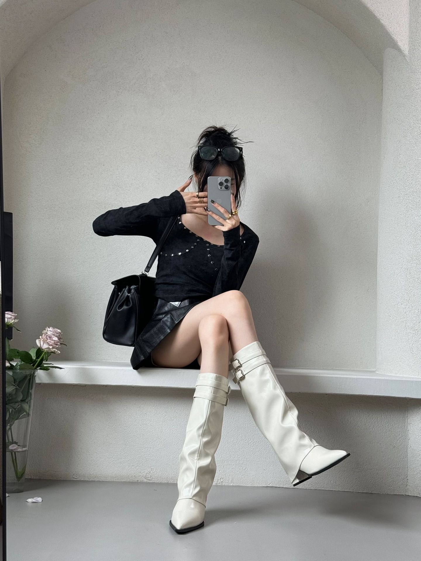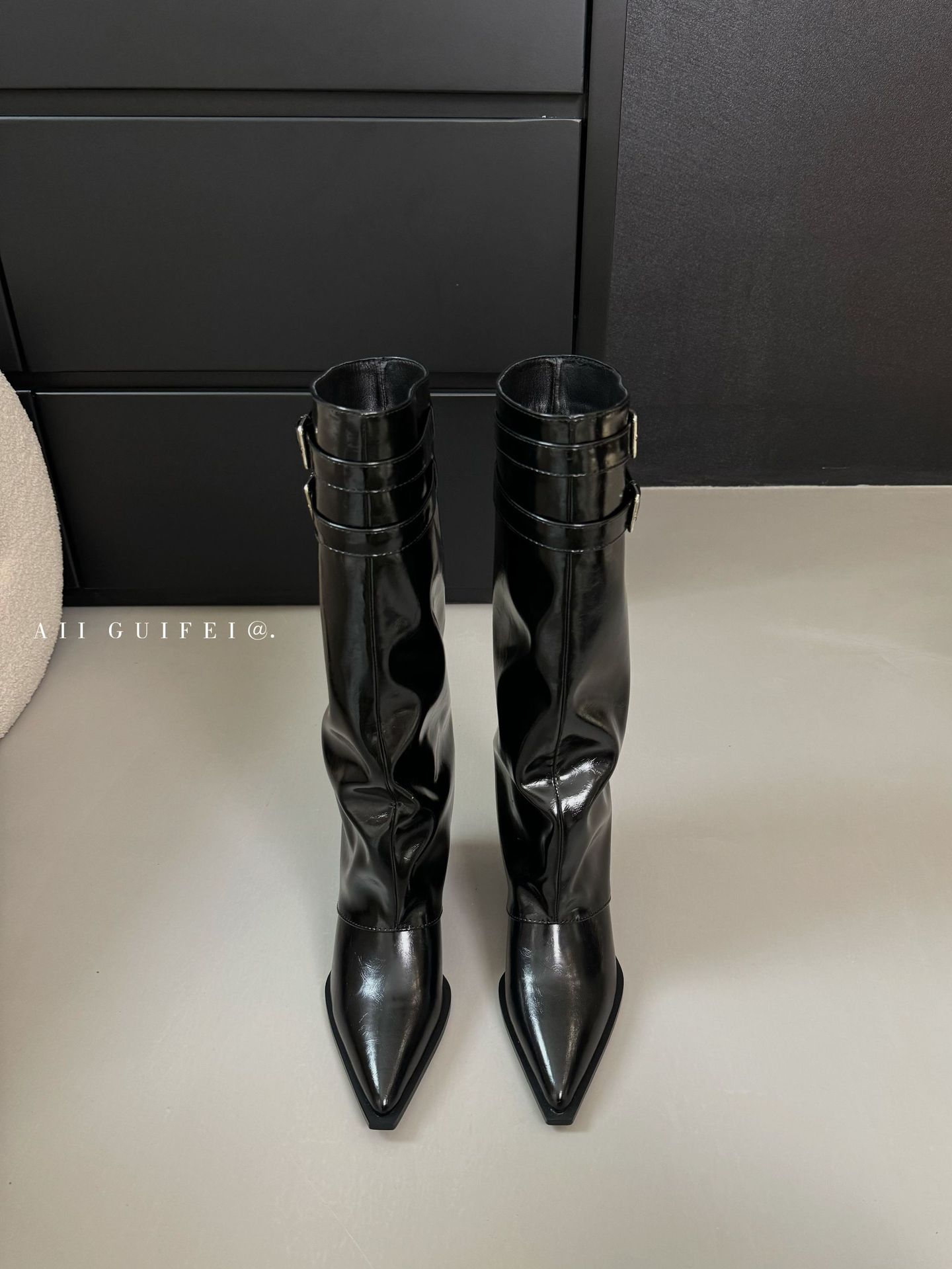 한국 패션 팬츠 부츠 얇은 미드 힐 부츠를 가리키고 있지만 무릎 기질 올 매치 벨트 버클 슬리브 패션 부츠스토어 가기