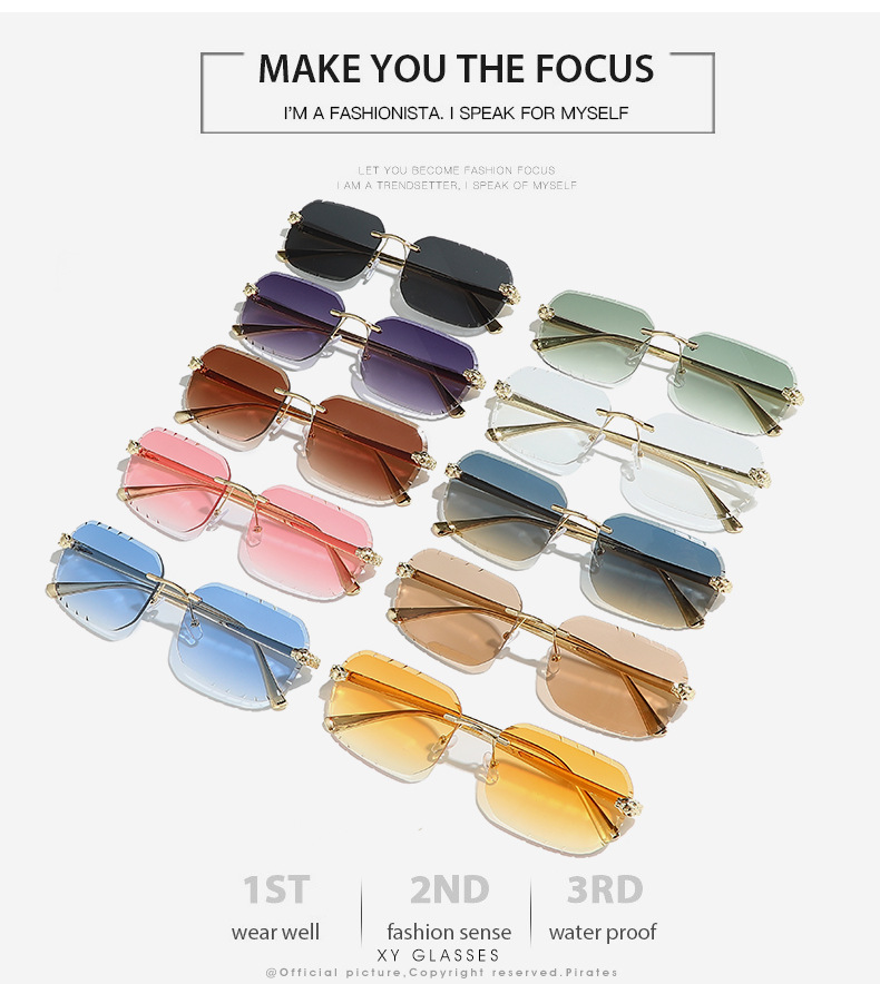 2024 국경을 넘는 새로운 무테 선글라스 남성 유럽과 미국 패션 스퀘어 컷 엣지 올 매치 선글라스 여성용 선글라스