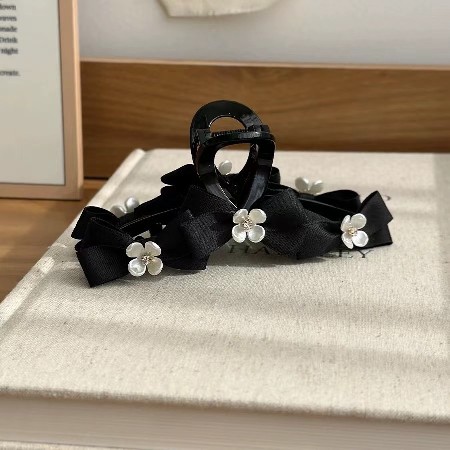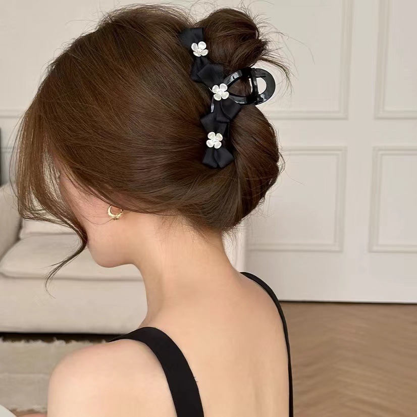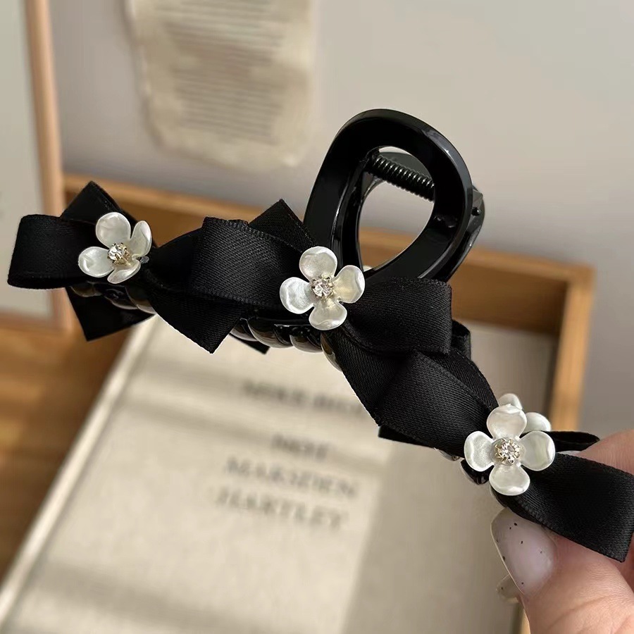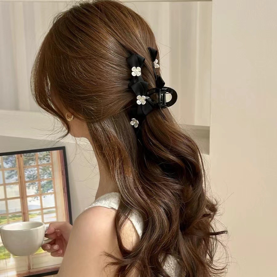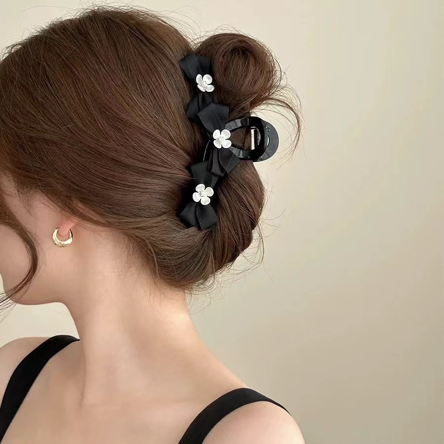 高级感缎面大号黑色蝴蝶结鲨鱼夹头饰方形钻后脑勺发夹抓夹女发卡