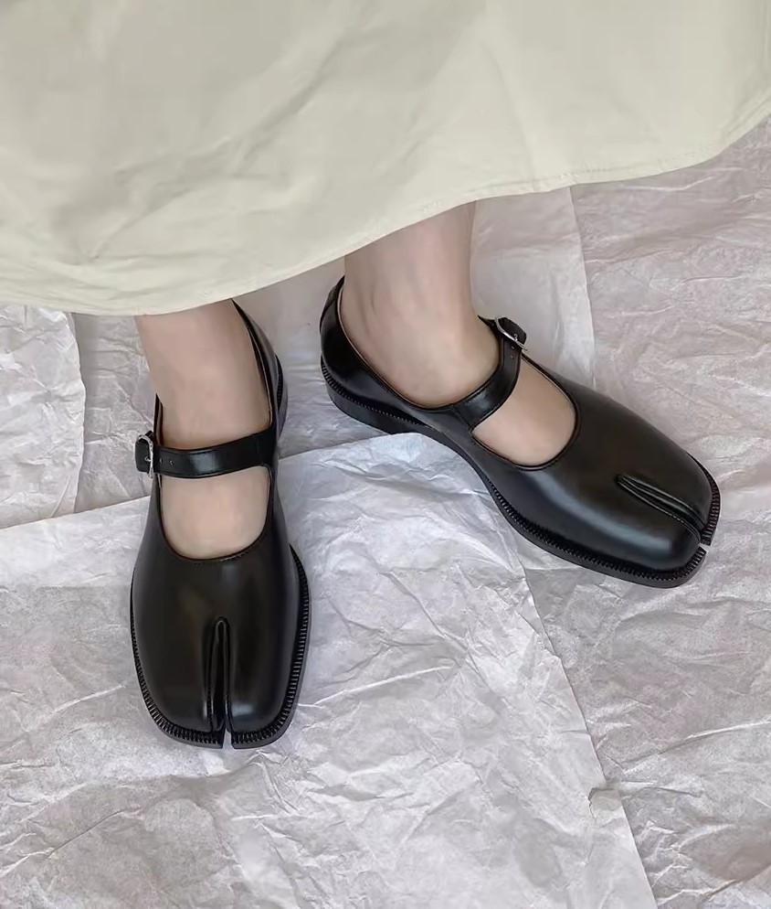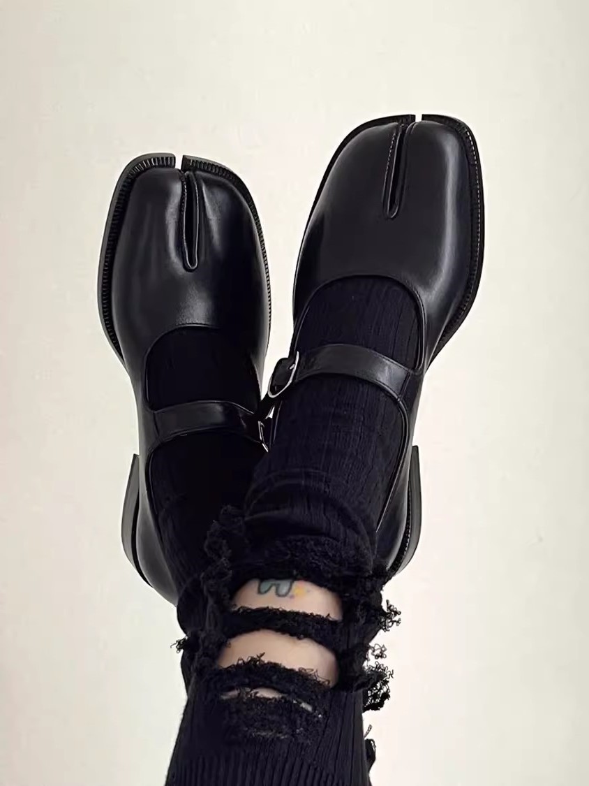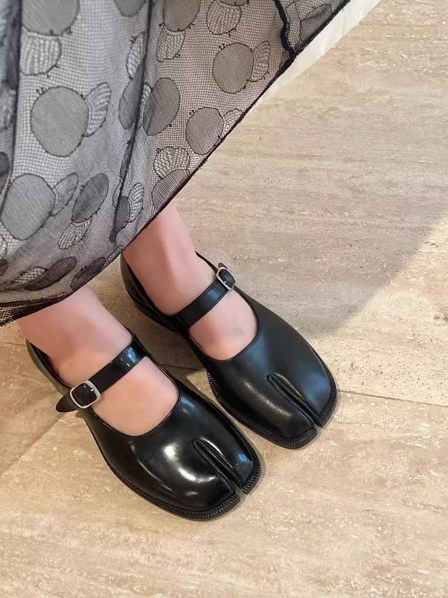 매기 스플릿 발가락 신발 복고풍 가죽 스트랩 메리 제인 신발 여성 돼지 족보 말굽 두꺼운 뒤꿈치 작은 가죽 신발 타비