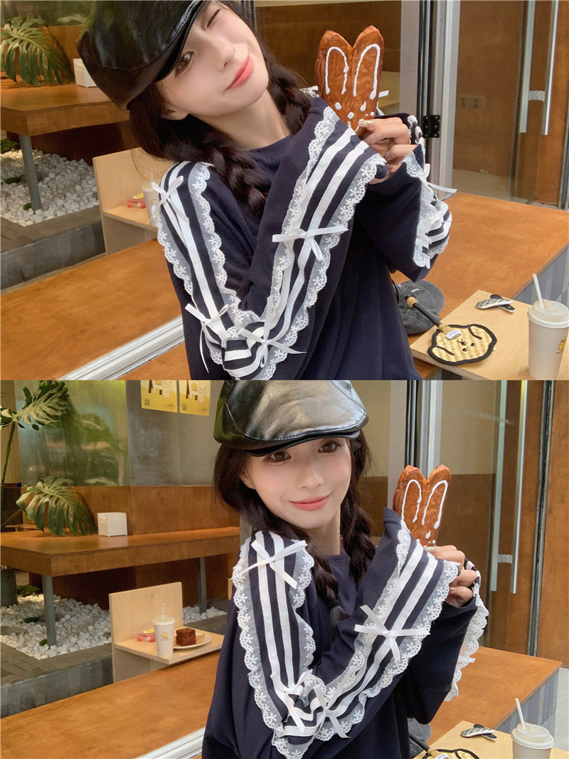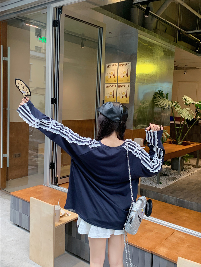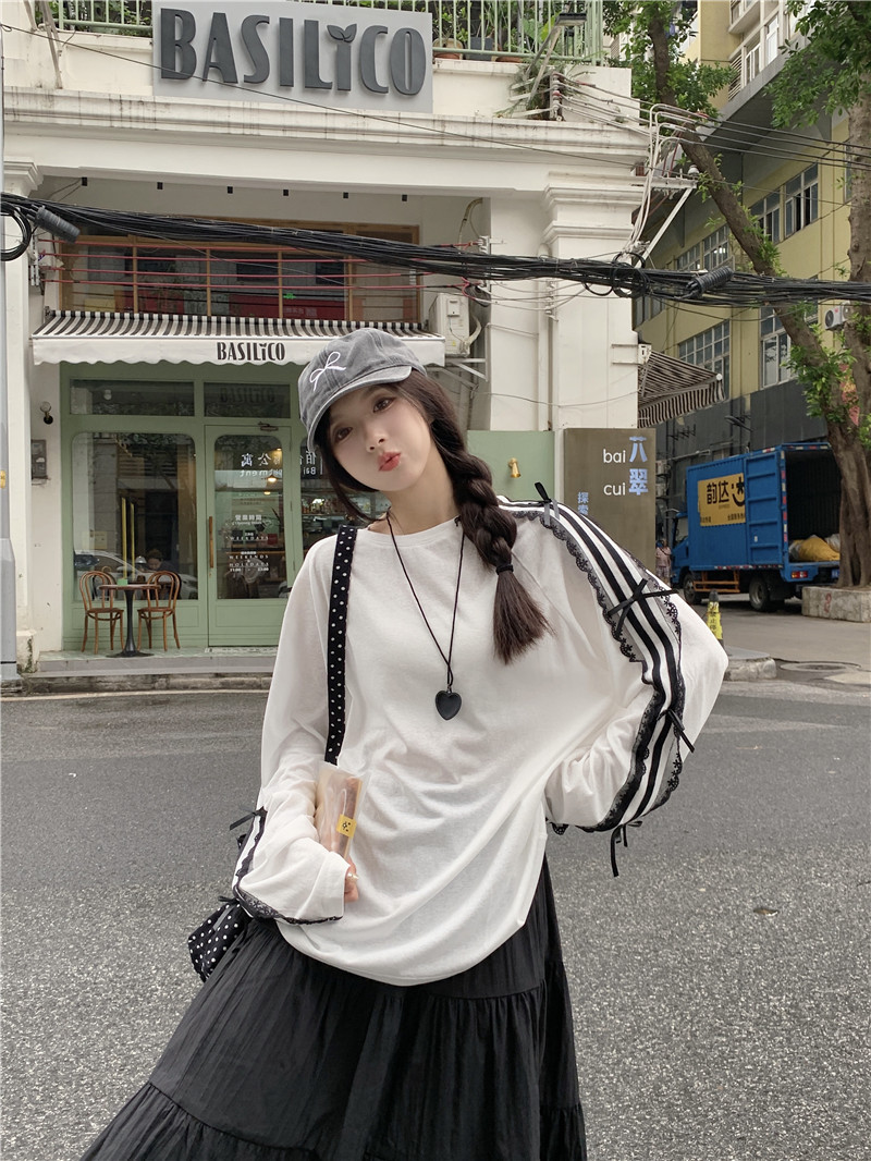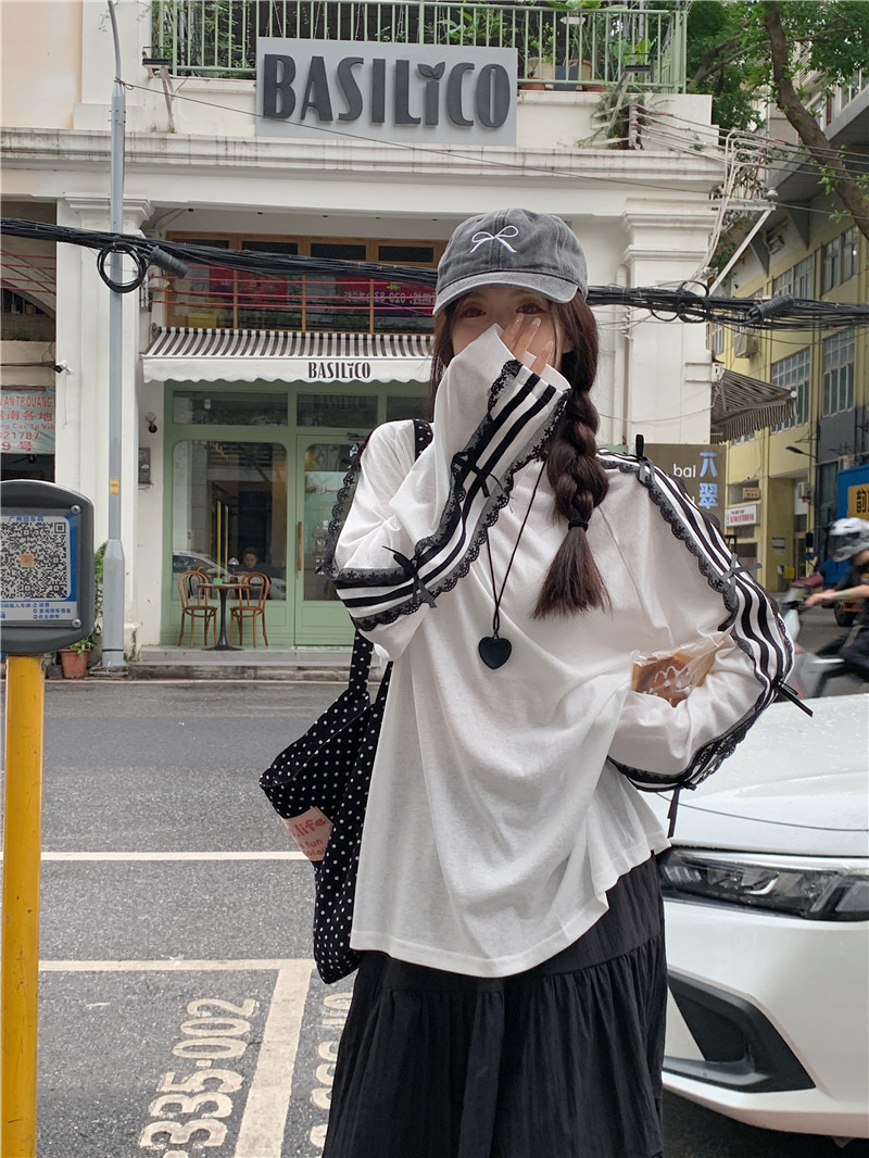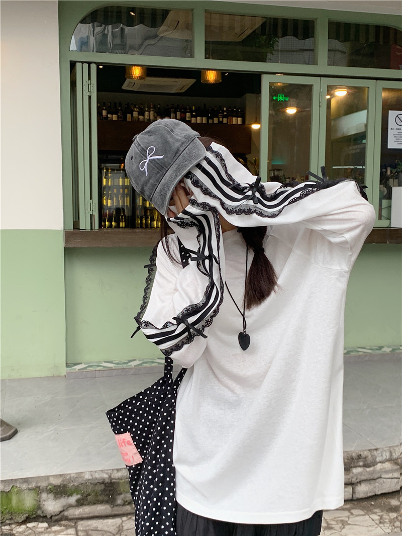 레이스 스트라이프 활 긴팔 티셔츠 여성 여름 한국 스타일 캐주얼 루즈 중간 길이 디자인 센스 탑스토어 가기