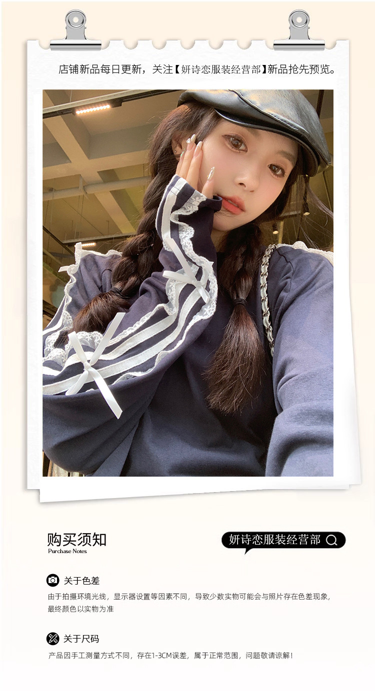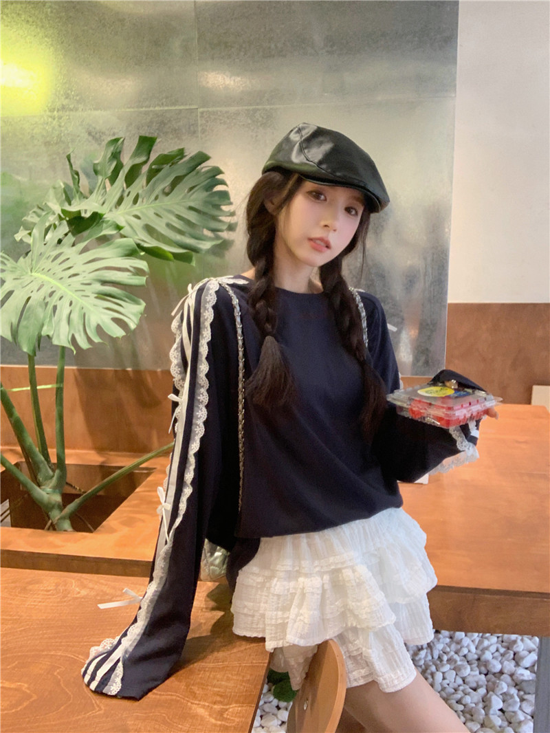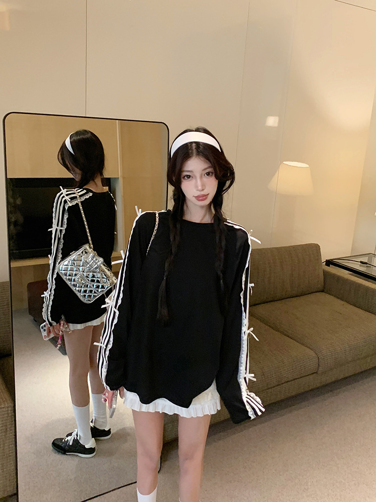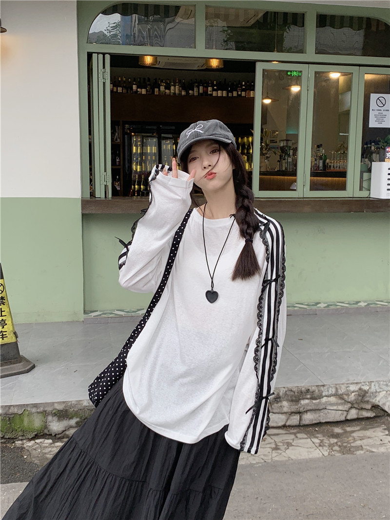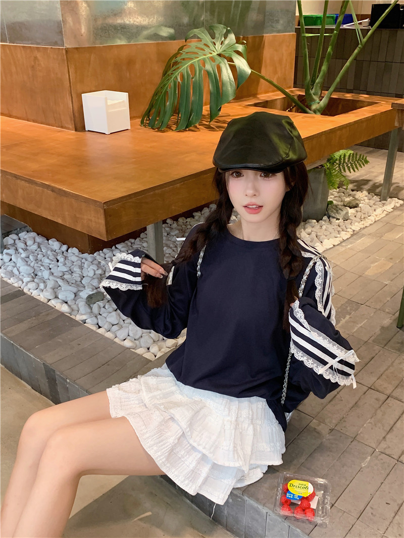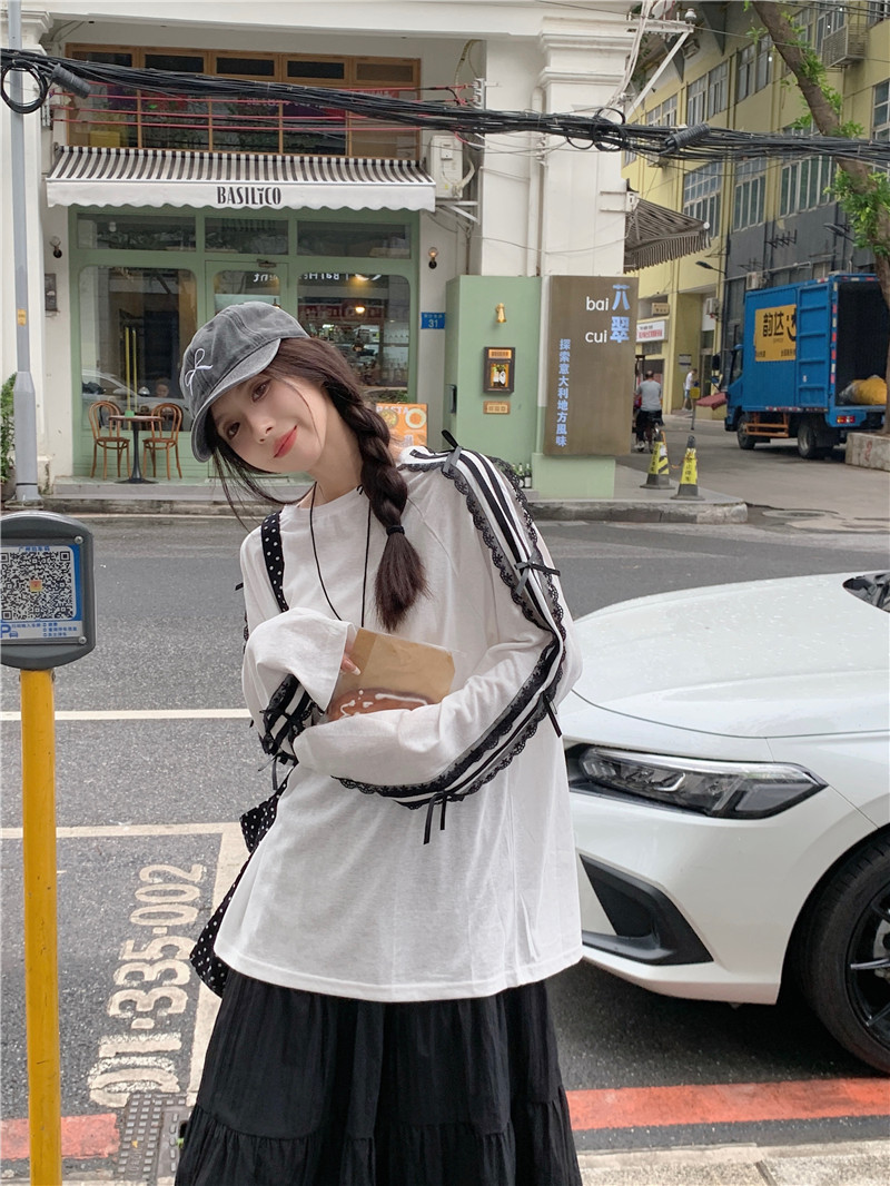 레이스 스트라이프 활 긴팔 티셔츠 여성 여름 한국 스타일 캐주얼 루즈 중간 길이 디자인 센스 탑스토어 가기