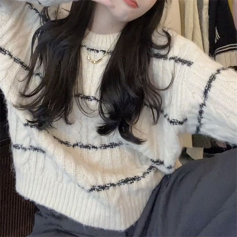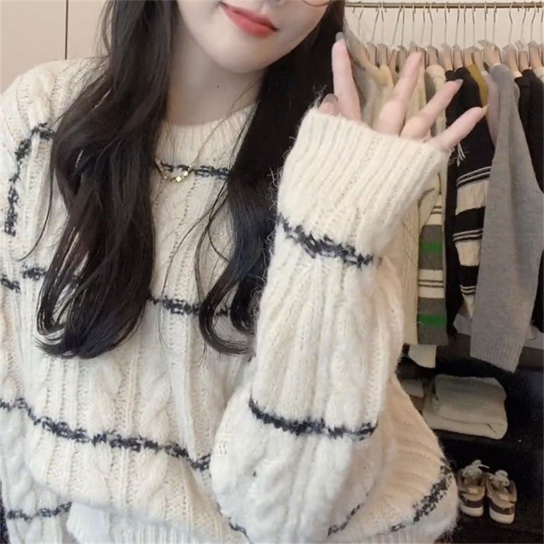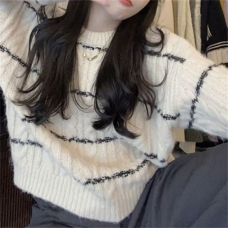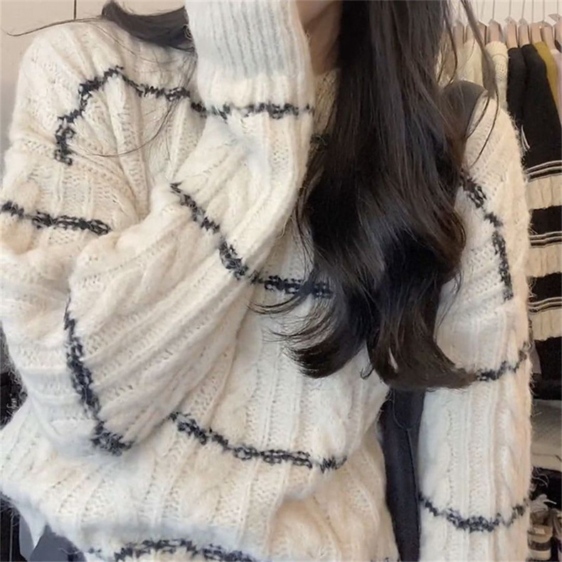 게으른 줄무늬 풀오버 스웨터 여성의 2024 가을과 겨울 디자인 센스 새로운 느슨한 틈새 달콤한 스타일 스웨터 탑스토어 가기