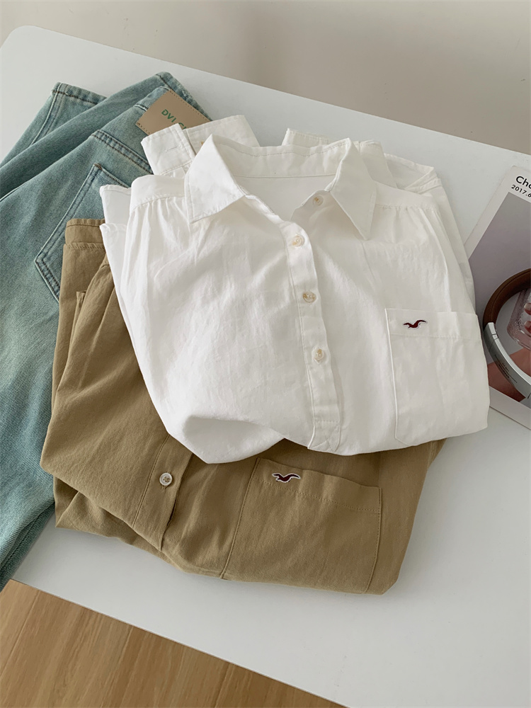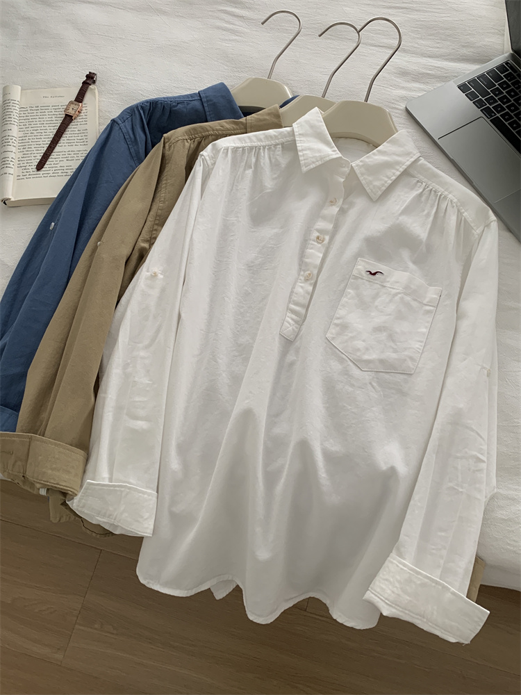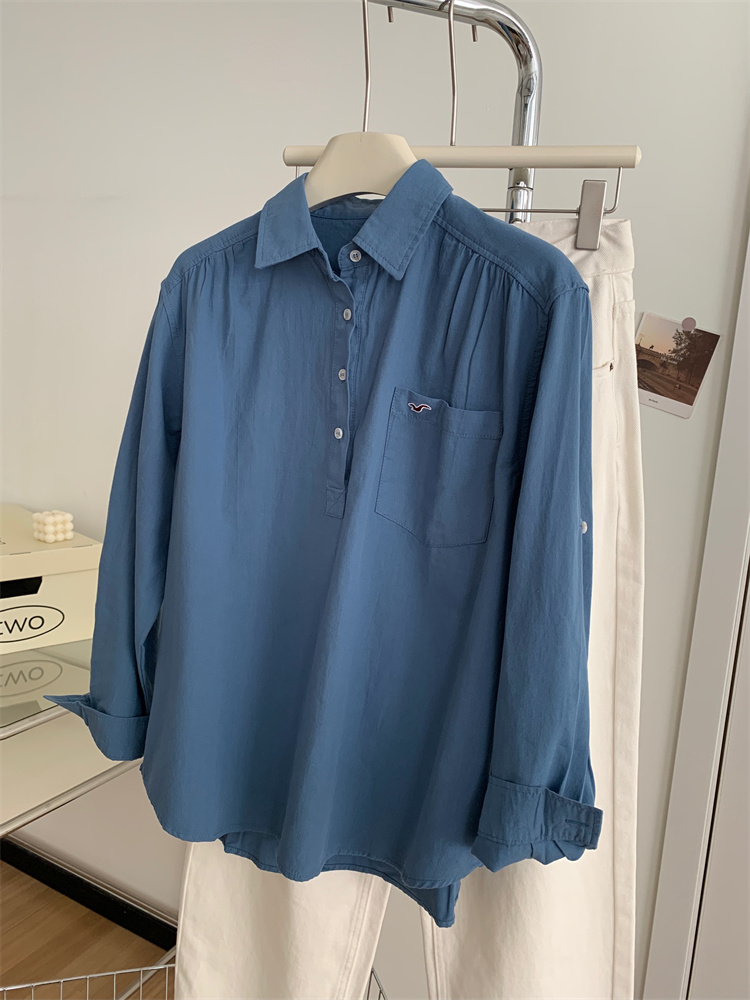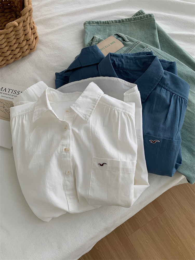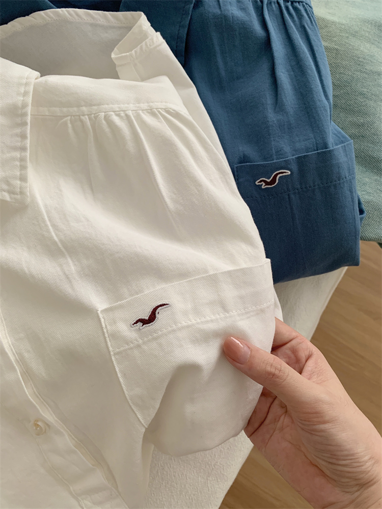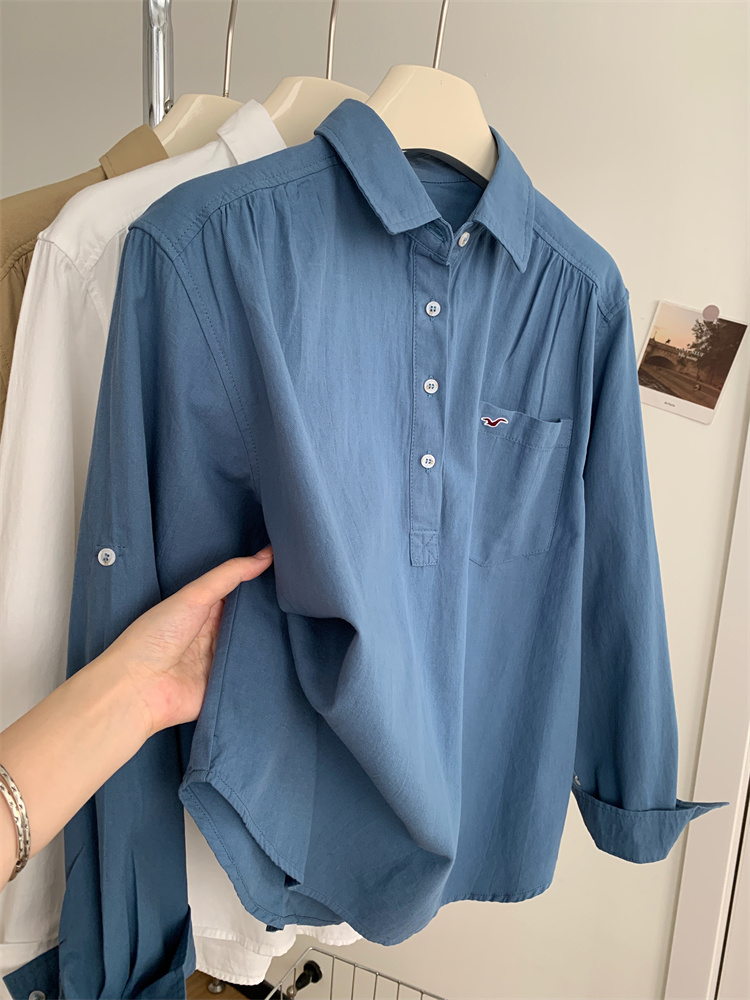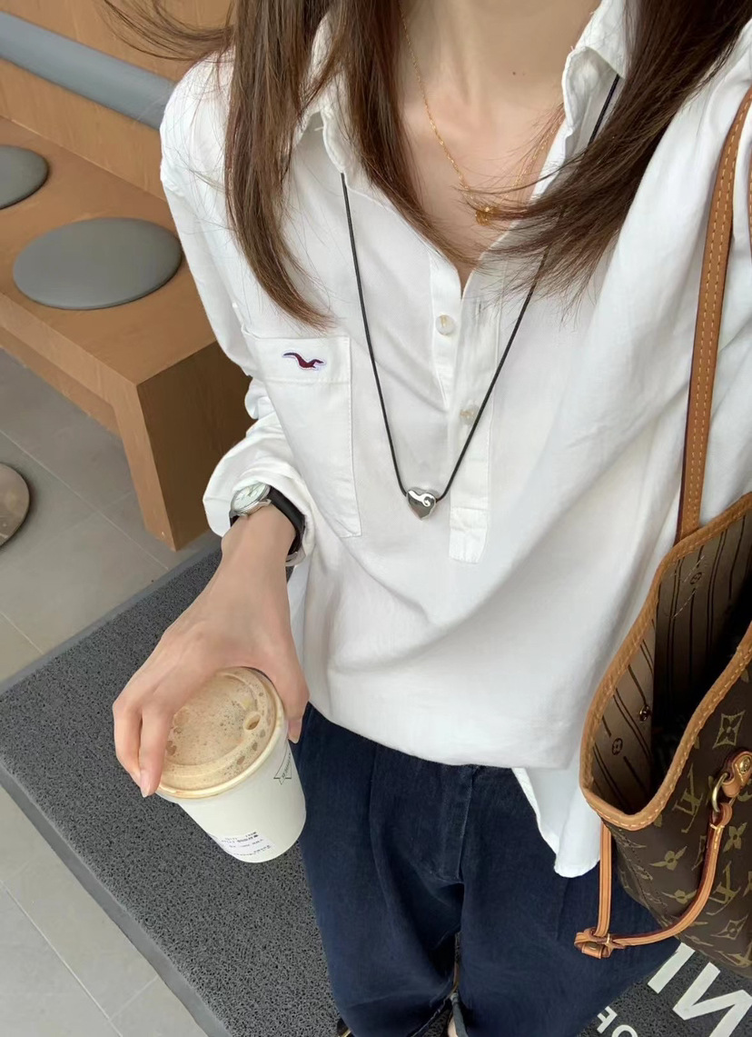 여성용 프렌치 하이엔드 버드 자수 디자인 풀오버 셔츠, 하프 플래킷, 2025 가을 스타일, 워싱 코튼 풀오버 셔츠스토어 가기