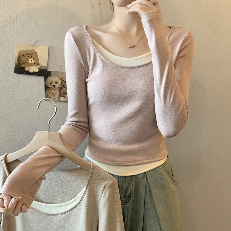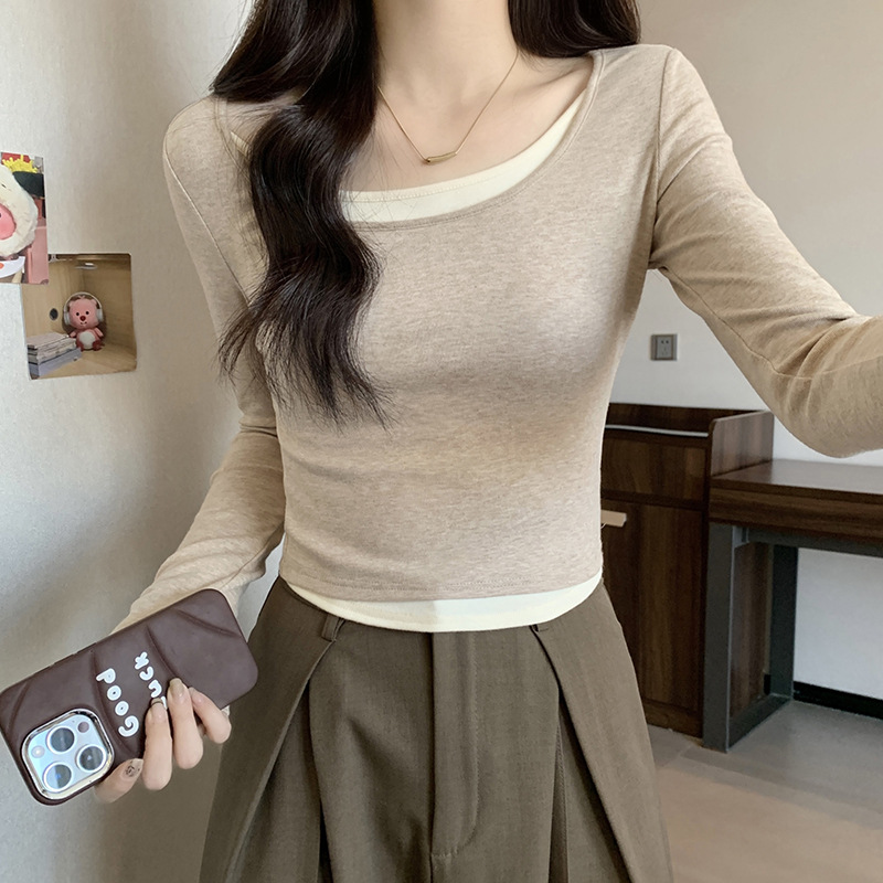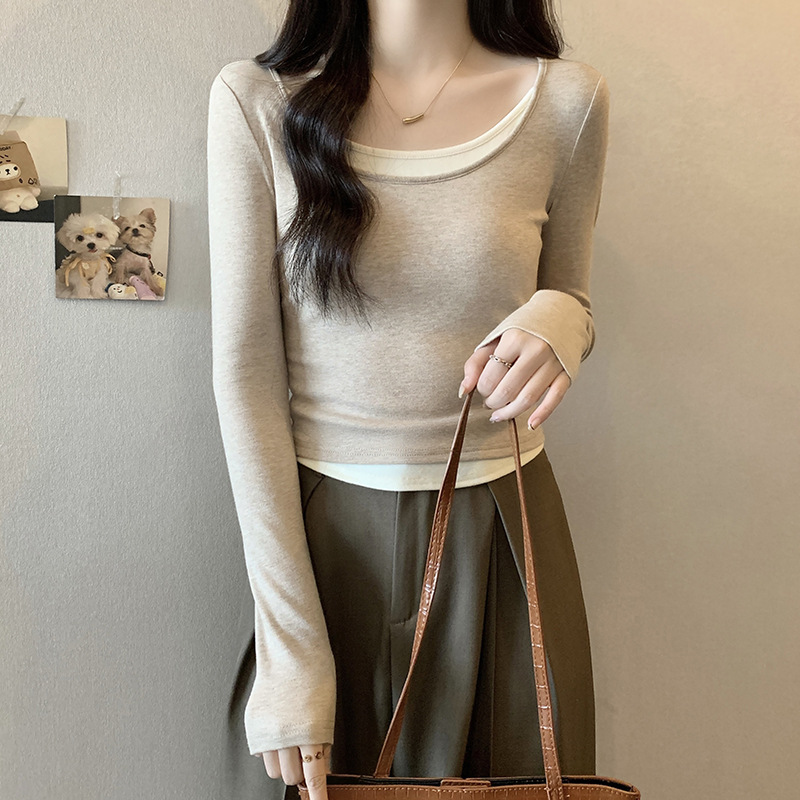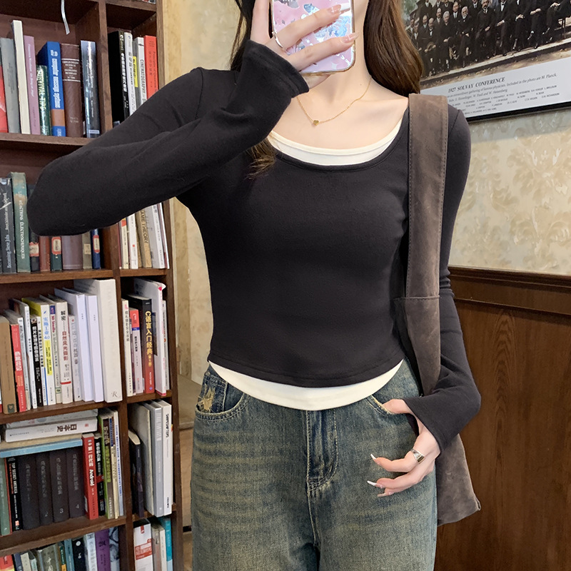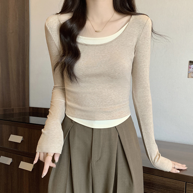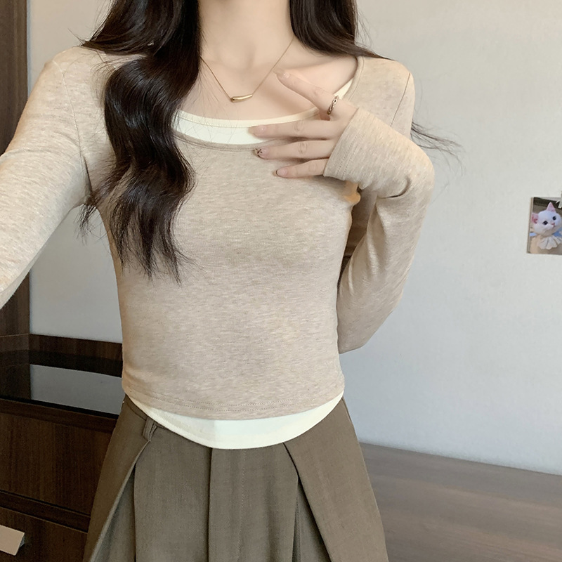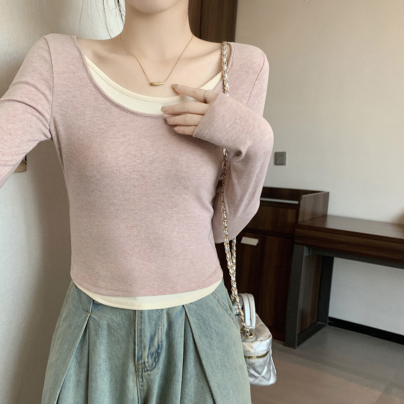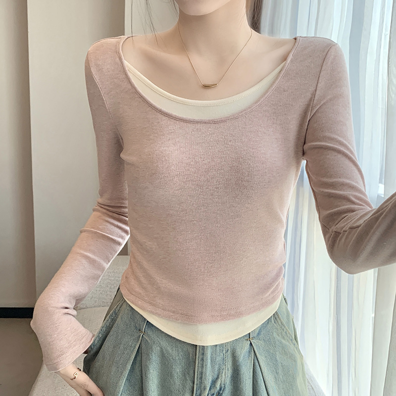 2024 년 가을 새로운 여성 의류 한국식 어깨 가짜 투피스 긴팔 티셔츠 여성용 달콤하고 핫한 슬림 핏 Bottoming Top