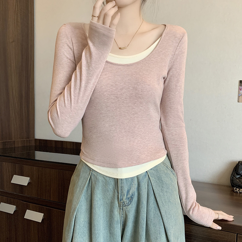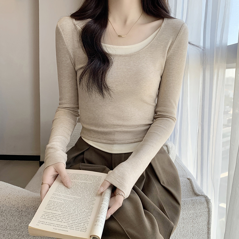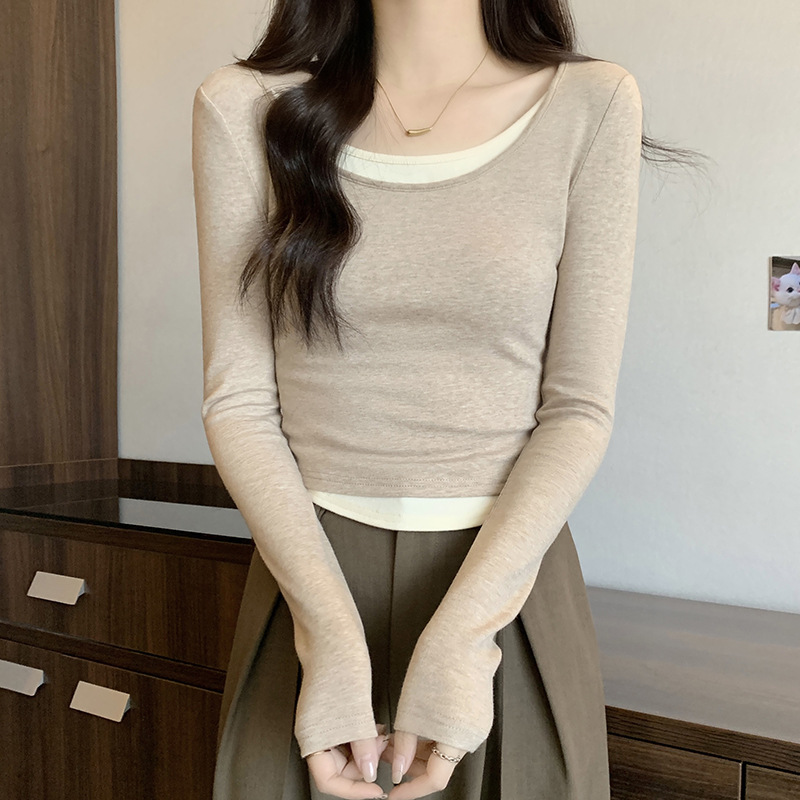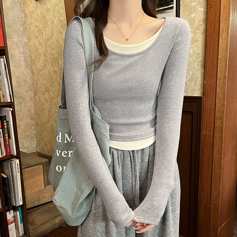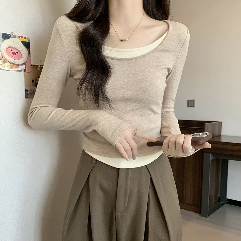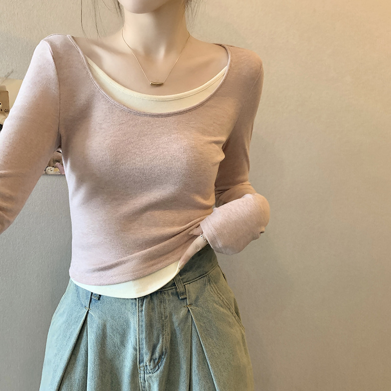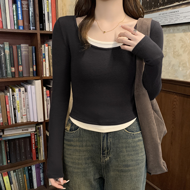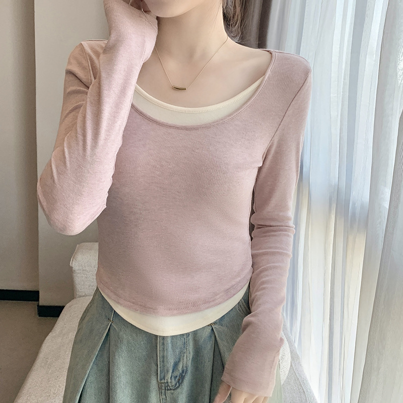 2024 년 가을 새로운 여성 의류 한국식 어깨 가짜 투피스 긴팔 티셔츠 여성용 달콤하고 핫한 슬림 핏 Bottoming Top
